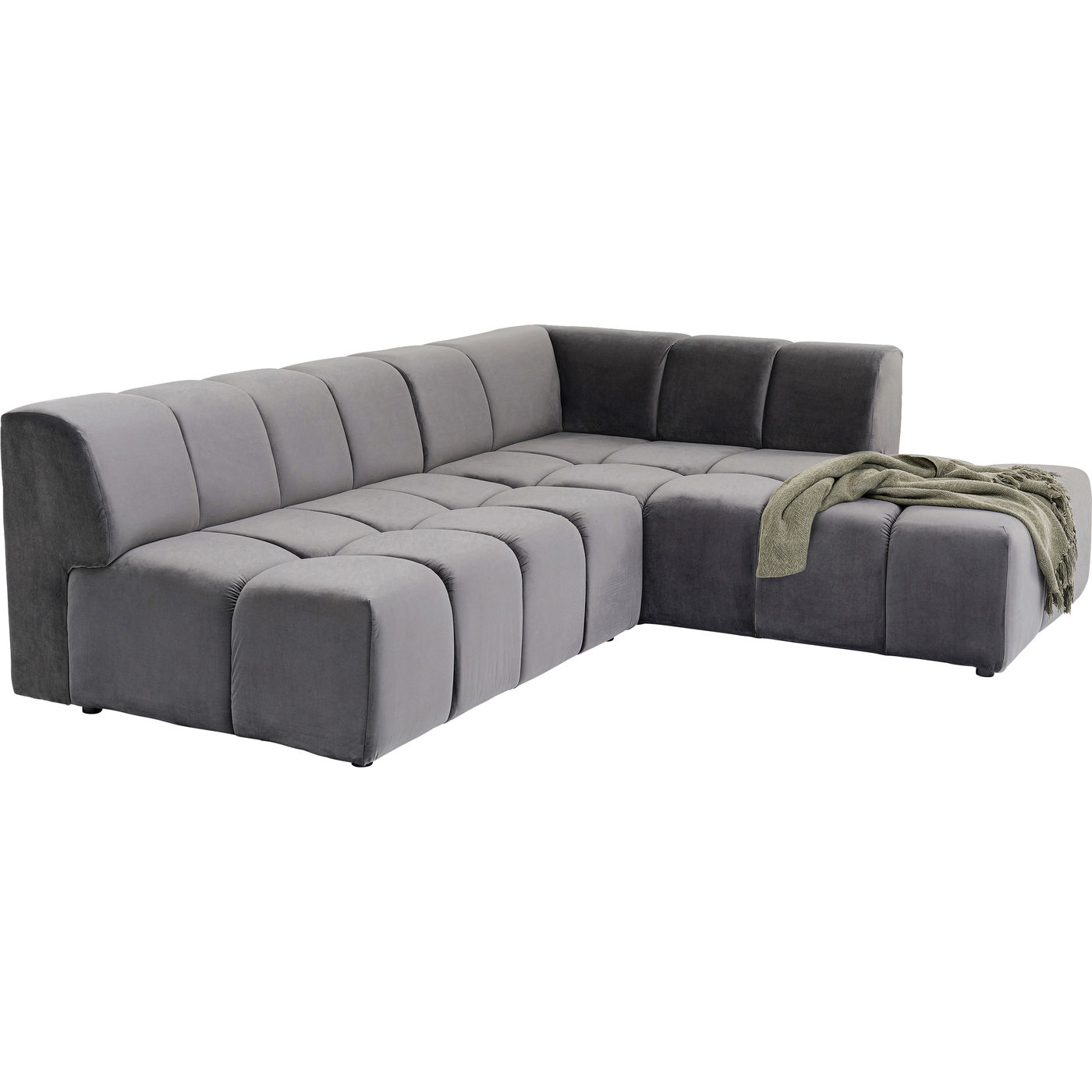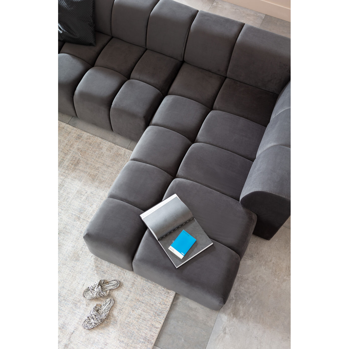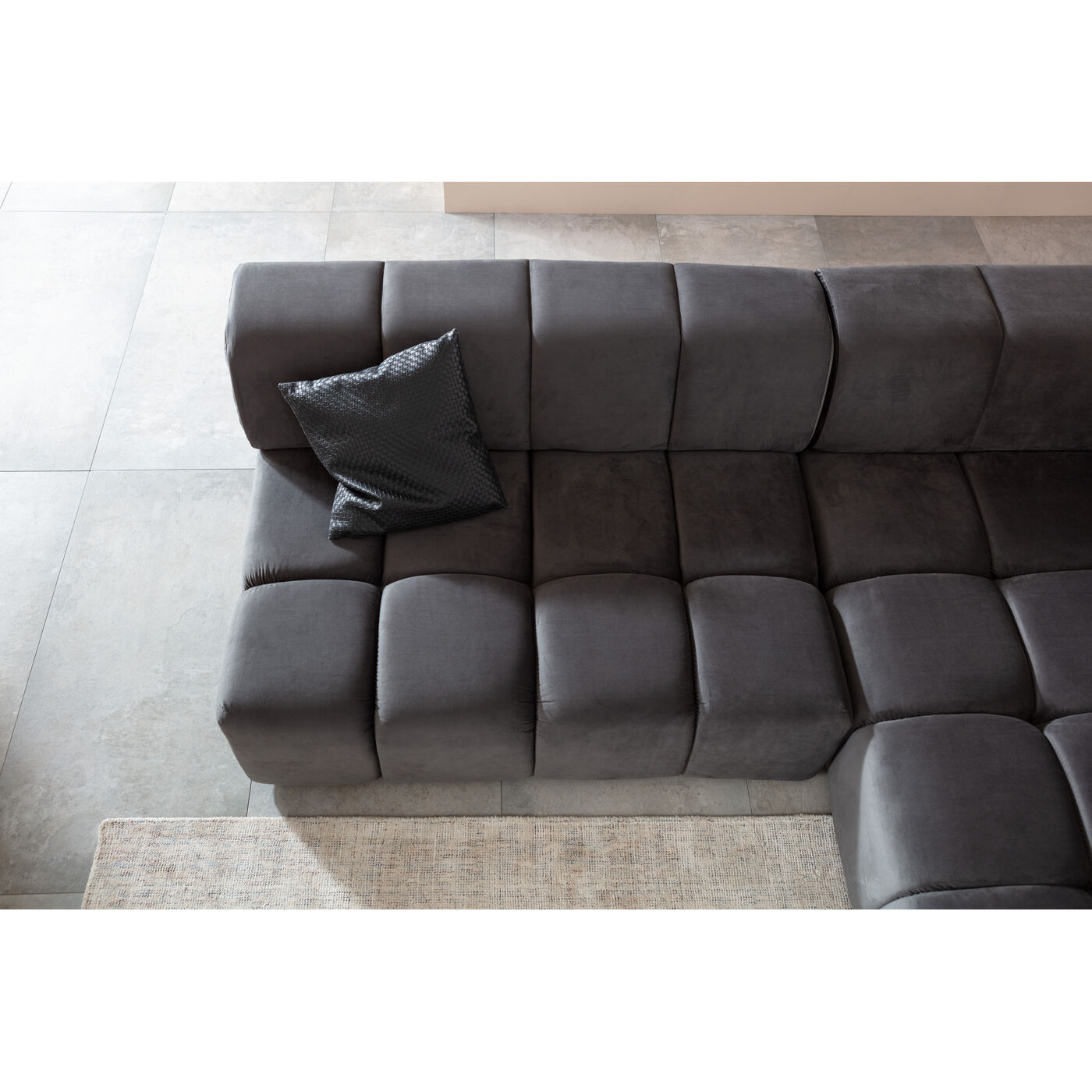 - Graues Ecksofa mit Chaiselongue rechts und einem samtigen Bezug aus pflegeleichter Kunstfaser