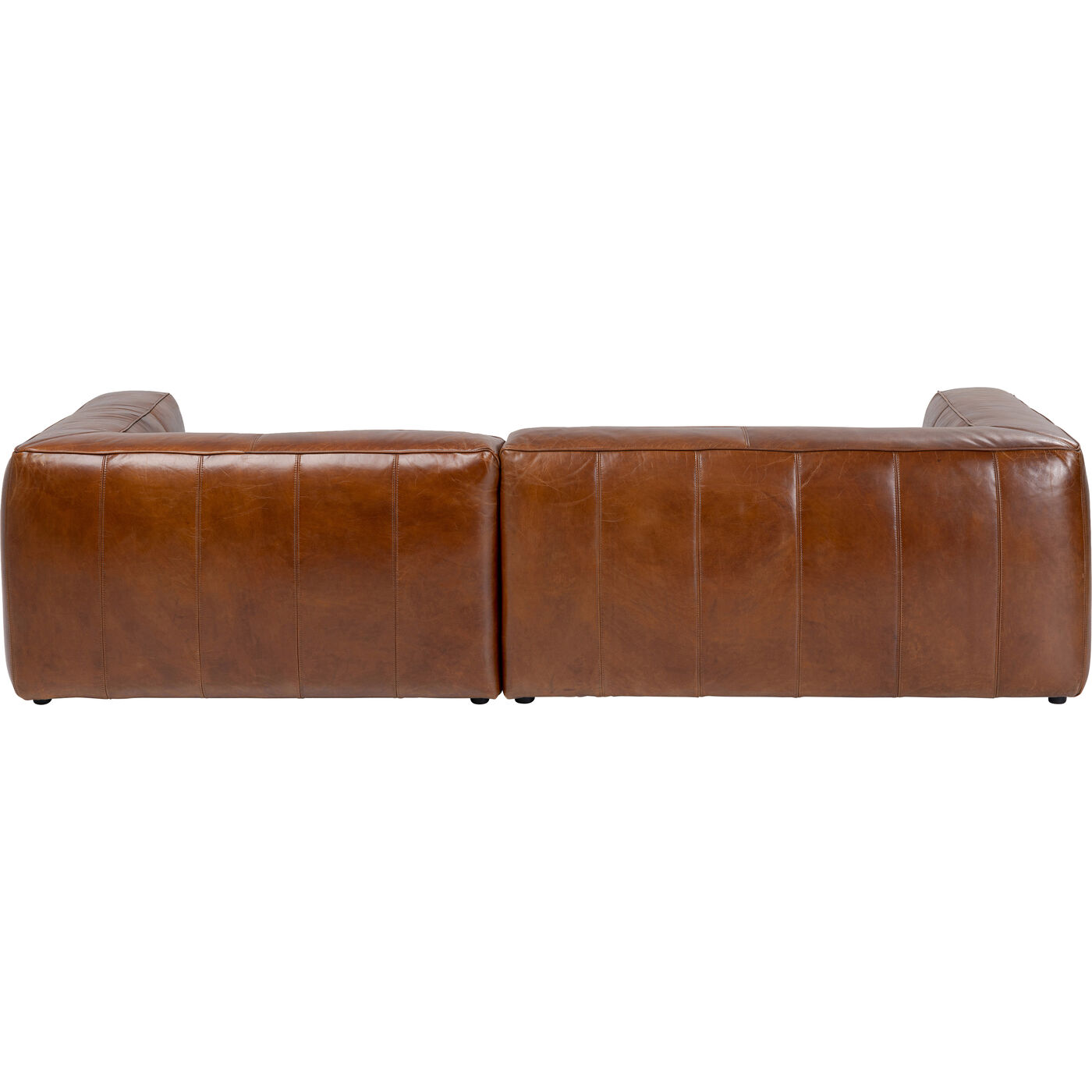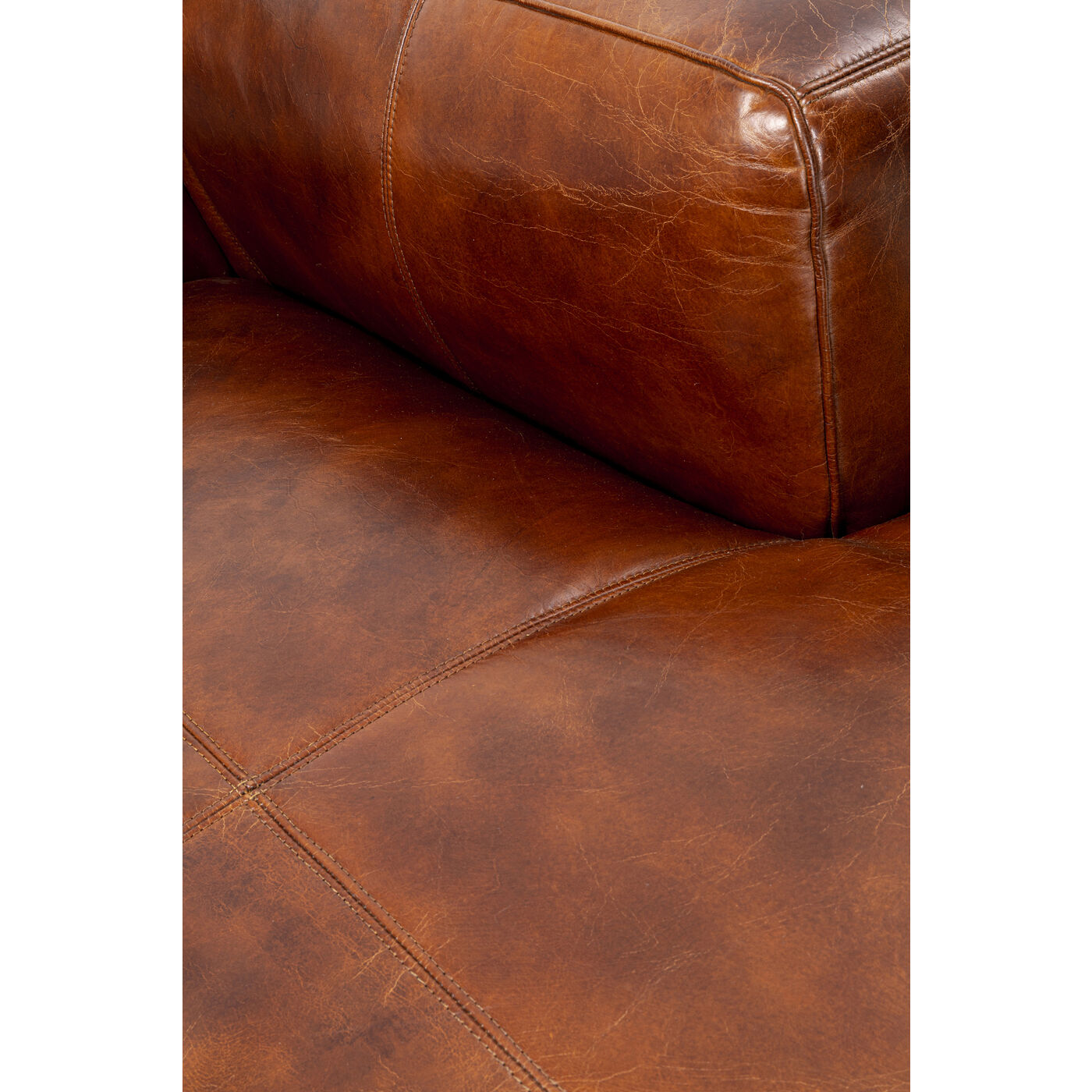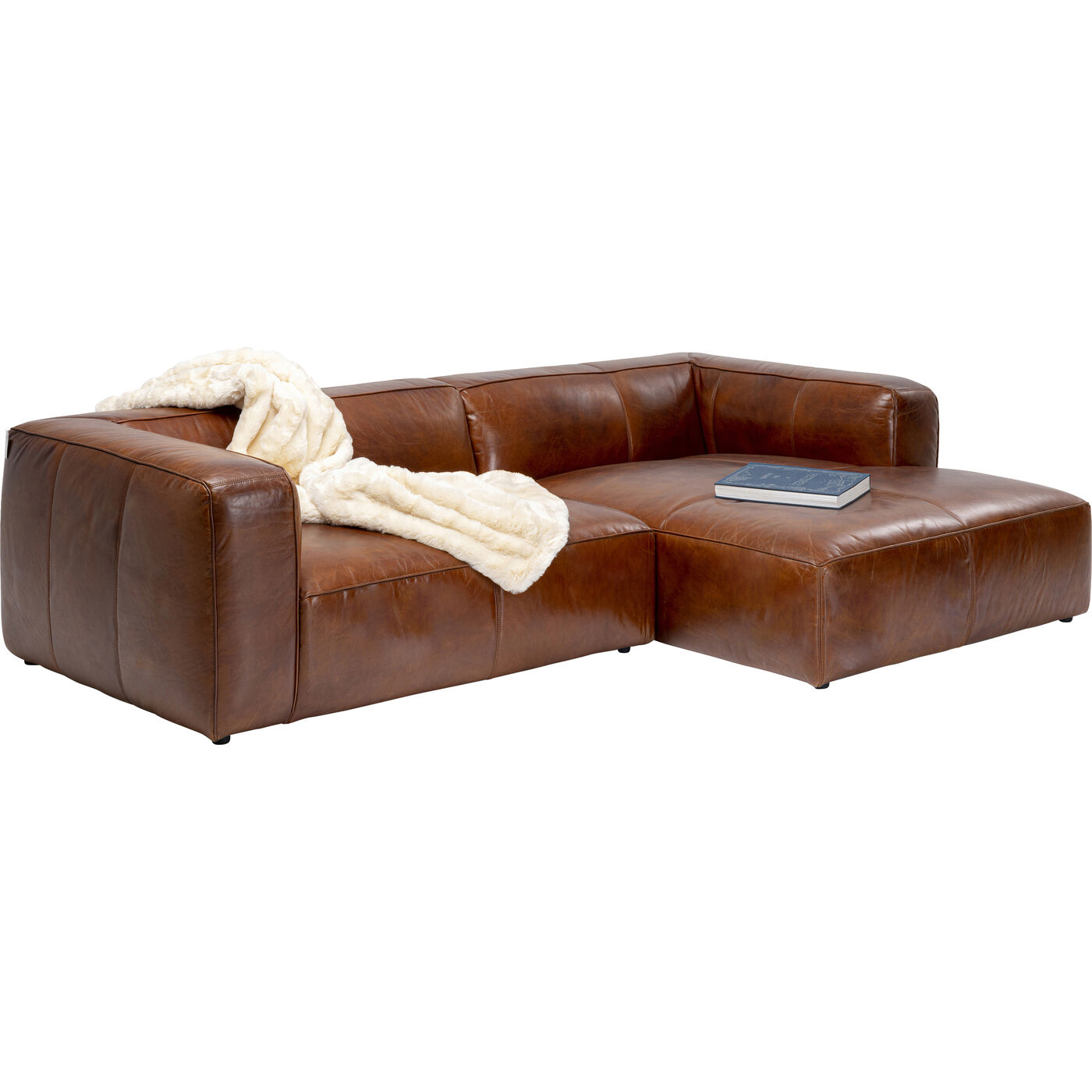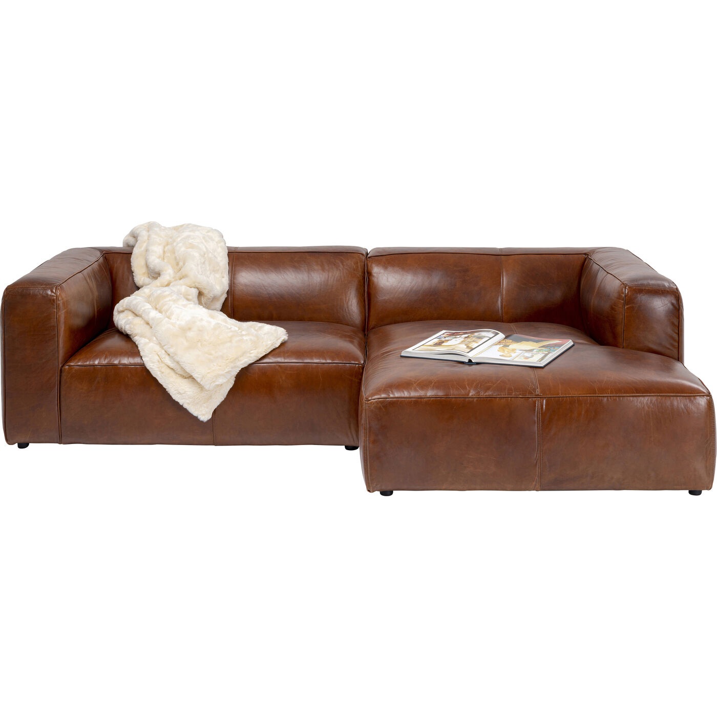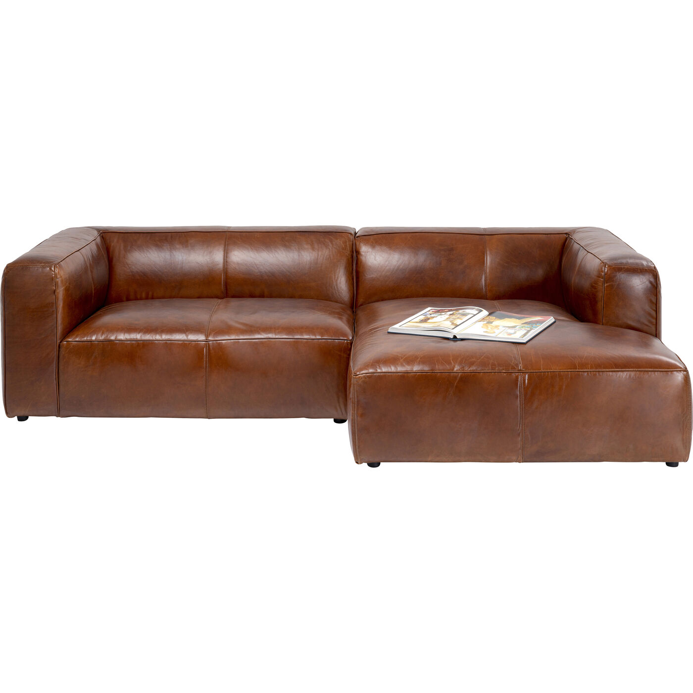 Das Ecksofa bietet dank der großzügige Sitzfläche mit einer Chaiselongue auf der rechten Seite mehr als genug Platz zum Relaxen. Auch die extra breiten Arm- und Rückenlehnen sorgen für Sitzkomfort. Das edle Ledersofa begeistert aber vor allem durch seine kubische klare Form in Kombination mit dem hochwertigen Rindsleder im warmen Braunton. Sie können die Couch daher als gemütlichen Rückzugsort im Loungebereich genauso wie im ländlich eingerichteten Wohnzimmer mit einem Couchtisch aus Holz stilvoll platzieren.
