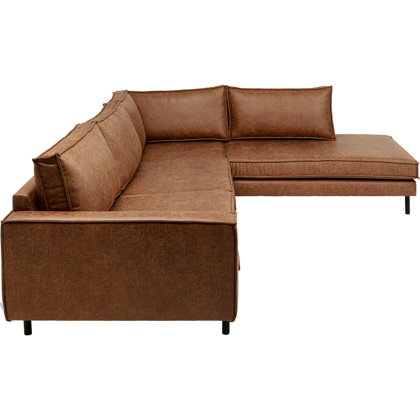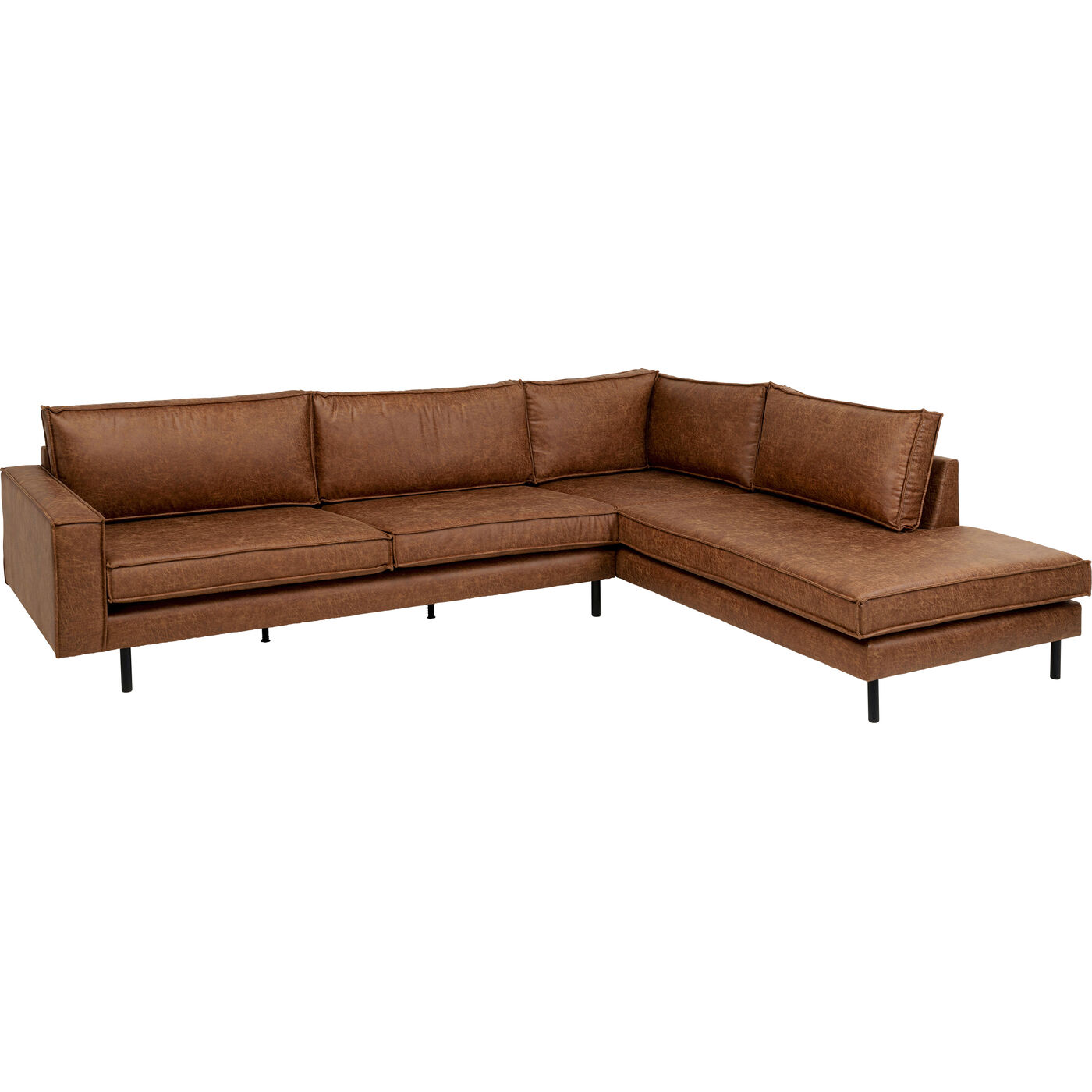 Ein echtes Statement für jedes Wohnzimmer: Dieses braune Eck-Sofa in edler Leder-Optik kombiniert klare Linien mit einer luxuriösen Vintage-Ästhetik. Die großzügige Chaiselongue bietet nicht nur ausreichend Platz für Entspannung, sondern setzt auch einen stilvollen Akzent im Raum. Dank Nosagunterfederung und hochwertiger Schaumpolsterung lässt es sich besonders komfortabel genießen. Die schlanken, schwarzen Stahlfüße verleihen dem Sofa eine filigrane, moderne Ausstrahlung, die mühelos in Industrial, Mid-Century oder Loft-Inneneinrichtungen integriert werden kann. Ein Möbelstück, das sowohl durch sein minimalistisches Design als auch durch seine praktischen Vorzüge überzeugt – perfekt in Kombination mit robusten Holz-Elementen oder klar strukturierten Möbeln.