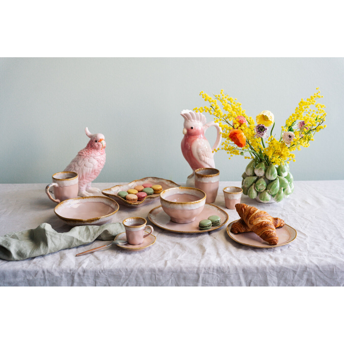 Unsere Geschirrserie Nala verleiht jedem Tisch eine mediterrane Leichtigkeit. Der zarte Rosaton, kombiniert mit warmen Beige- und Weißakzenten, schafft eine harmonische Atmosphäre, die skandinavische, Boho- oder mediterrane Tischarrangements perfekt abrundet. Die organische Form und die strukturierte Oberfläche verleihen jedem Teil eine handgefertigte, einzigartige Ausstrahlung. Ob für ein schönes Frühstück im Garten, ein gemütliches Abendessen mit Freunden oder ein festliches Dinner – das Geschirr sorgt durch seine beruhigenden Farben und Formen für Wohlfühlatmosphäre. Kombiniert mit natürlichen Materialien wie Holz oder Leinen, lässt sich die Serie zu einem modernen, dennoch warmen Setting inszenieren.