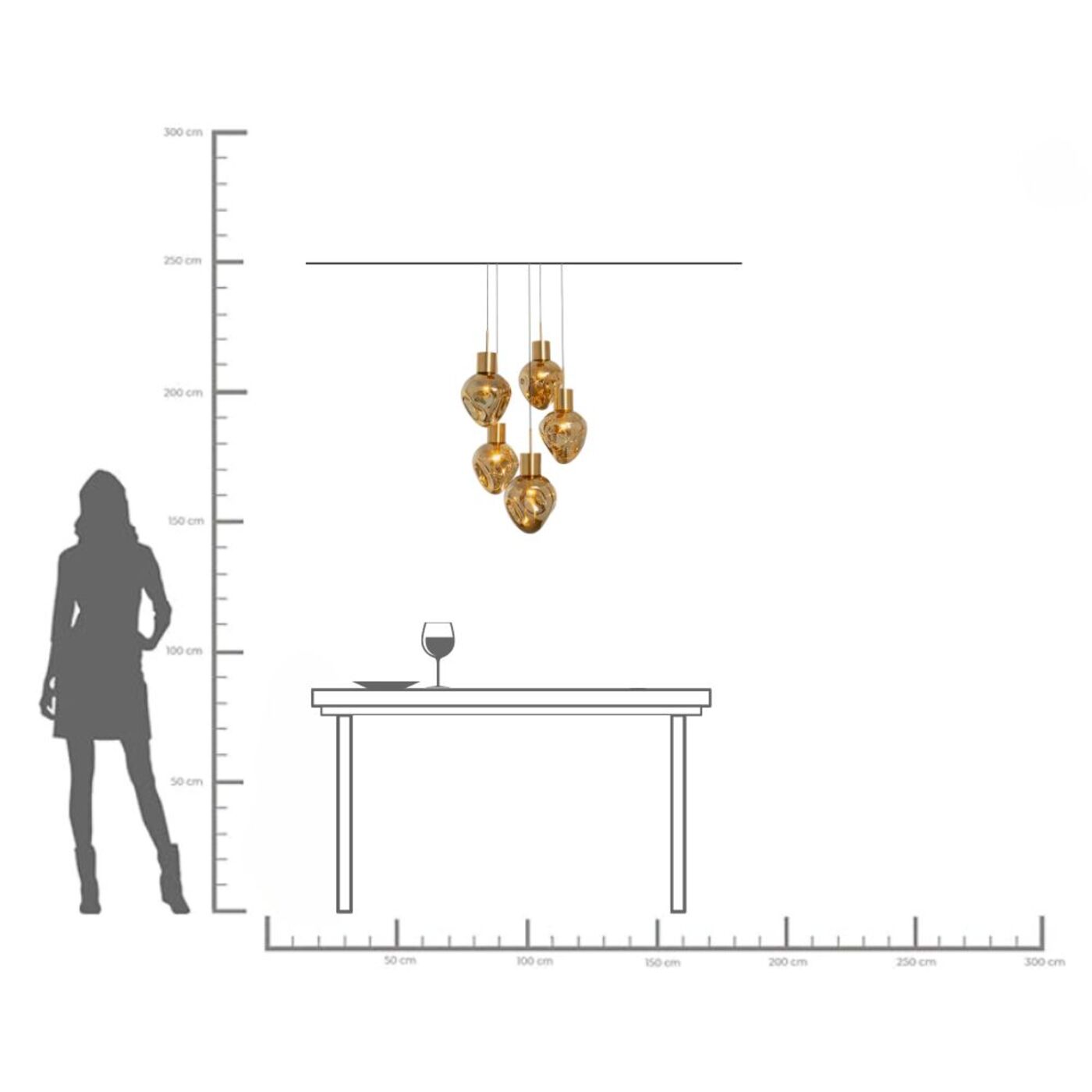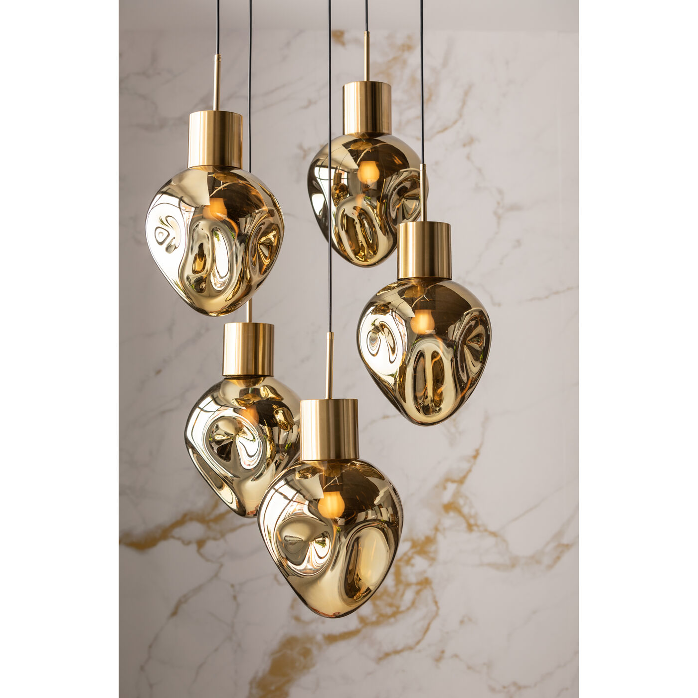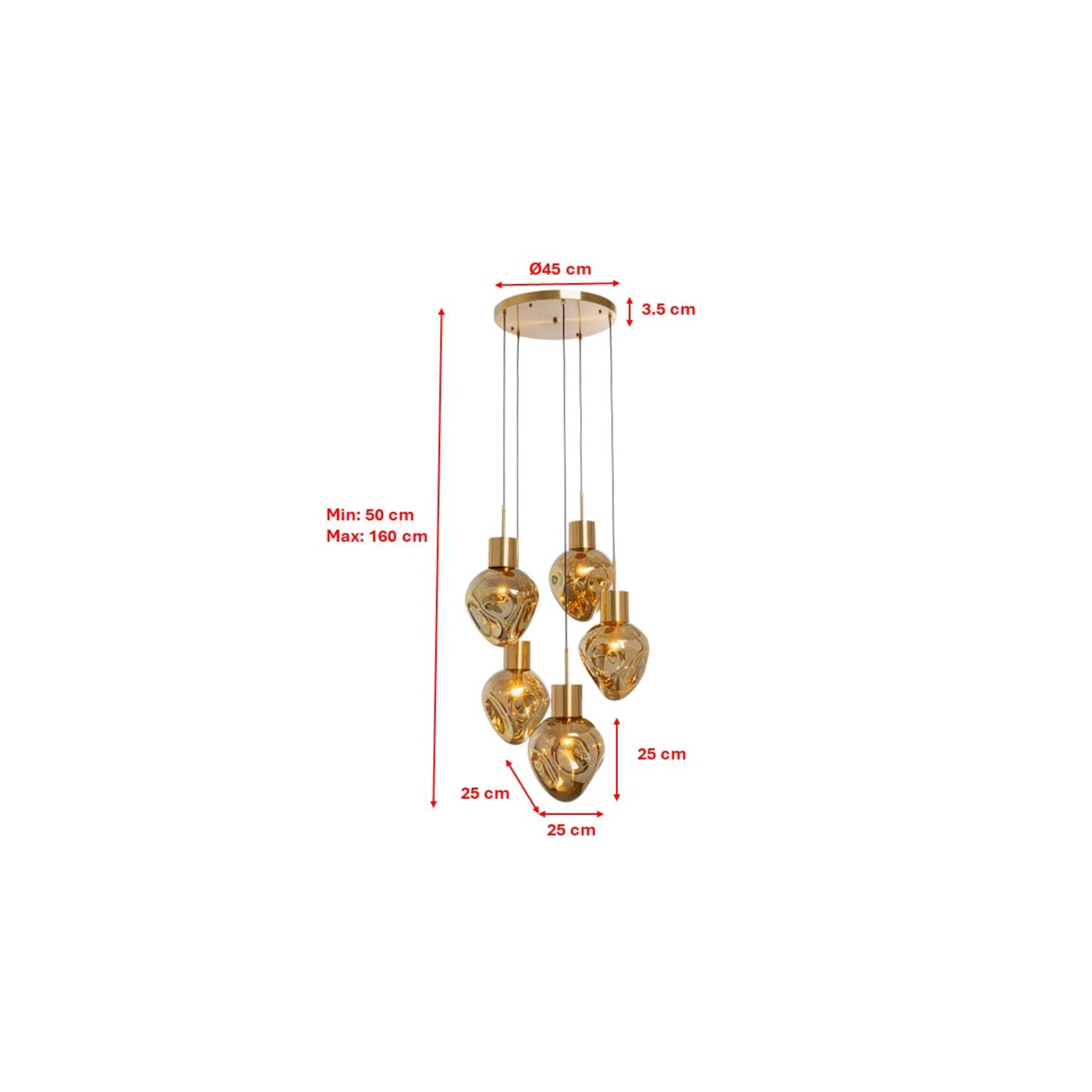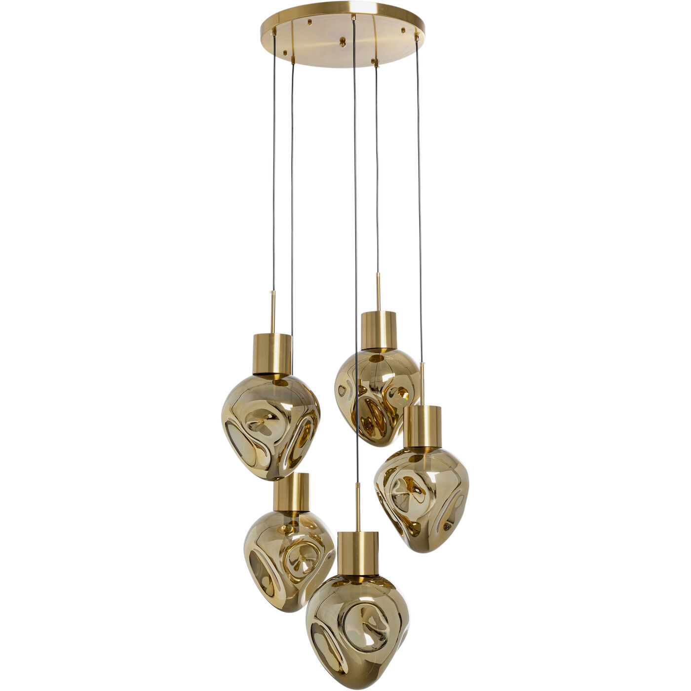 Mit dieser Pendelleuchte bringen Sie nicht nur Licht ins Dunkle, sondern auch Design in Ihr Zuhause. Die organisch geformten Glaskugeln schimmern goldfarben, ihre unregelmäßige Formen wirken skulptural. Da die Hängeleuchte 50 cm tief ist, macht sie auch über kleineren oder runden Esstischen eine gute Figur. 230 V, 50/60 Hz, Fassung E27, Anzahl Leuchtmittel 5, max. 40 Watt, Leuchtmittel nicht inklusive, Leuchtmittel austauschbar