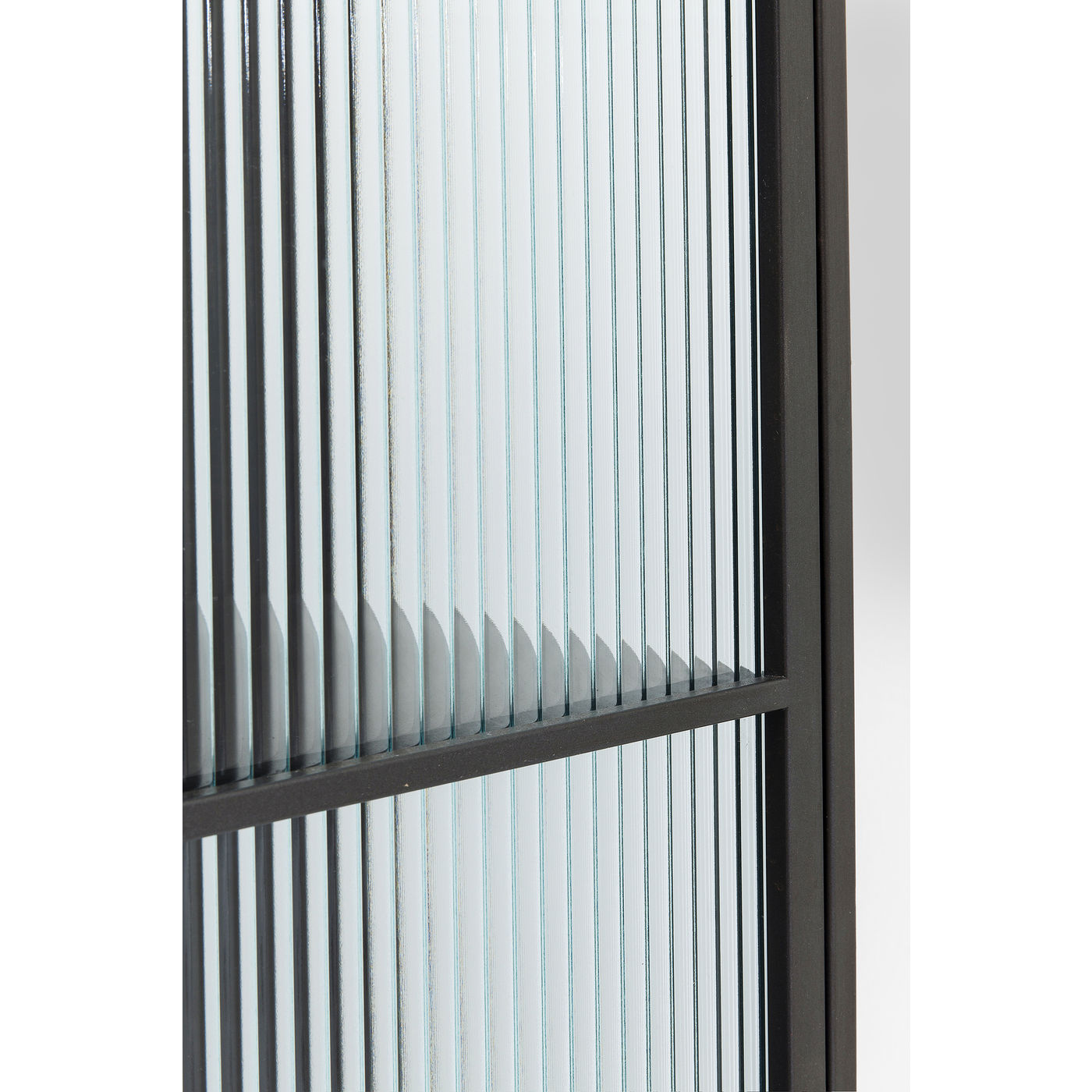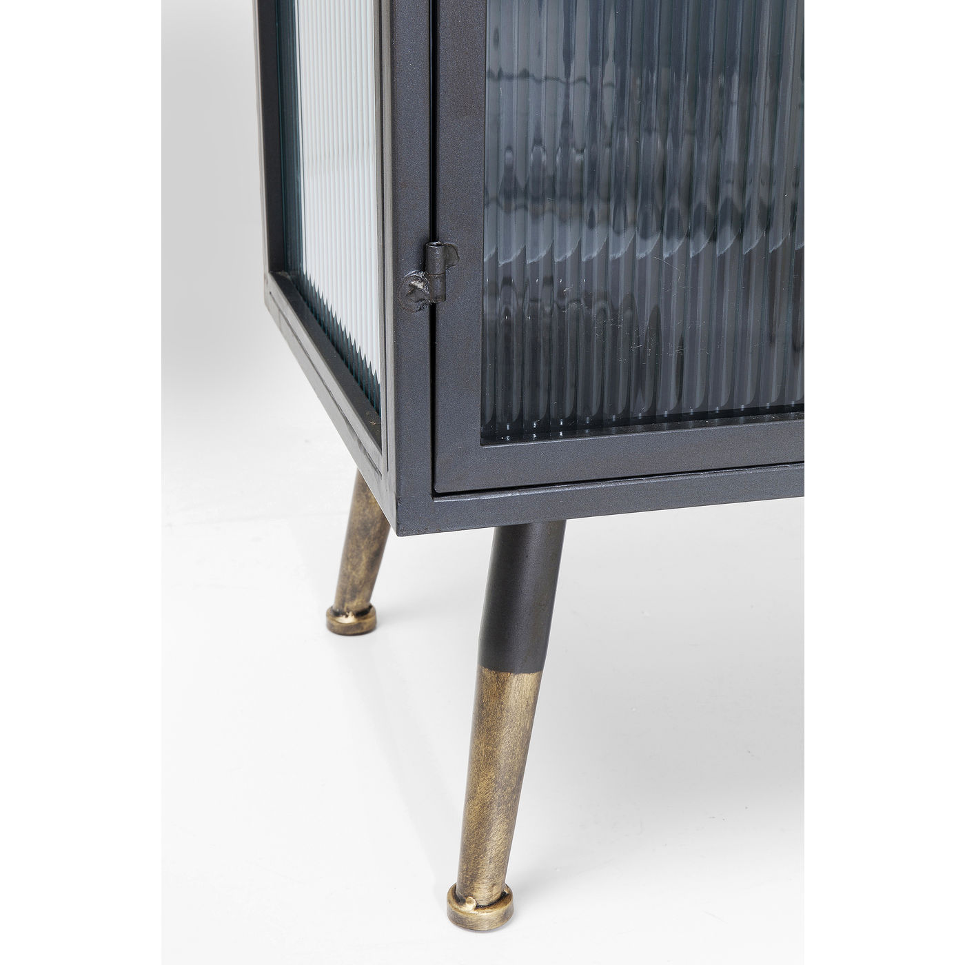 Beschichteter Stahl und Glas – das sind die Zutaten, die den lässigen Look dieses Highboards prägen. Während die Konstruktion des Kabinetts aus Stahl ist, sind Fronten und Seiten aus gerilltem Glas – das gibt dem Möbel eine gewisse Eleganz. Typisch für die Serie La Gomera, zu der verschiedene Schränke und Kommoden gehören, sind neben dem Material-Mix Stahl/Glas die klare Linienführung und die Griffe und leicht ausgestellten Füße mit Messingglanz.