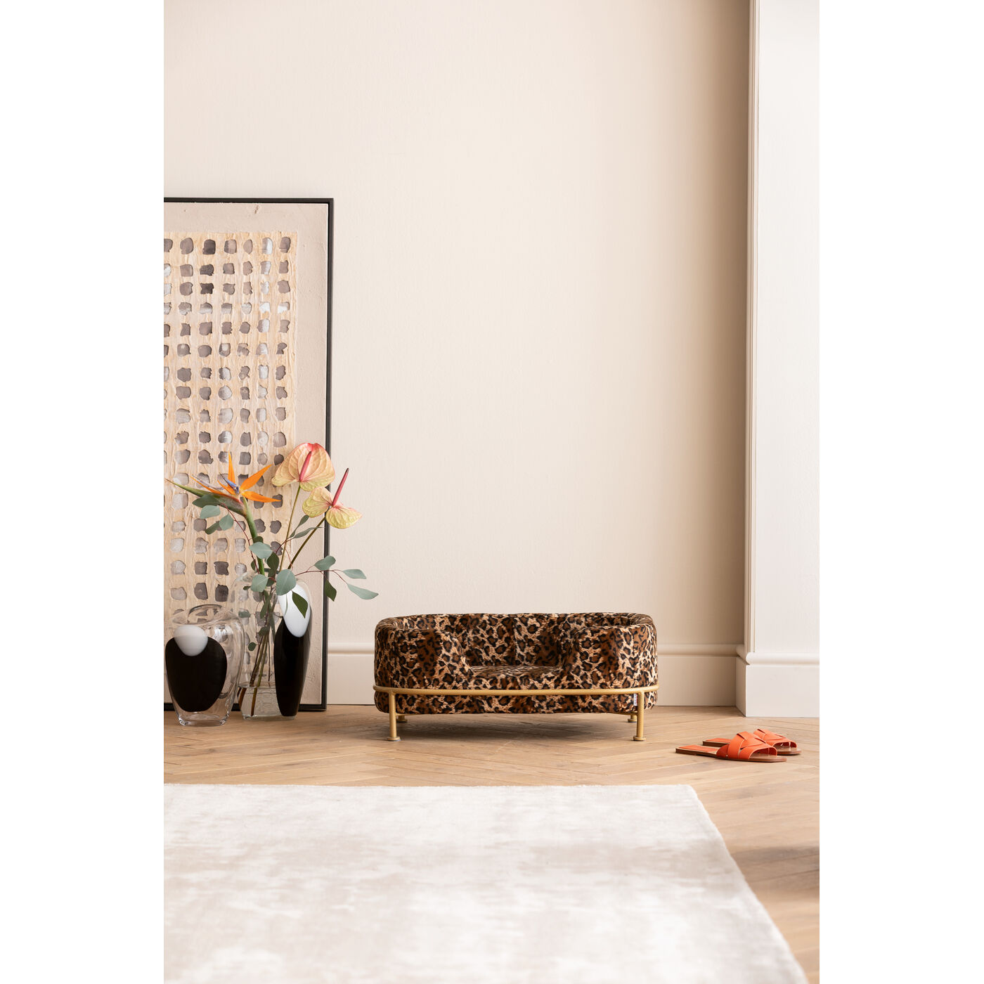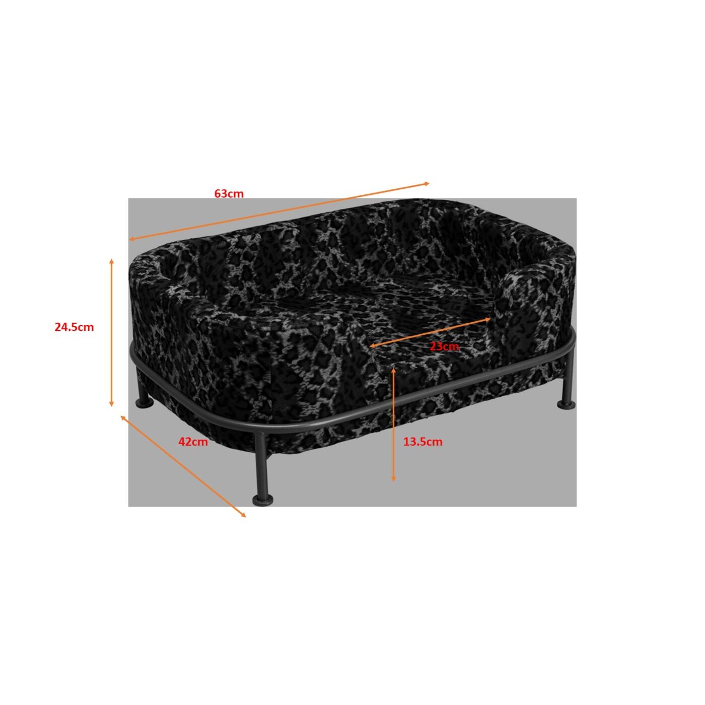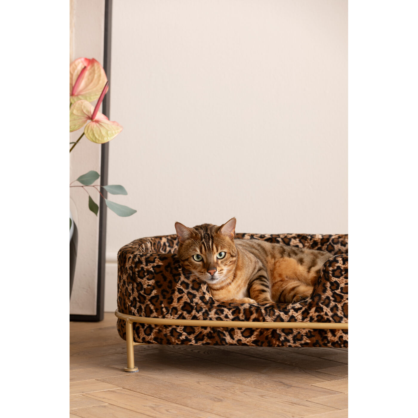 - Hunde- und Katzenbett mit Leo-Print und Gestell aus Metall in Gold, 24.5 x 63 x 44 Zentimeter (H/B/T)
