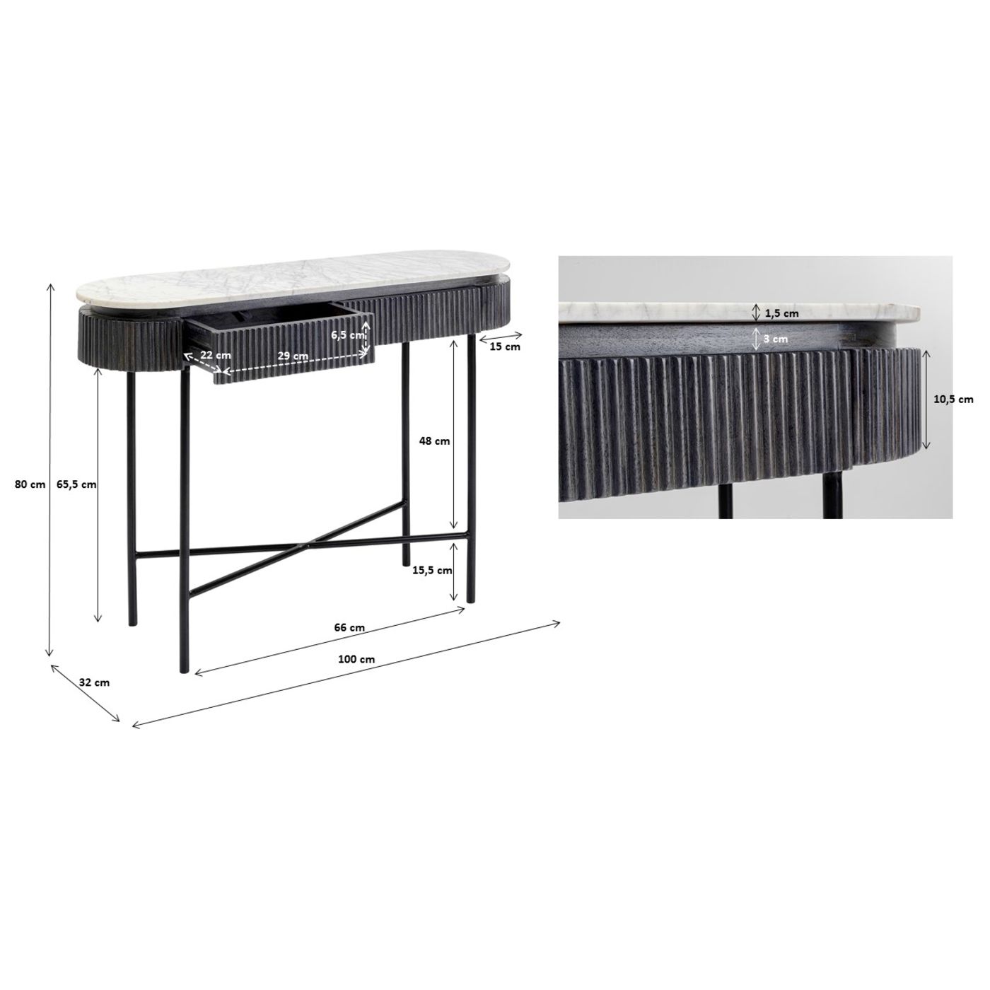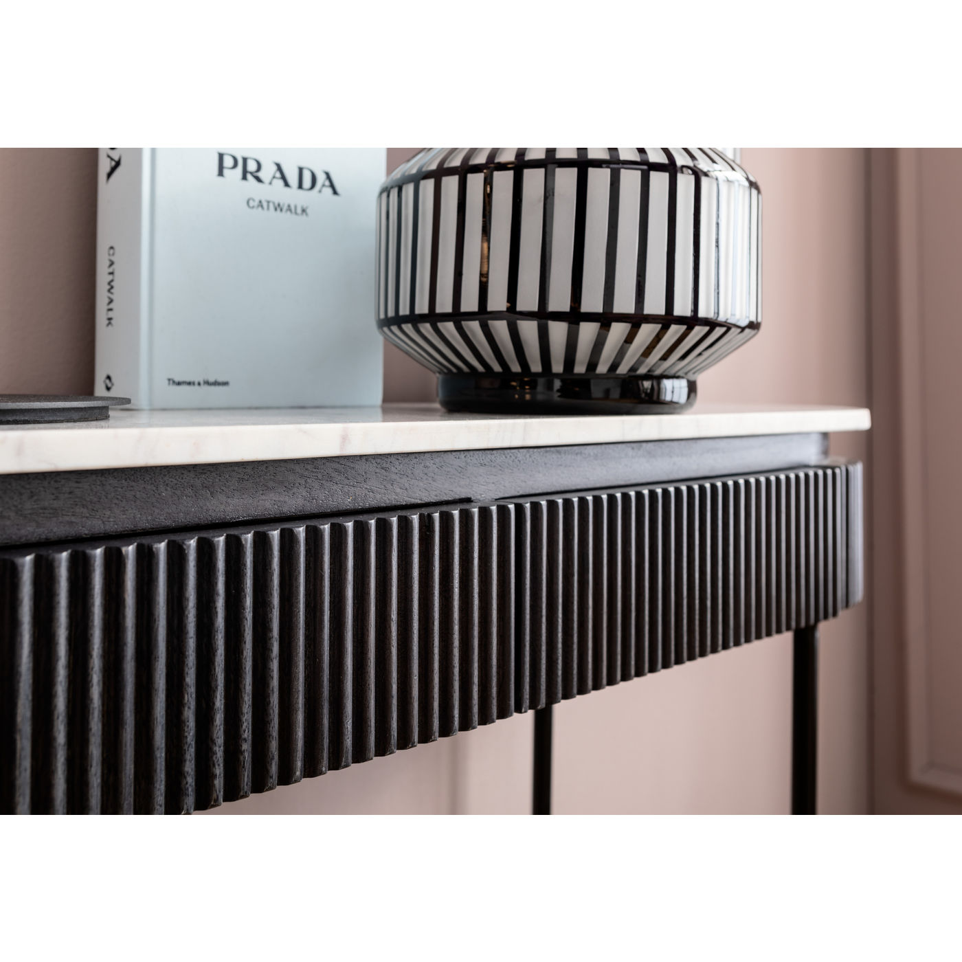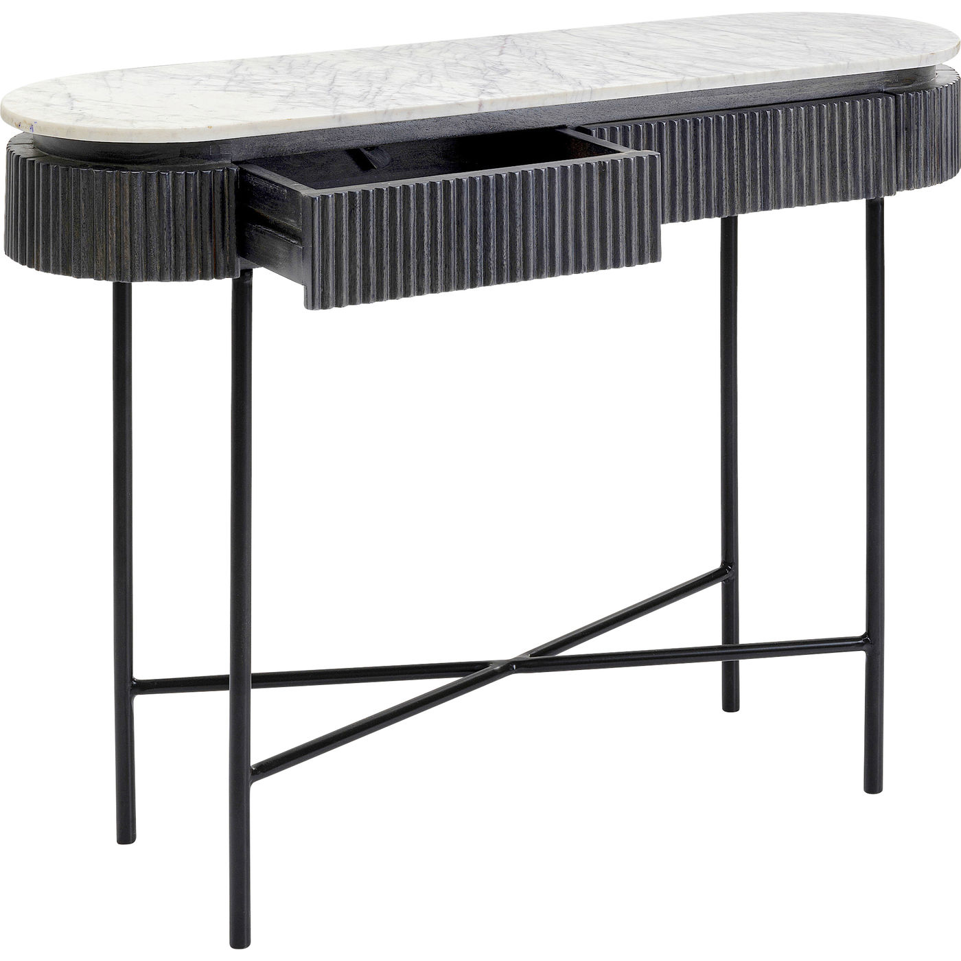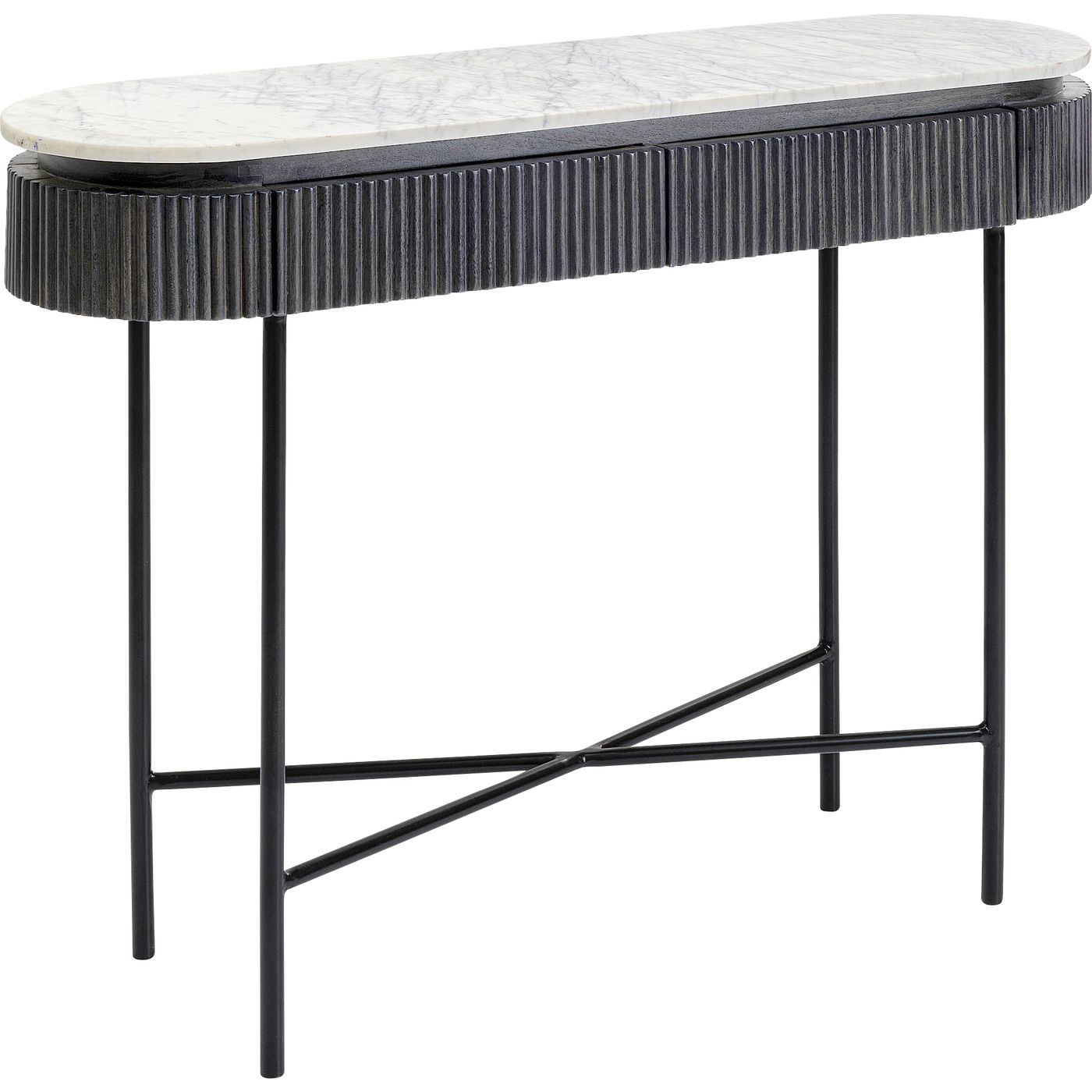 - Spielt mit dem Schwarz-Weiß-Kontrast: elegante Flurkonsole mit heller Marmorplatte und dunkelgrauem Massivholz-Korpus auf filigranem Stahlgestell in Schwarz