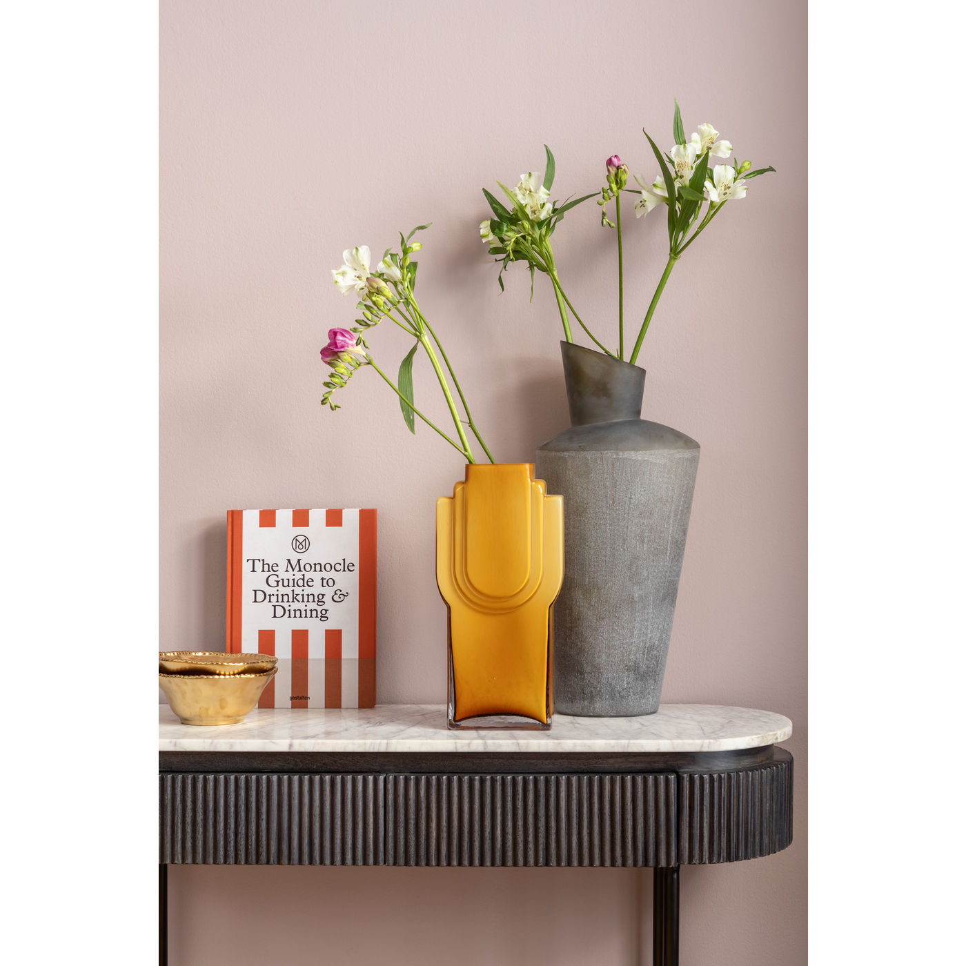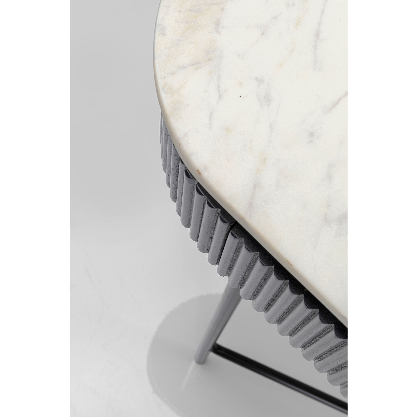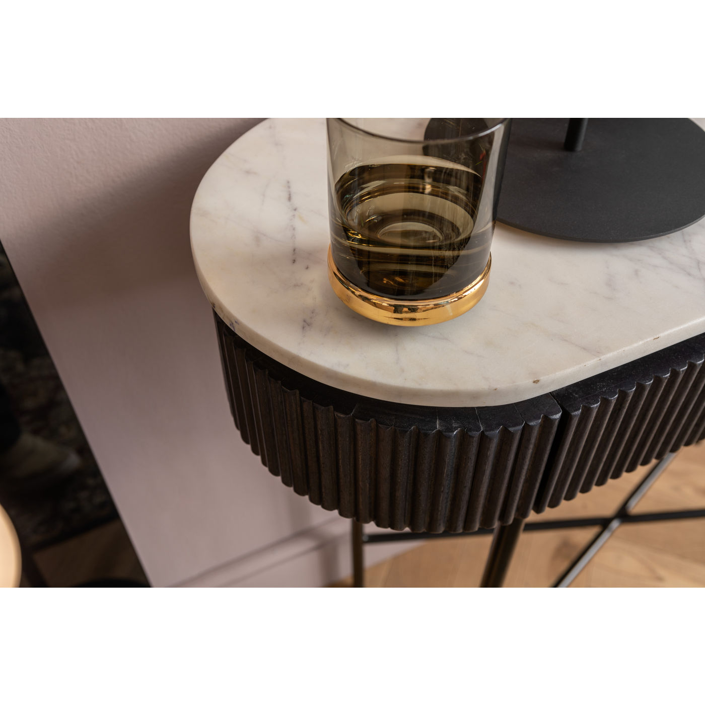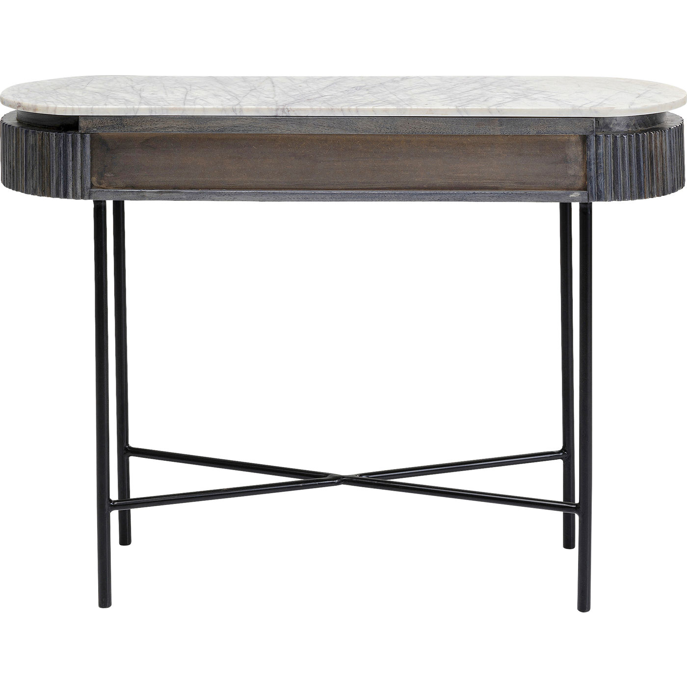 Edel und besonders – diese Flurkonsole will mehr. Die Form: ein flaches Oval, die Abstellfläche aus hellem, echtem Marmor und ein Korpus, der mit dunkelgrauen Fronten und Seiten aus Massivholz in Riffeloptik unter den Konsolentischen heraussticht. Glenn strahlt diskrete Noblesse und zeitlose Eleganz aus und überzeugt durch wertvolle Materialien. Material: (Tischplatte: Marmor, Schubladenkorpus: mitteldichte Faserplatte lackiert, Fuß: Stahl pulverbeschichtet, Schubladenfront: Mango Massivholz lackiert)