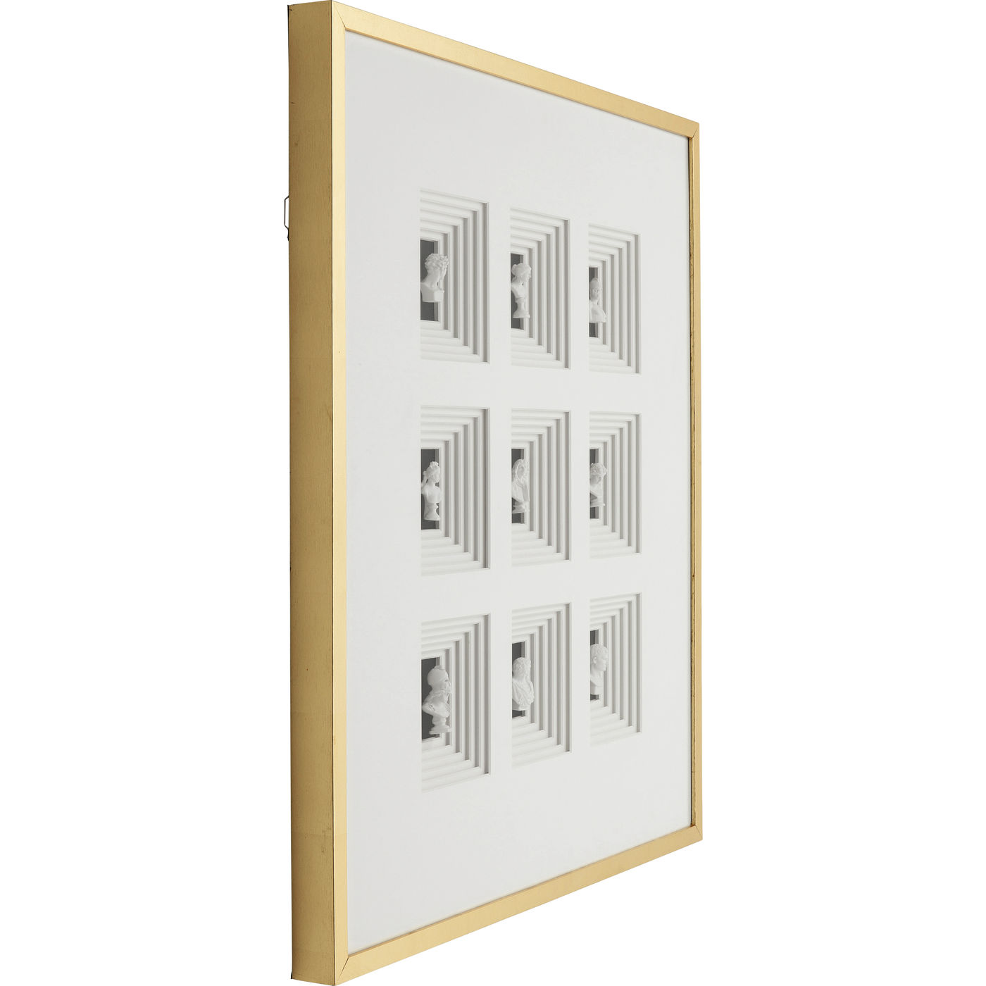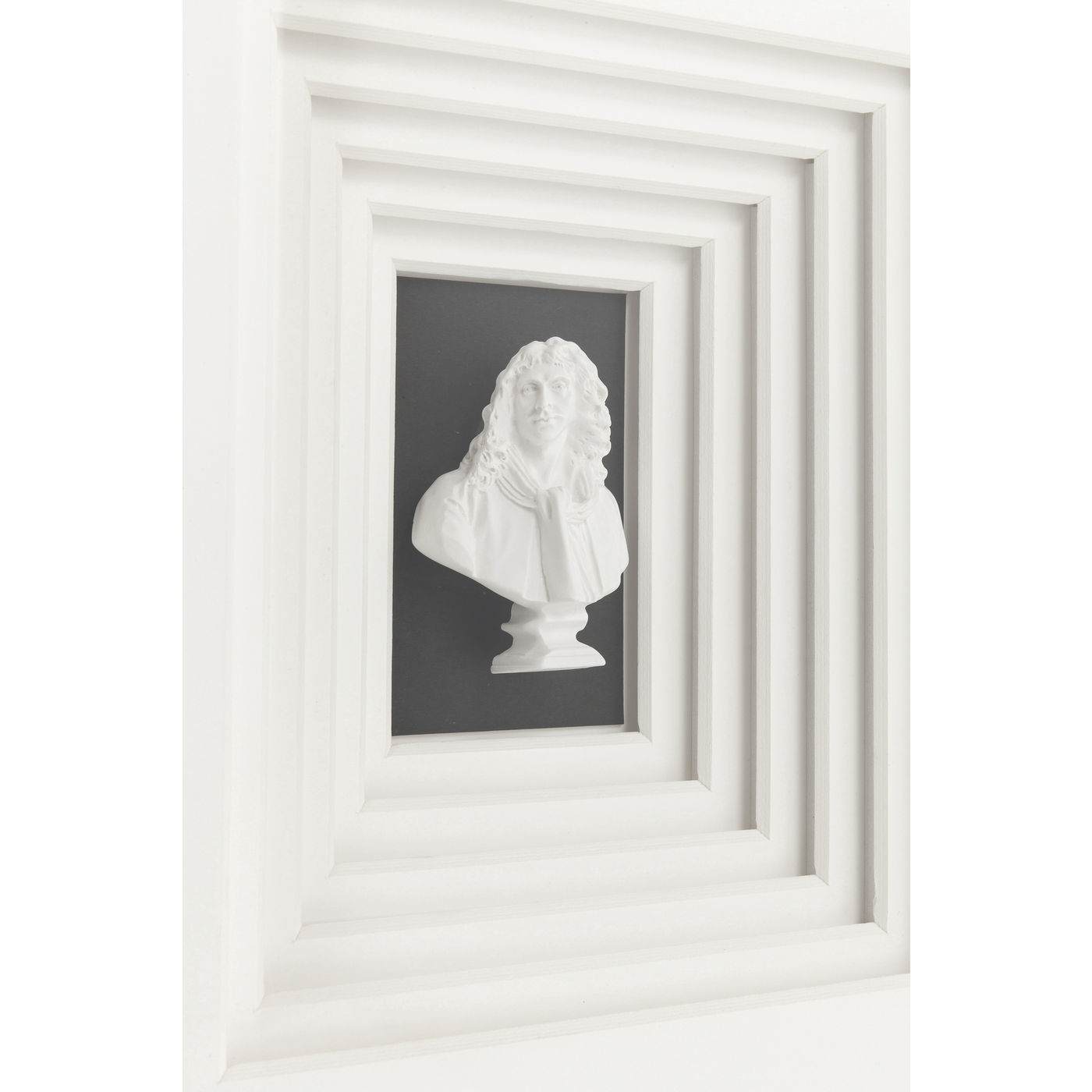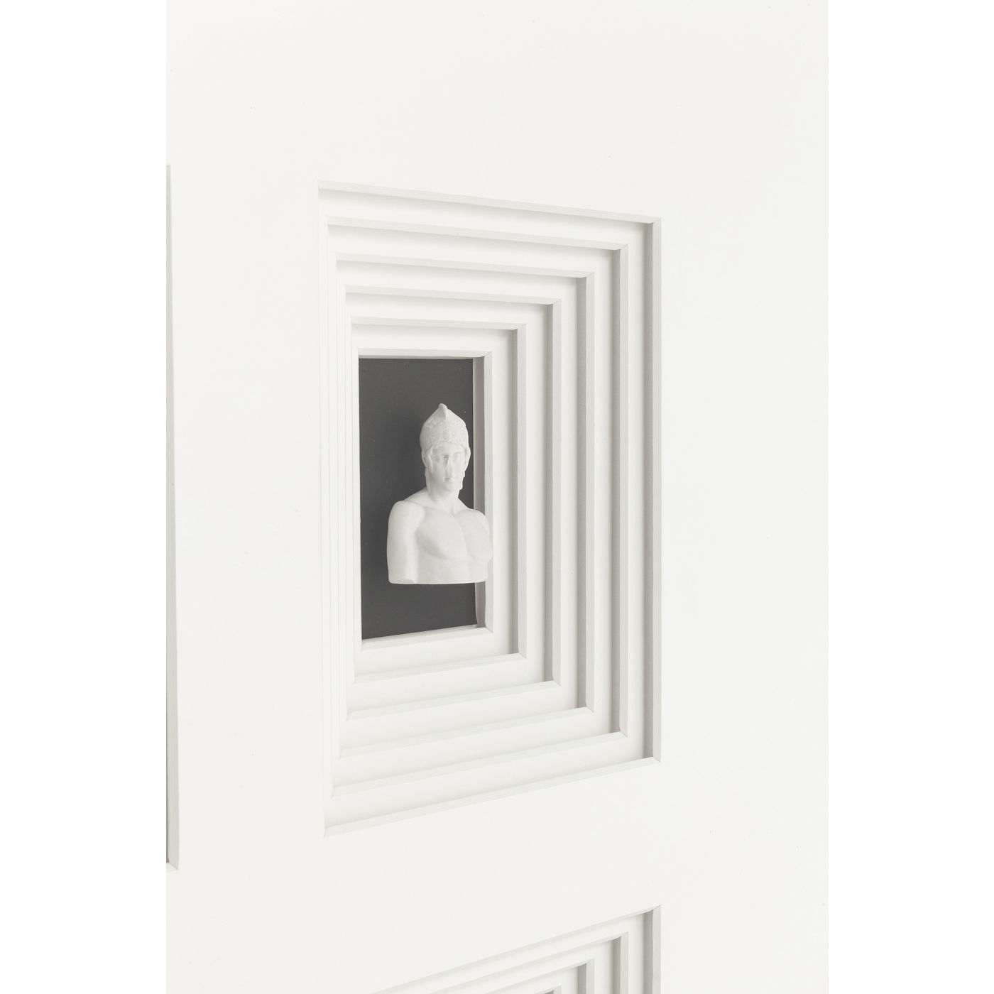 Eine Galerie klassischer Gipsbüsten hinter Glas mit faszinierender Tiefenwirkung – eine wirklich individuelle Wanddekoration. Außergewöhnlich ist die Kombination des klassischen Sujets mit der modernen Darstellungsform. Das beeindruckende, rechteckige Format und die Farbgebung dieses Wandobjekts in Schwarz-Weiß verstärken den Kunstcharakter.für Wandmontage horizontal und vertikalFront: Glas klar, Rahmen: Kiefer Massivholz lackiert, Verzierung: Papier, Polyresin, für Wandmontage horizontal und vertikal