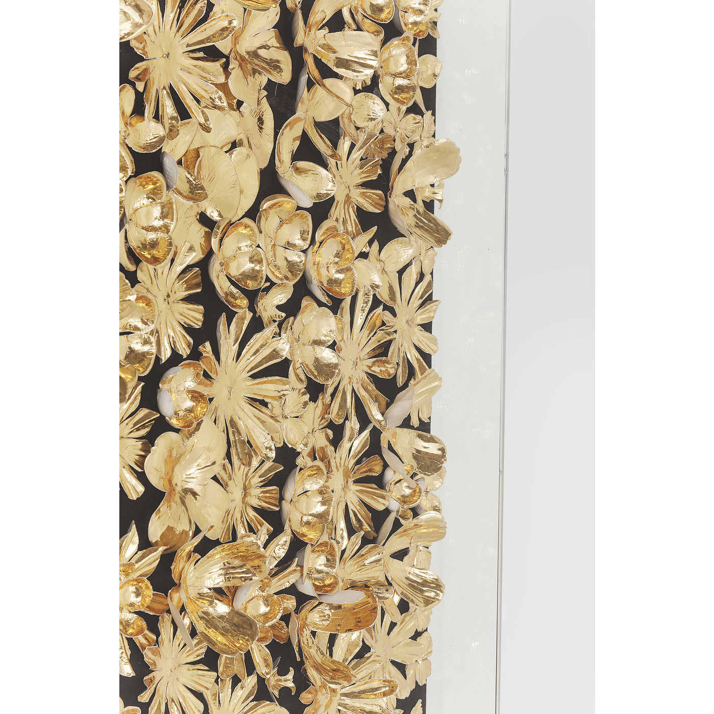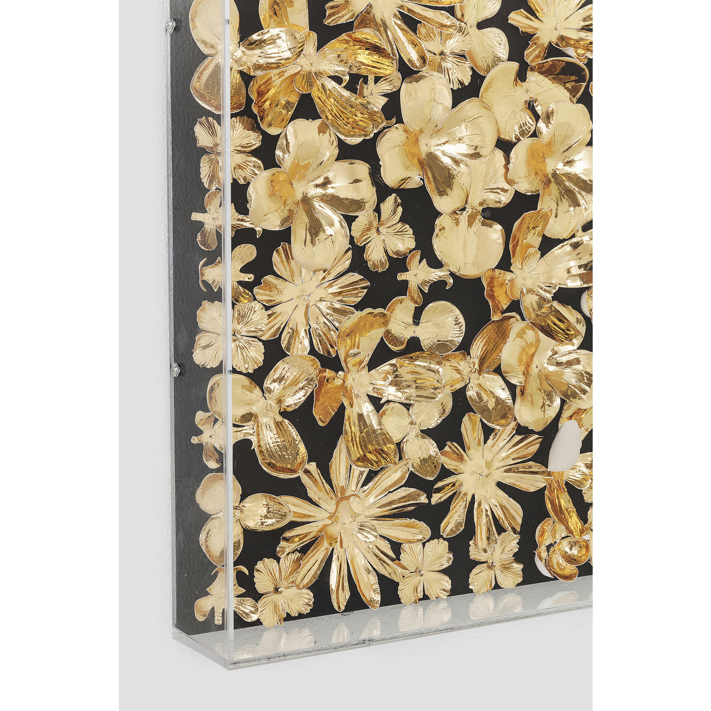 Ein dreidimensionales Kunstwerk für Blumenfans: Dieser Plexiglasrahmen mit goldenen Blüten ist ein großes Statement-Bild für einen Raum. Spannende Interpretation: Die Blüten wirken natürlich und frisch wie eine Sommerwiese, der Goldglanz gibt ihnen einen glamourösen und modernen Touch