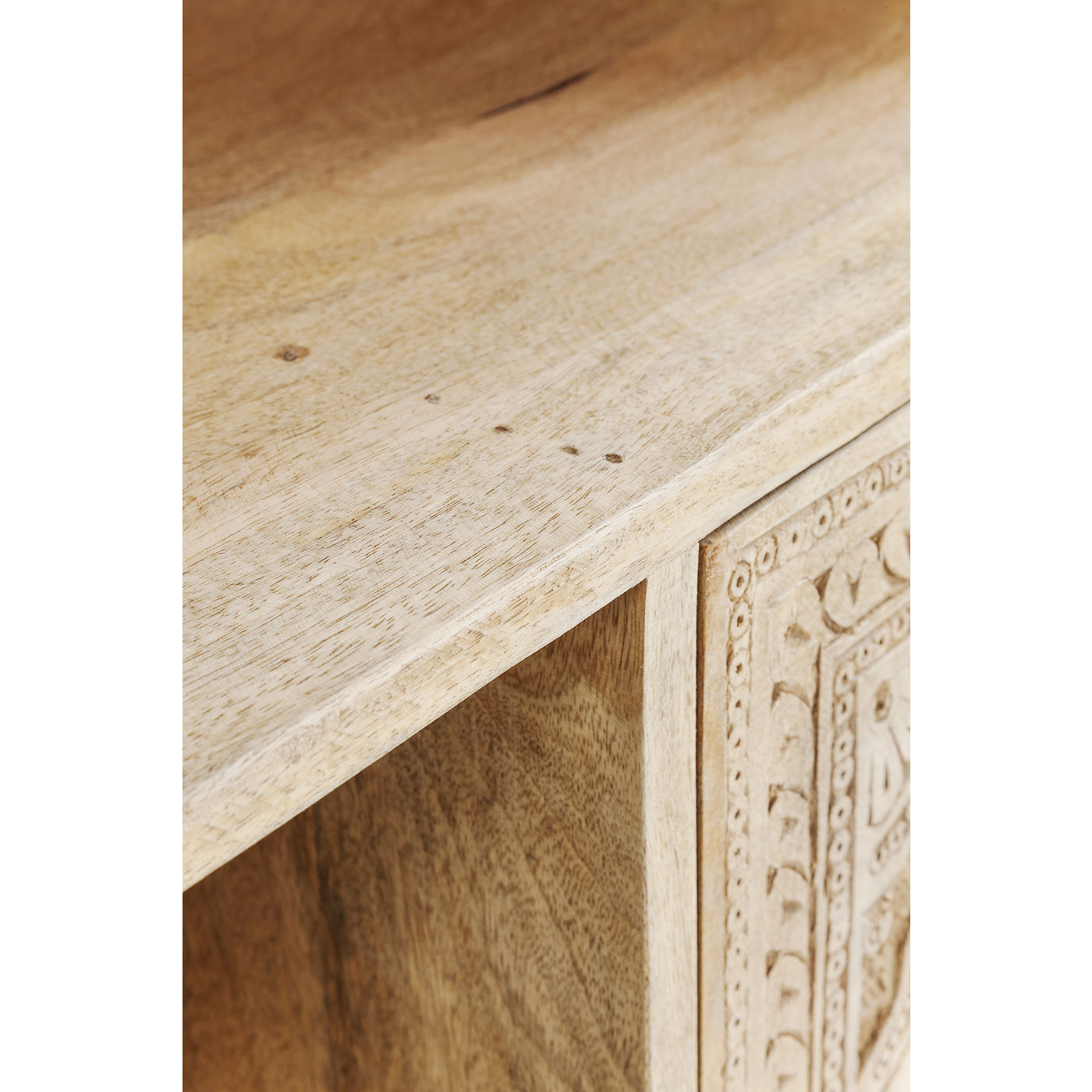 Die Möbelstücke der Puro-Serie verbinden wertvolle Handwerkskunst und helles Mango-Massivholz mit natürlichem und behaglichem Wohndesign. Kunstvolle Schnitzereien zeugen vom Können indischer Handwerker und machen jedes Möbelstück einzigartig. Wer sich für ein Design der Serie entscheidet, holt sich ein echtes Schmuckstück ins Zuhause, das eine stilvolle und stimmungsvolle Atmosphäre schafft.Deckplatte: 25 kg max. Belastbarkeit Schublade: 15 kg max. Belastbarkeit handgearbeitet montiertKorpus und Fronten: Mango Massivholz lackiert, Fachboden: mitteldichte Faserplatte lackiert, Griffe: Glas klar, Büffelknochen, Deckplatte: 25 kg max. Belastbarkeit, Schublade: 15 kg max. Belastbarkeit, handgearbeitet, montiert