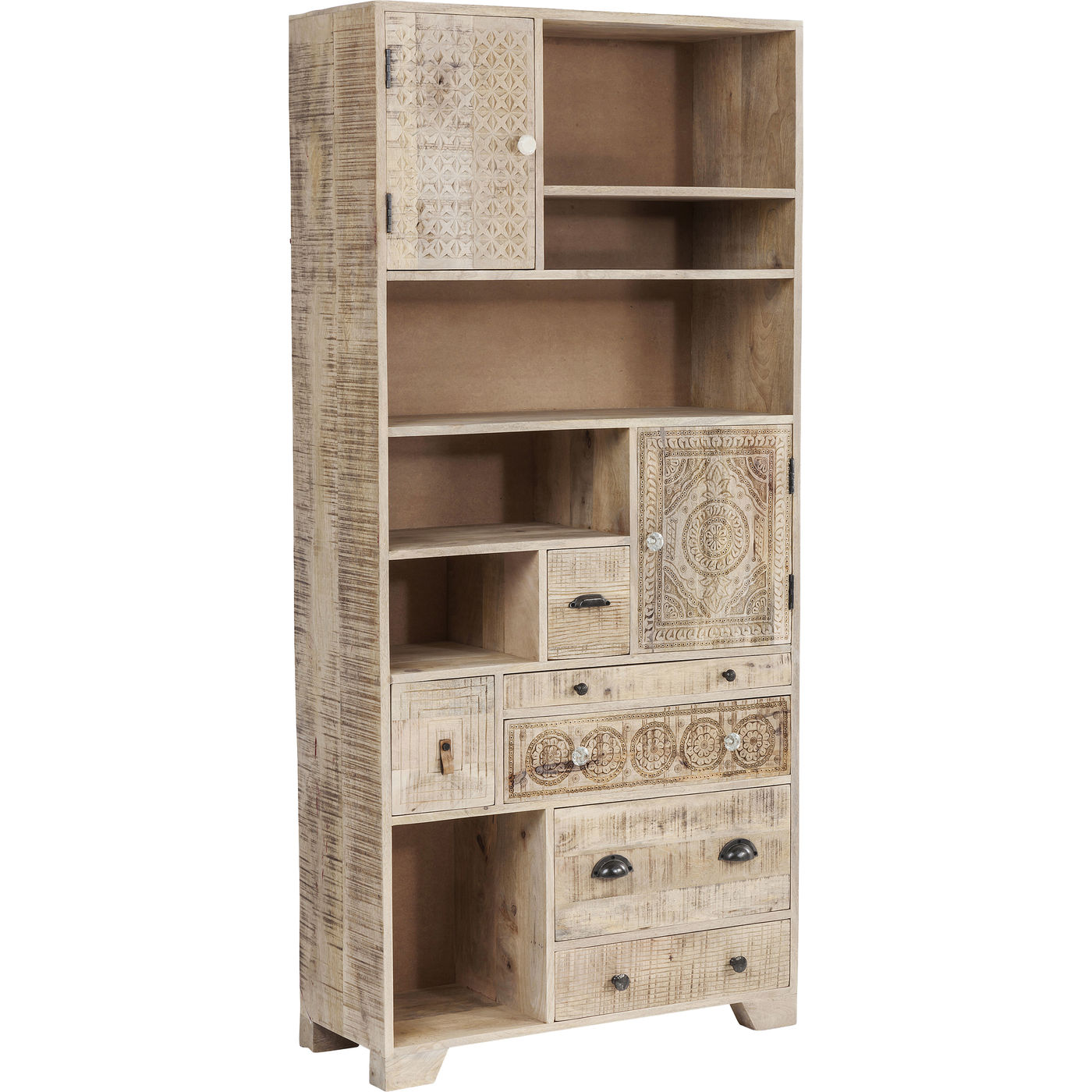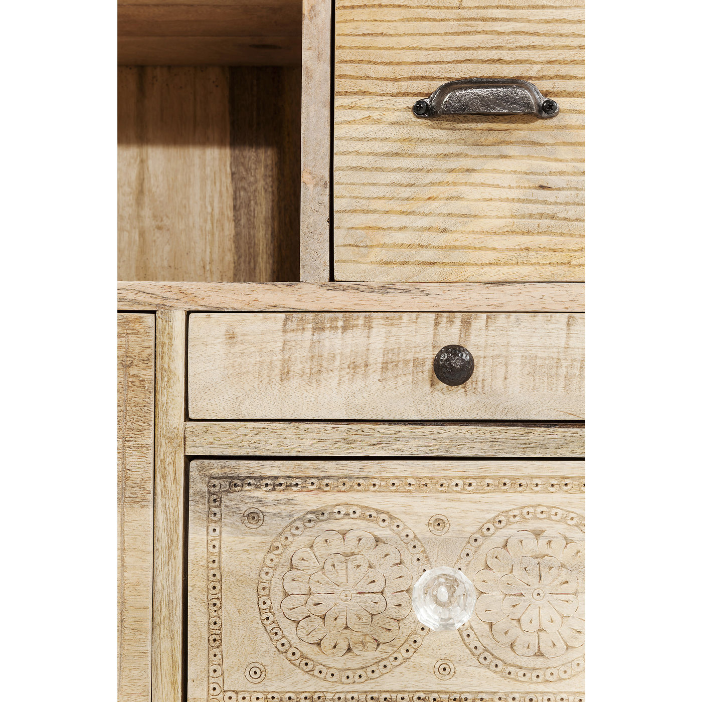Die Möbelstücke der Puro Serie verbinden wertvolle Handwerkskunst und helles Mango-Massivholz mit natürlichem und behaglichem Wohndesign. Kunstvolle Schnitzereien zeugen vom Können indischer Handwerker und machen jedes Möbelstück einzigartig. Wer sich für ein Design der Serie entscheidet, holt sich ein echtes Schmuckstück ins Zuhause, das eine stilvolle und stimmungsvolle Atmosphäre schafft.Deckplatte: 25 kg max. Belastbarkeit Fachboden: 15 kg max. Belastbarkeit handgearbeitet montiertKorpus und Fronten: Mango Massivholz lackiert, Rückwand: mitteldichte Faserplatte lackiert, Griffe: Stahl lackiert, Glas klar, Rindleder Anilin Nubuk, Büffelknochen, Schubladenboden: mitteldichte Faserplatte lackiert, Deckplatte: 25 kg max. Belastbarkeit, Fachboden: 15 kg max. Belastbarkeit, handgearbeitet, montiert