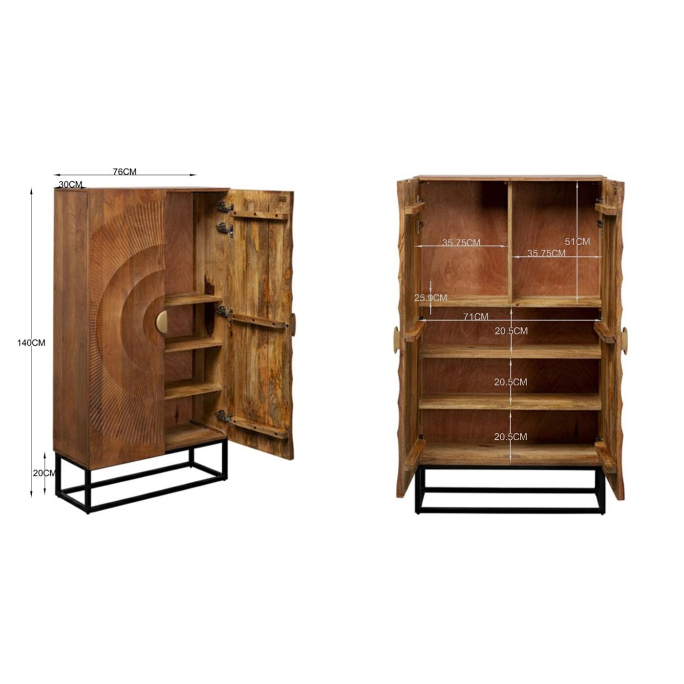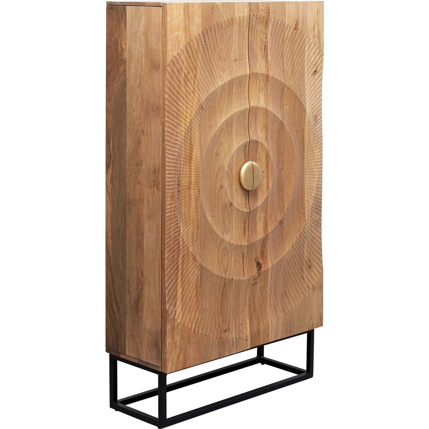 Eine Möbelfront so schön wie ein Gemälde - das magische, dreidimensionale Motiv macht diesen Schrank zum Eyecatcher in jedem Raum. Der hellbraune Schrank begeistert jeden Einrichtungsfan, der den geschickten Umgang mit dem wertvollen Rohstoff Holz zu schätzen weiß. Die Kunst der Holzschnitzerei wird bis heute in traditionellen Werkstätten in Indien gepflegt, und von dort kommen diese Schrankunikate her. Die cleane, rechteckige Form des Schranks harmoniert mit der Gradlinigkeit des schwarzen Metall-Gestells. Mit seinem Charme wird der Schrank zum neuen Lieblingsmöbel, das vielfältige Aufgaben erfüllt: Als Stauraum für Geschirr, Gläser, Tischtextilien, als Hausbar oder als exklusiver Schuhschrank. Aus massivem Mangoholz und pulverbeschichtetem Stahl gefertigt spielt das Unikat-Möbel auch bei den gewählten Materialien in der Oberklasse mit. Ein langlebiges Möbel, das seinen Wert mit Sicherheit behält.