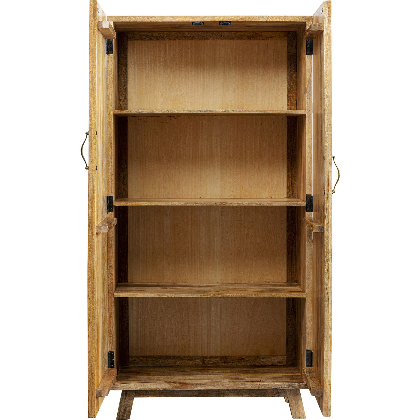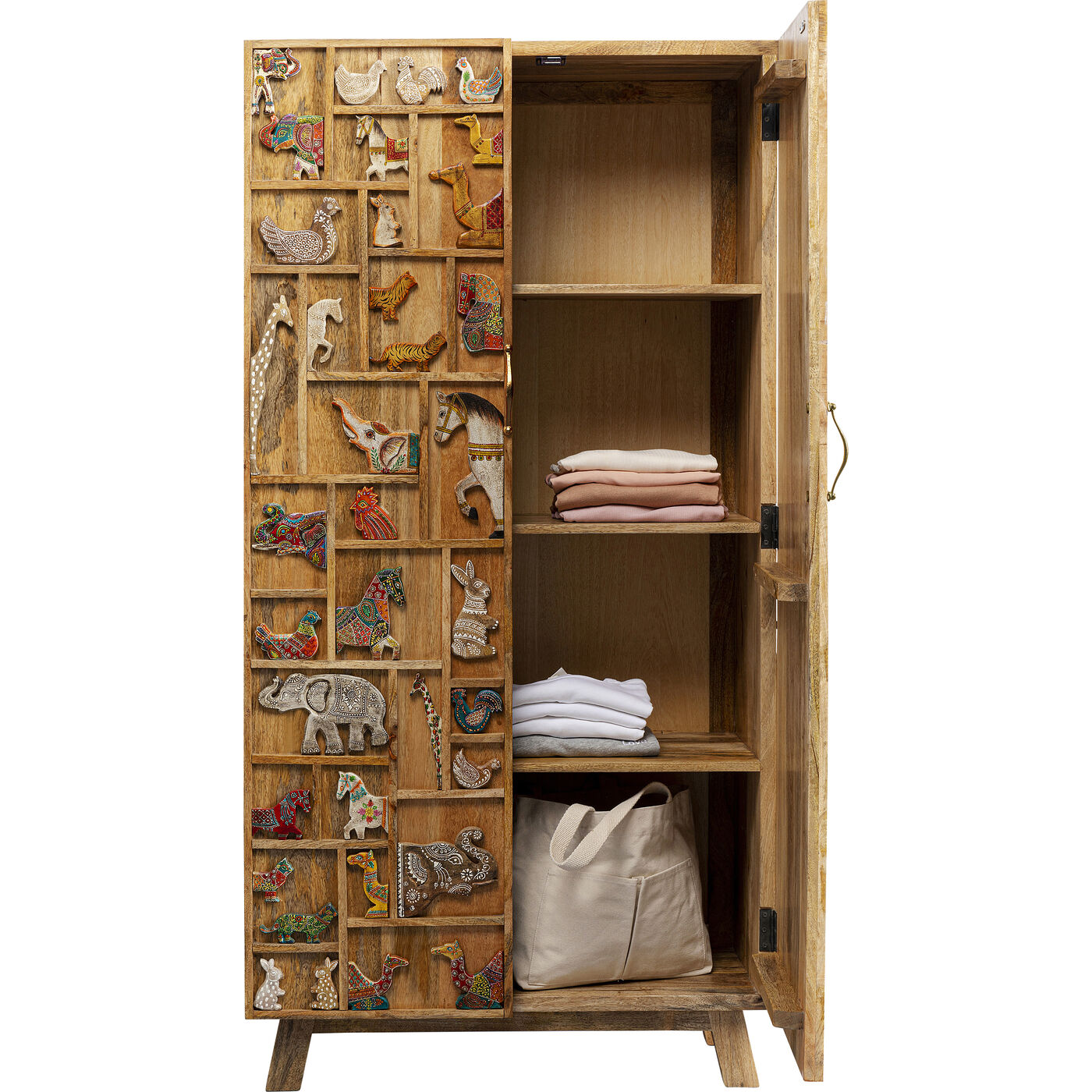 Dieser kleine Schrank ist eine gleichzeitig dekorative wie auch funktionale Lösung, um Dinge in Ihre Haushalt zu verstauen, ob im Flur, im Schlafzimmer oder im Wohnzimmer. Jedes Stück ist ein handgearbeitetes und handbemaltes Unikat aus lackiertem Mango Massivholz und wird in Indien in traditionellen Werkstätten gefertigt. Aus Massivholz gefertigt sind die Türen, der Korpus, die Füße und die aufgesetzten Tierfiguren. Mit Liebe zum Detail wurden z.B Hase, Elefant und Giraffe kunstvoll geschnitzt und farbenfroh bemalt. Die pulverbeschichteten Stahlbeschläge in der Farbe mattes Messing ergänzen das Design stilvoll. Drei fest montierte Einlegeböden schaffen viel Stauraum und Ablageflächen. Die Einsatzmöglichkeiten des Holzschranks sind vielfältig: Nutzen Sie ihn als charmanten Ordnungshelfer, als Flurschrank, als Wäscheschrank und Wohnzimmerschrank. Die massive Bauweise und das Naturmaterial Holz machen dieses Möbelstück besonders langlebig.