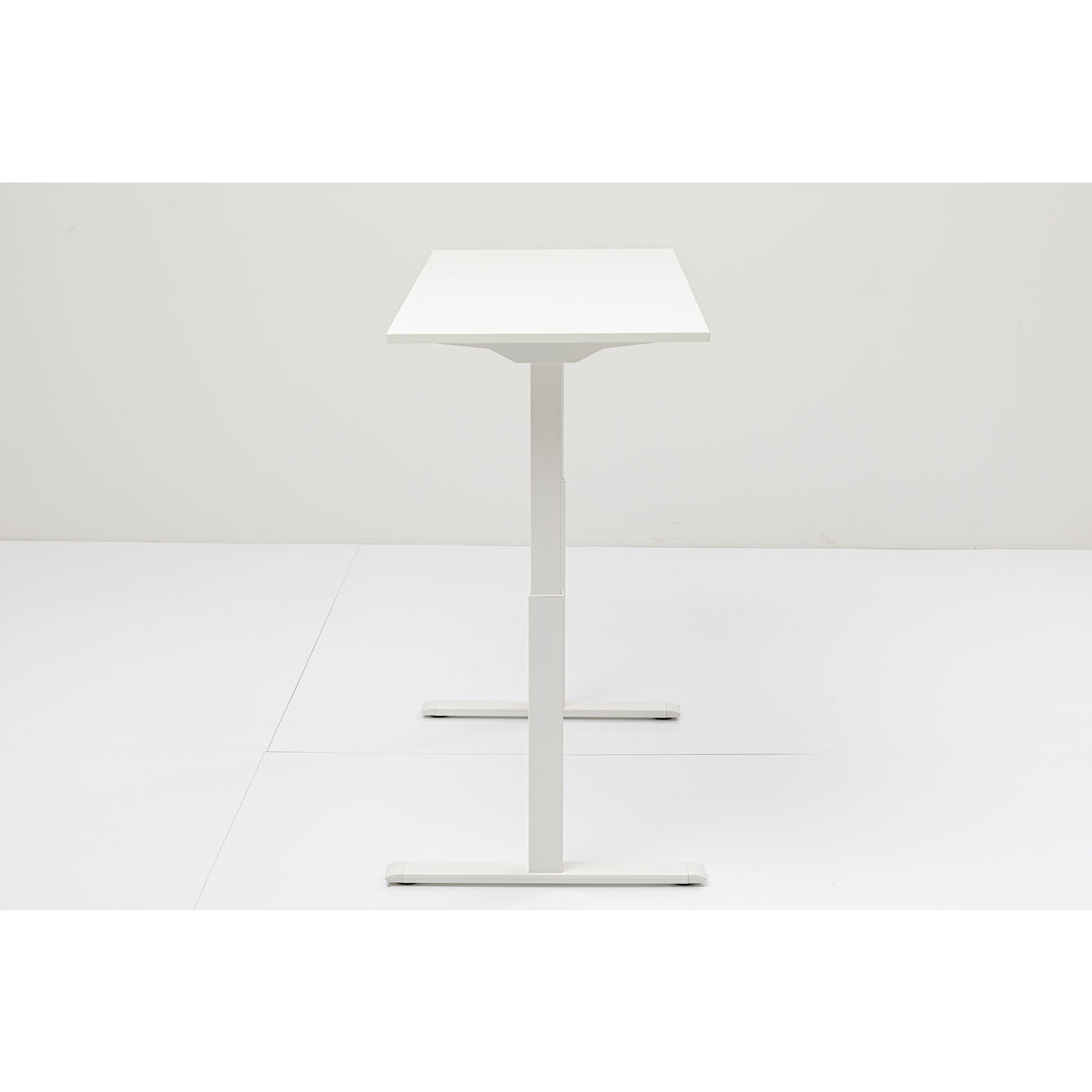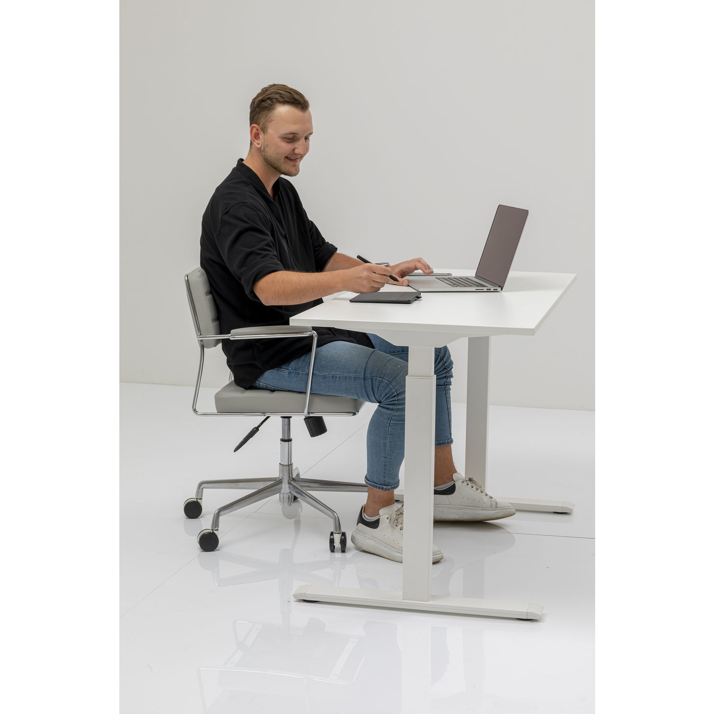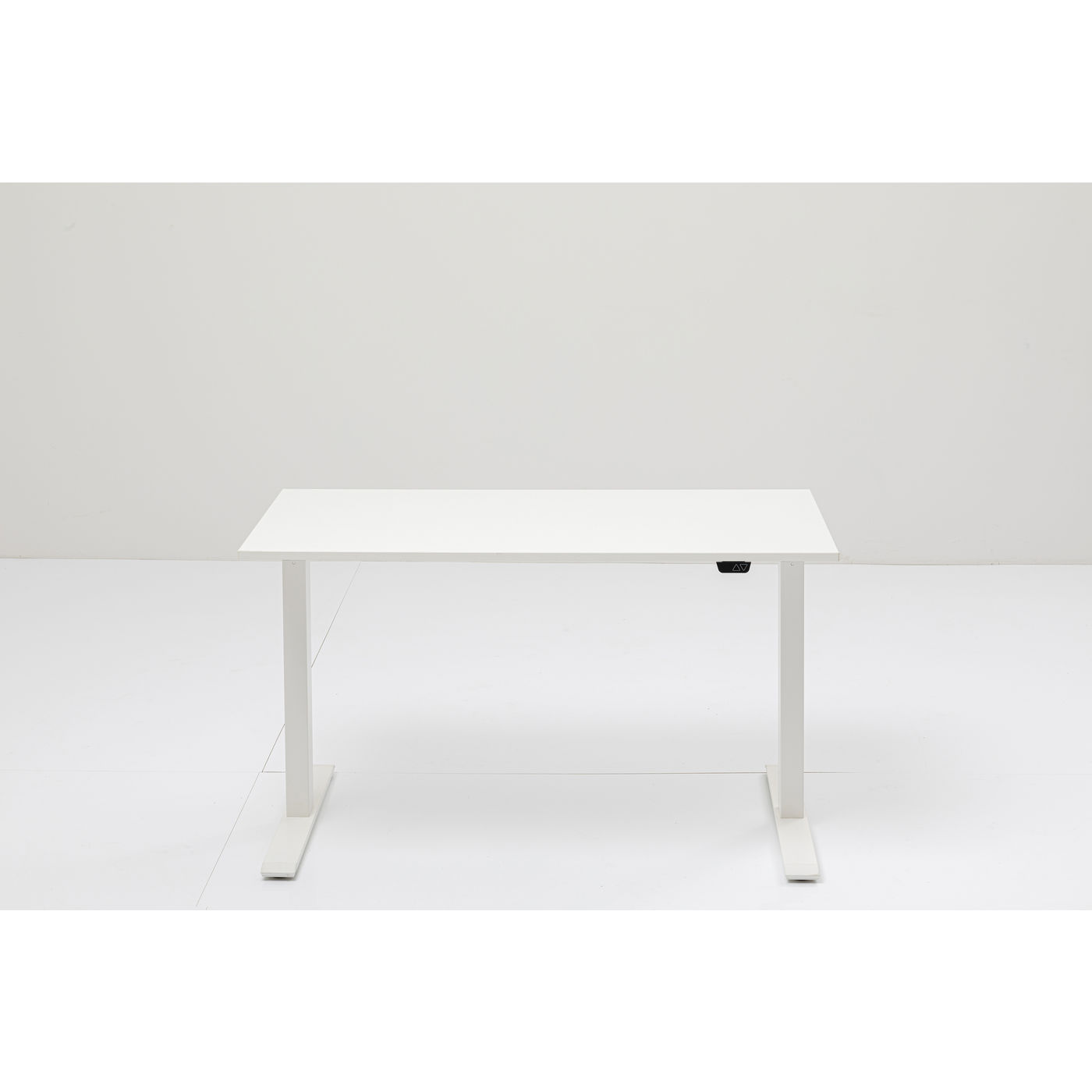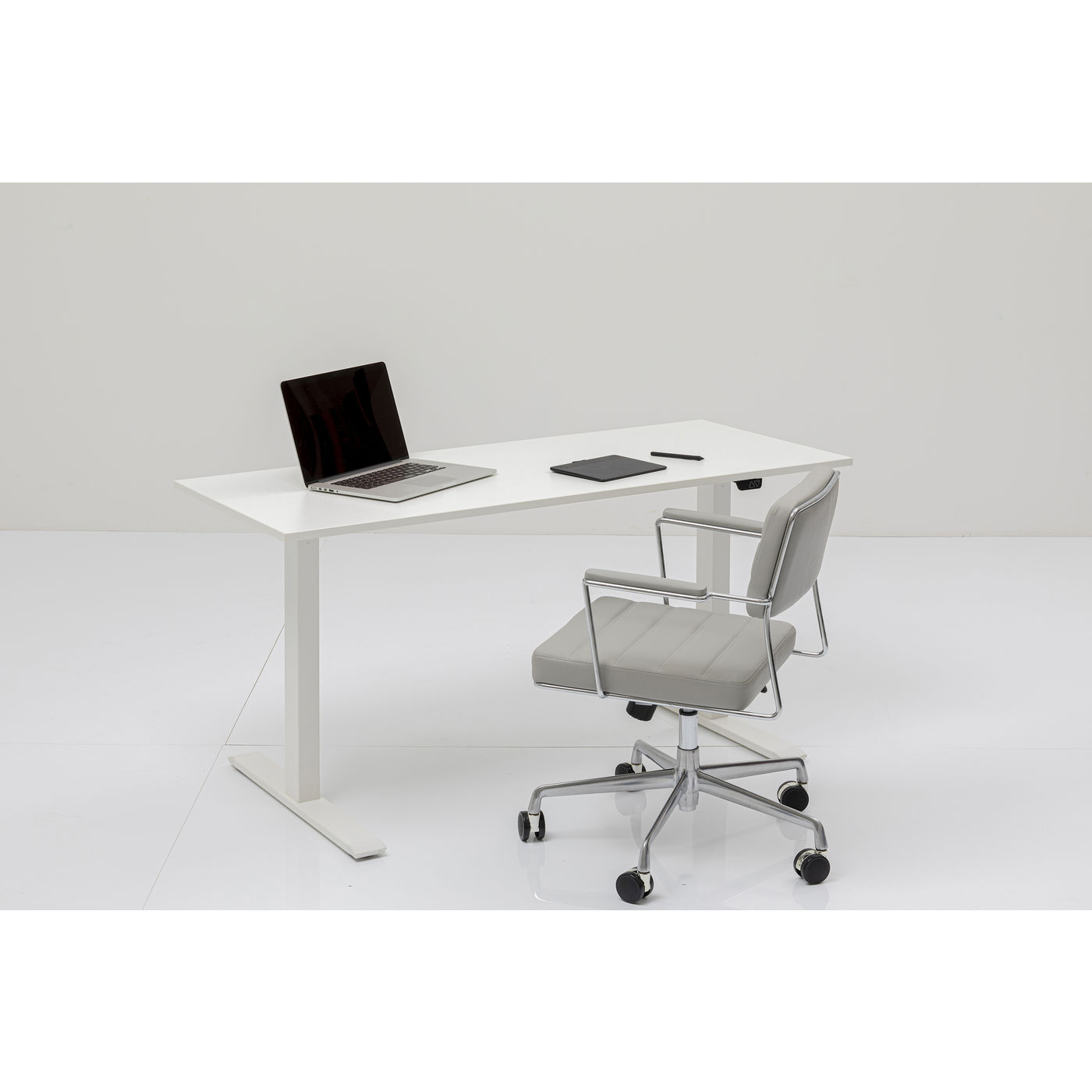- Rechteckiger, elektrisch höhenverstellbarer Schreibtisch mit robuster, weißer MFC Dekor-Platte und lackierten Stahl-Kufen in Weiß