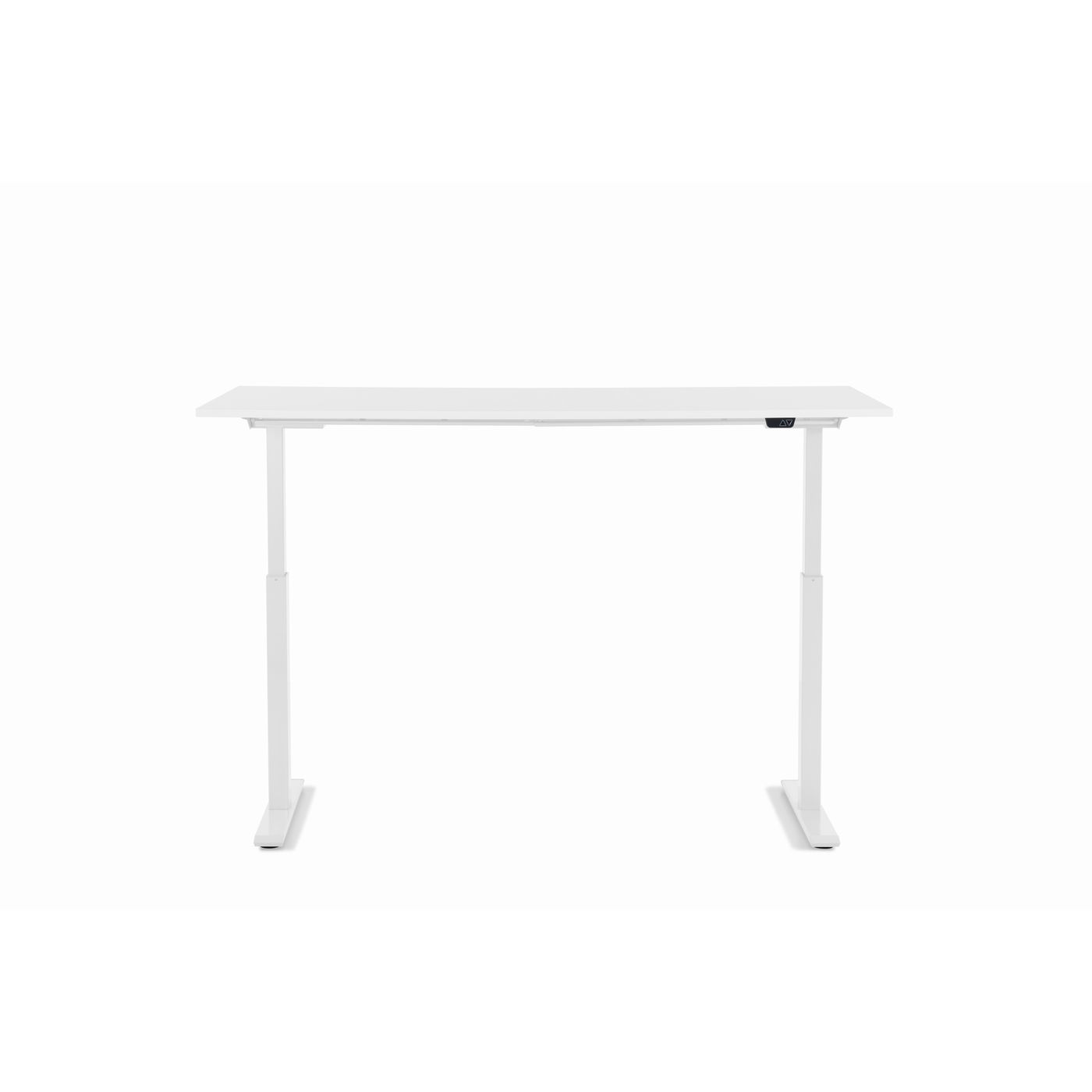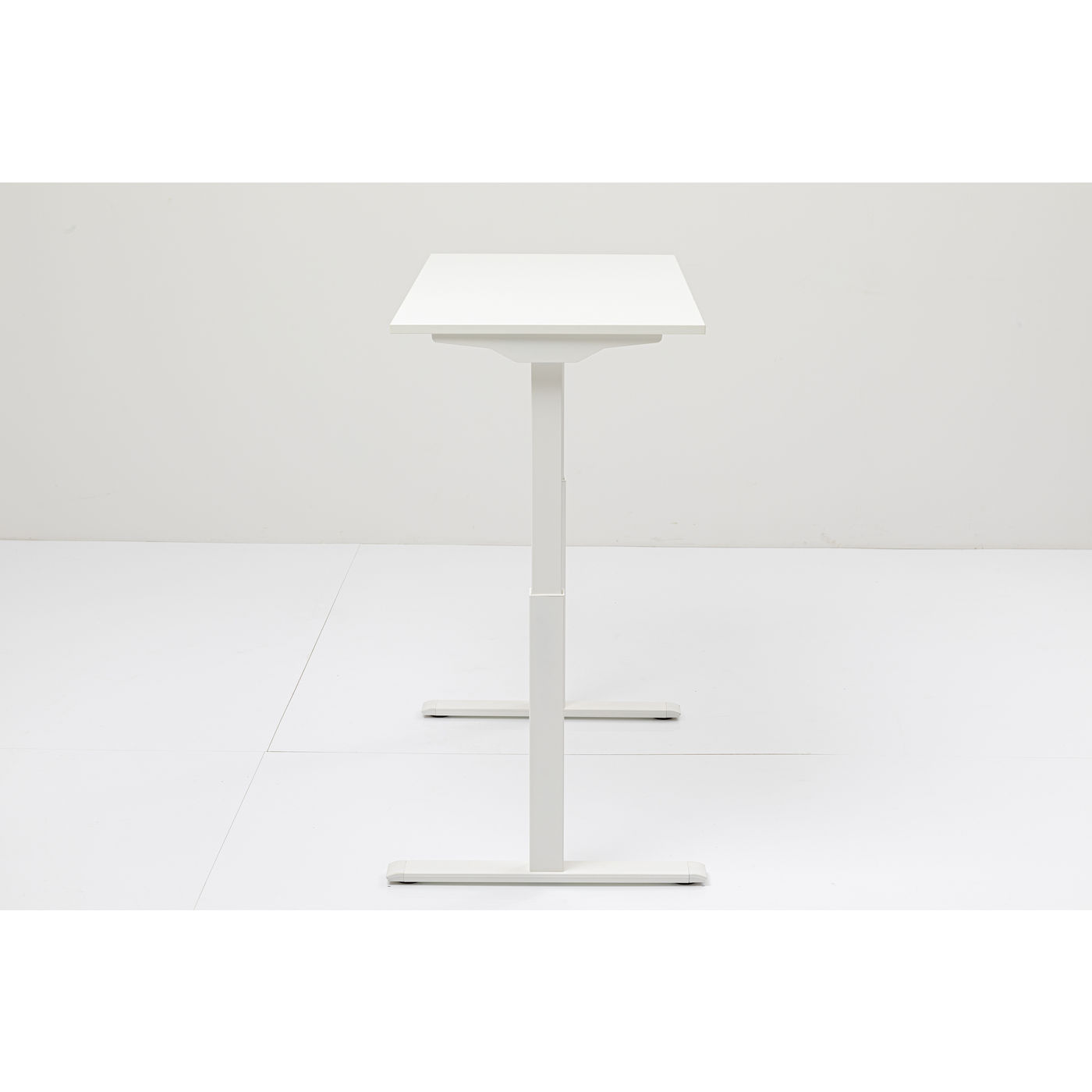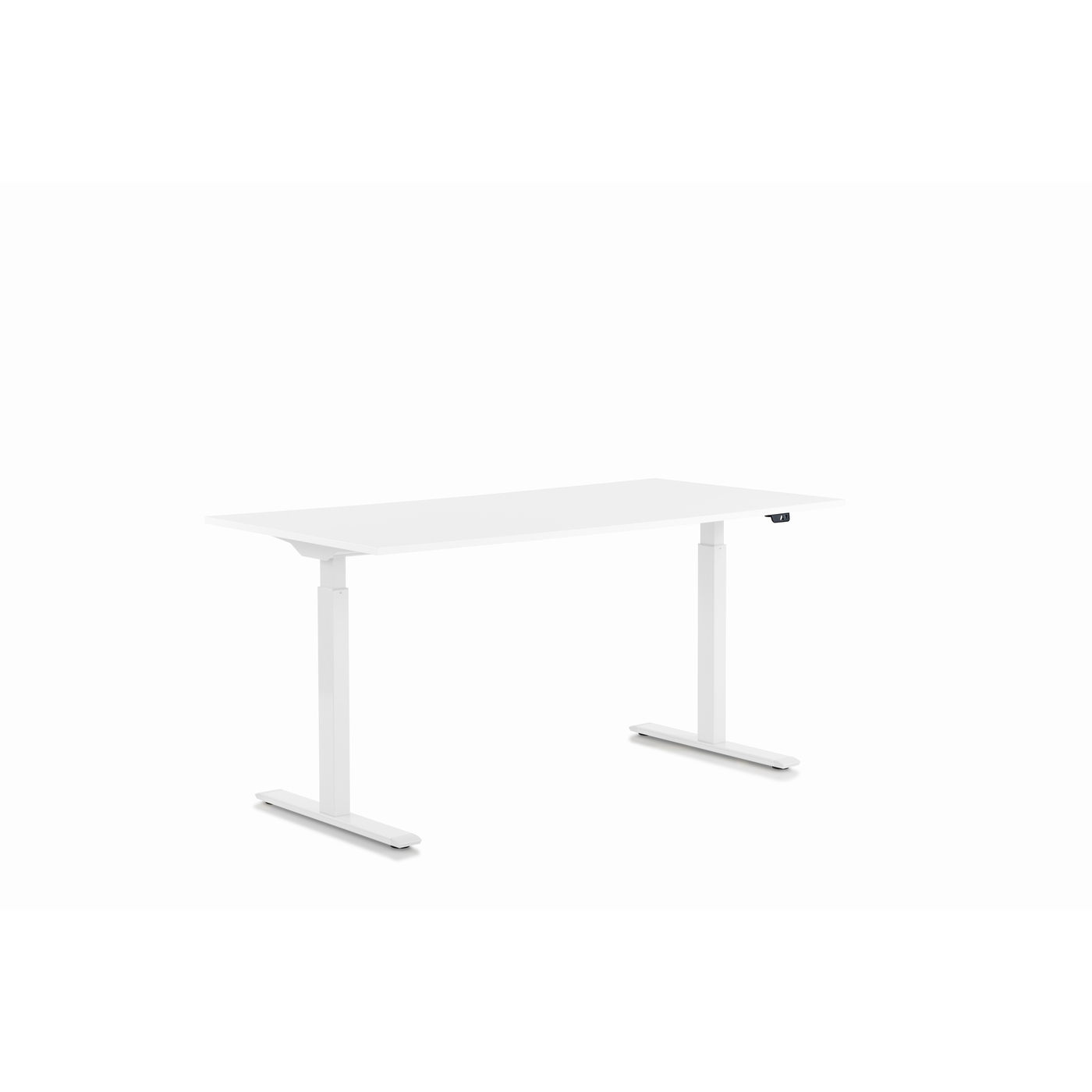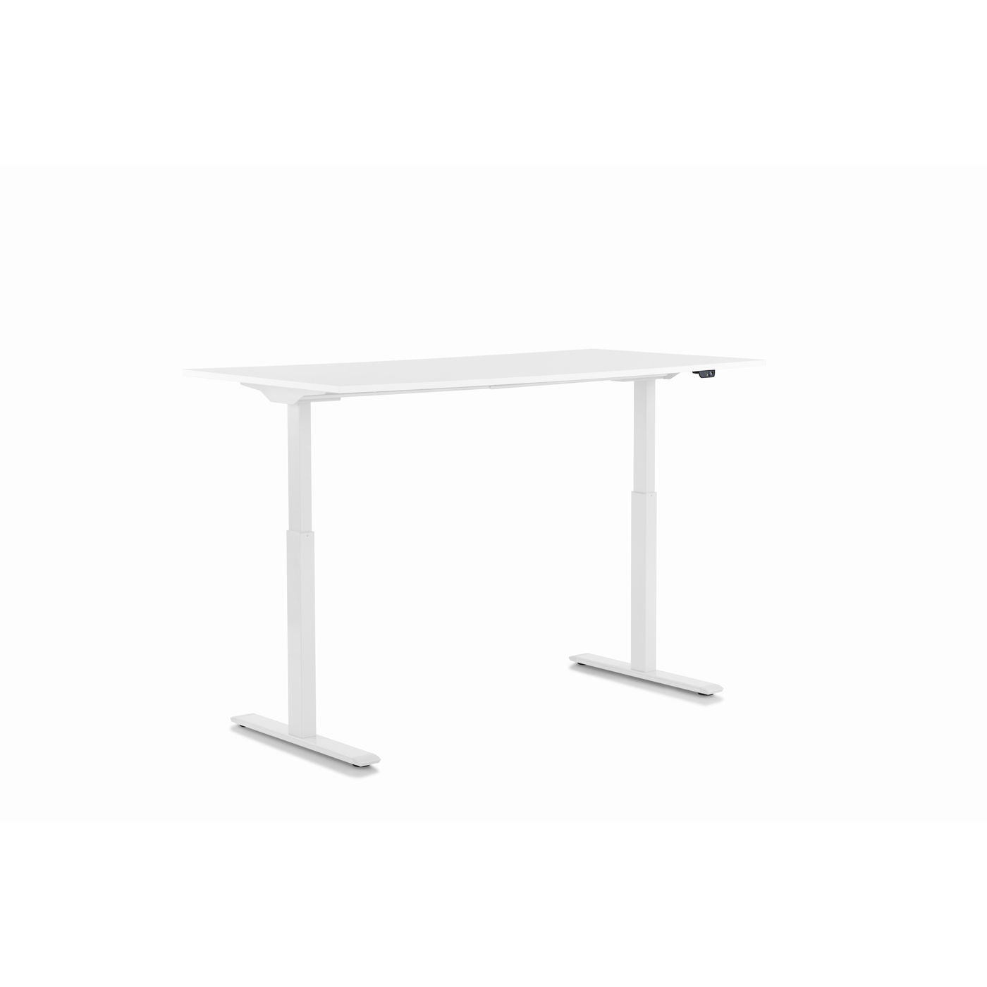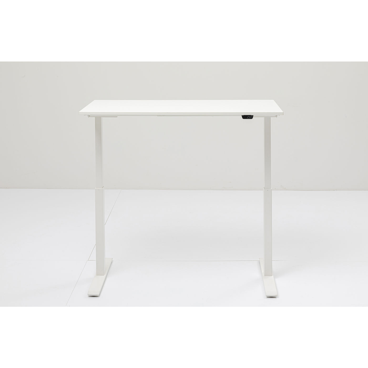 - Rechteckiger, elektrisch höhenverstellbarer Schreibtisch mit robuster, weißer MFC Dekor-Platte und lackierten Stahl-Kufen in Weiß