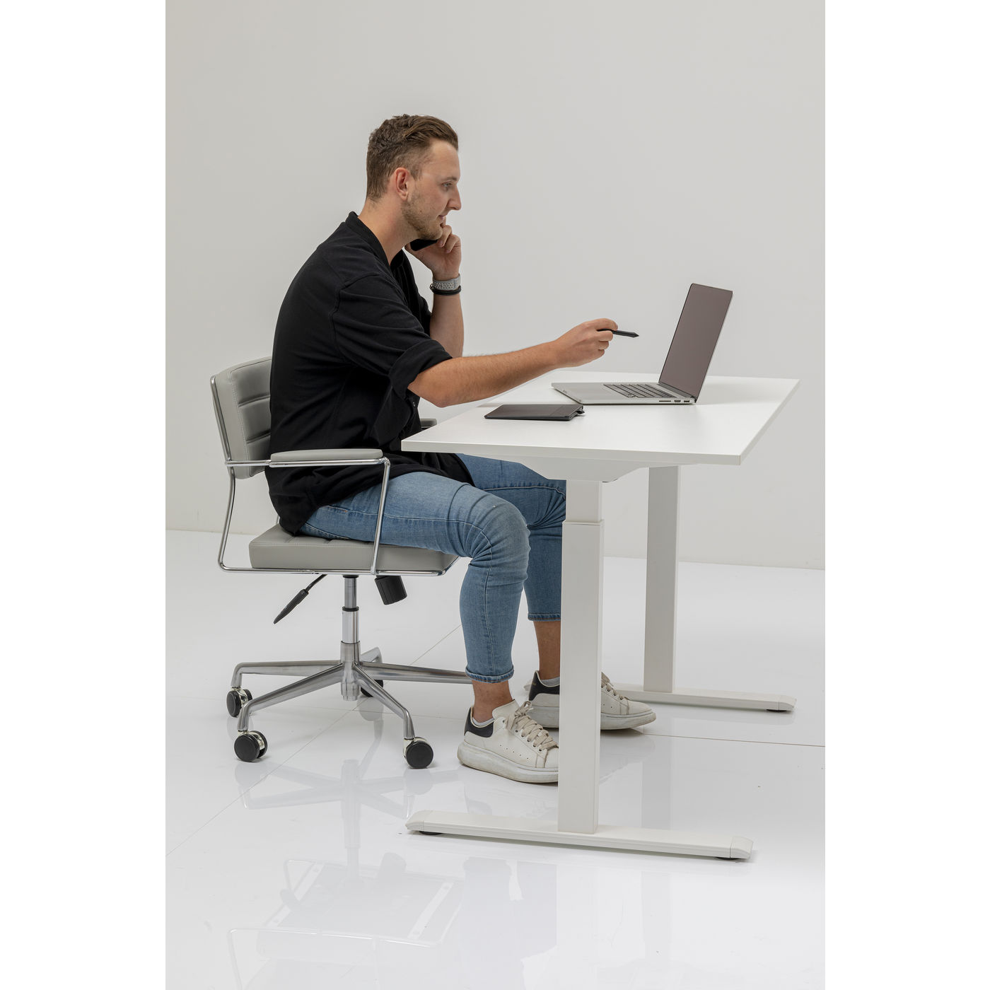 Unser elektrisch höhenverstellbare Schreibtisch ist eine echte Bereicherung für den Büroalltag: Er wirkt dank des Wechsels von Sitzen & Stehen einem monotonen Sitzverhalten entgegen und regt außerdem die Leistungsfähigkeit an. Die weiße, seidig-matte Struktur der MFC Dekor-Platte und das weiß lackierte Stahl-Gestell sehen mit ihrem Allover White Look außerdem absolut stilvoll in jedem Home Office und Büro aus.
