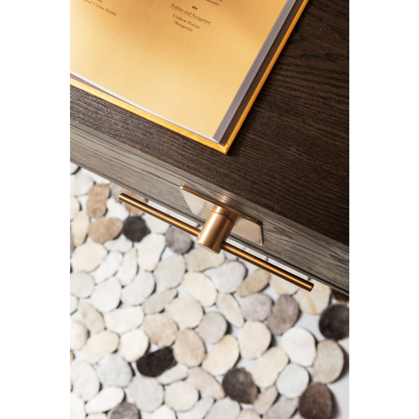 Ein klassischer Schreibtisch, der auch gut zum Interieur einer Luxus-Segelyacht passen würde. Stäbchen-Beschläge und das grafische Gestell im Messinglook und dazu dunkles Eschenfurnierholz sind ein cooler Mix aus Weltenbummler-Stil und Modernismus. Weitere Möbelmodelle aus der Serie Osaka erhältlich.