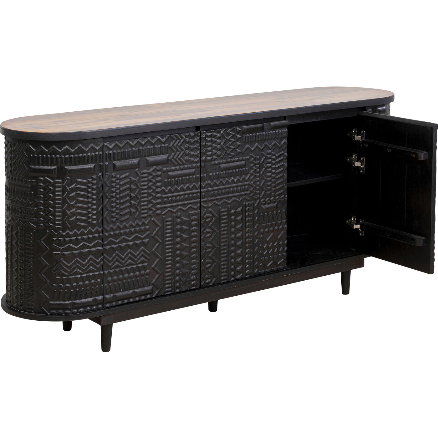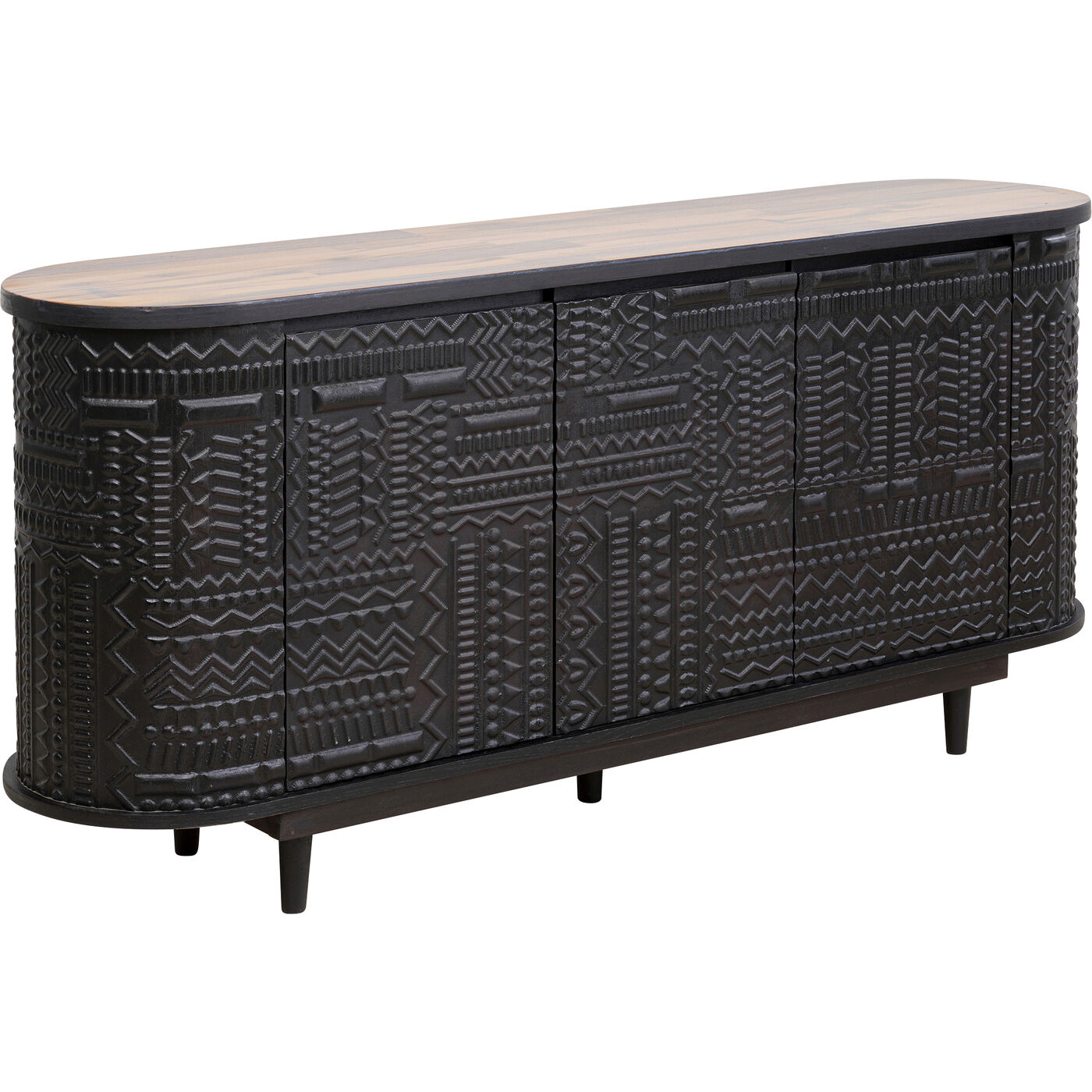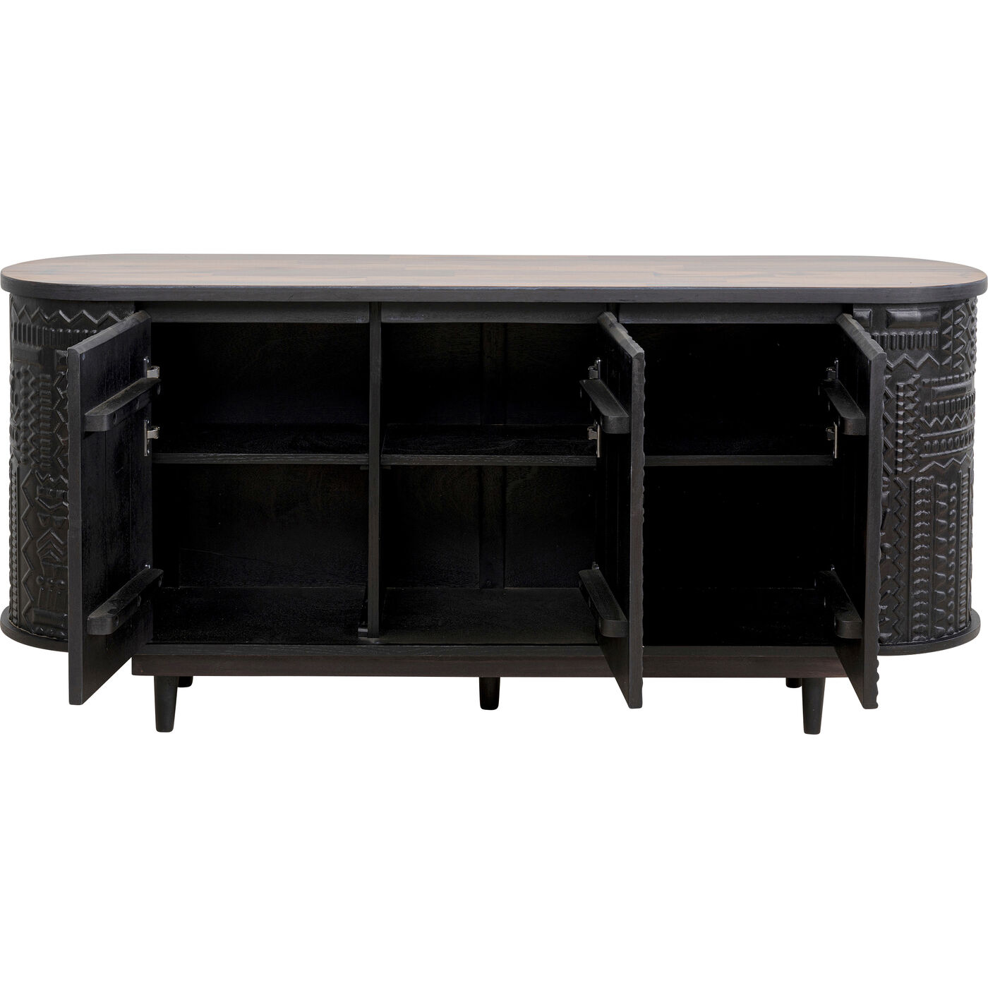 Dieses schwarze Sideboard ist ein Statement im Ethno Wohnstil. Mit seinen auffallenden Fronten ist es nicht nur ein Blickfang, sondern auch funktional. Das einzigartige Design wurde mit Schnitzereien in Handarbeit gefertigt und verleiht dem Sideboard einen besonderen Charme. Der Korpus und die Fronten bestehen aus lackiertem, massivem Mangoholz, welches eine hohe Stabilität und Langlebigkeit garantiert. Jedes Fach verfügt über einen fest montierten Boden und die Soft-Close-Funktion der Türen sowie justierbare Scharniere sorgen für eine einfache und bequeme Handhabung. Dieses Sideboard passt als Eyecatcher ebenfalls gut zum modernen Wohnzimmer, ist eine perfekte Ergänzung für jeden Wohnbereich und bietet ausreichend Stauraum für alle Bedürfnisse.