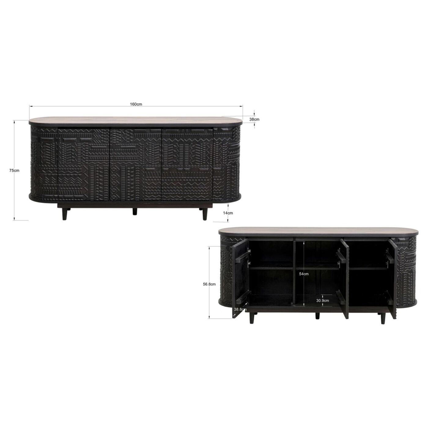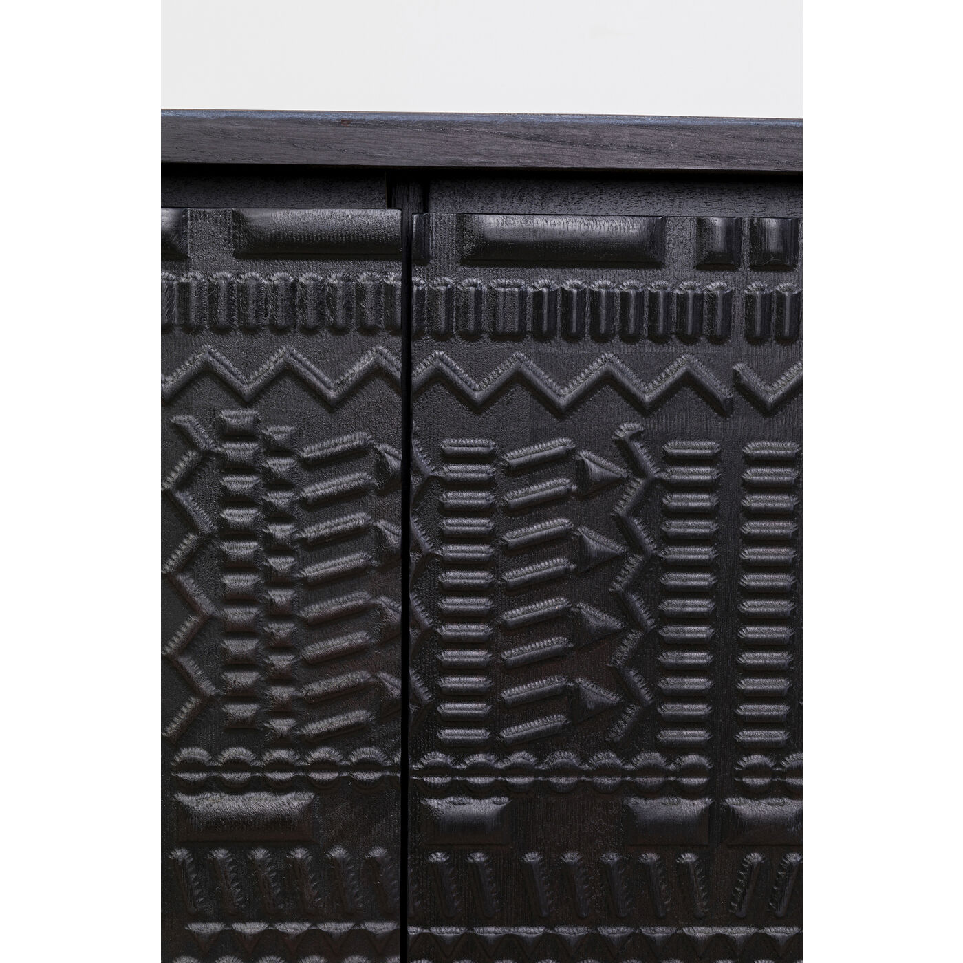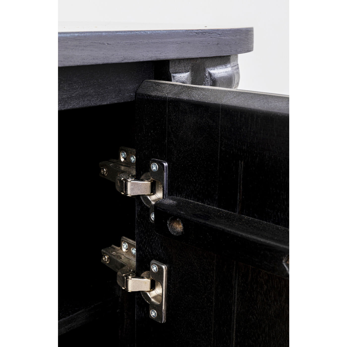 Dieses schwarze Sideboard ist ein Statement im Ethno Wohnstil. Mit seinen auffallenden Fronten ist es nicht nur ein Blickfang, sondern auch funktional. Das einzigartige Design wurde mit Schnitzereien in Handarbeit gefertigt und verleiht dem Sideboard einen besonderen Charme. Der Korpus und die Fronten bestehen aus lackiertem, massivem Mangoholz, welches eine hohe Stabilität und Langlebigkeit garantiert. Jedes Fach verfügt über einen fest montierten Boden und die Soft-Close-Funktion der Türen sowie justierbare Scharniere sorgen für eine einfache und bequeme Handhabung. Dieses Sideboard passt als Eyecatcher ebenfalls gut zum modernen Wohnzimmer, ist eine perfekte Ergänzung für jeden Wohnbereich und bietet ausreichend Stauraum für alle Bedürfnisse.