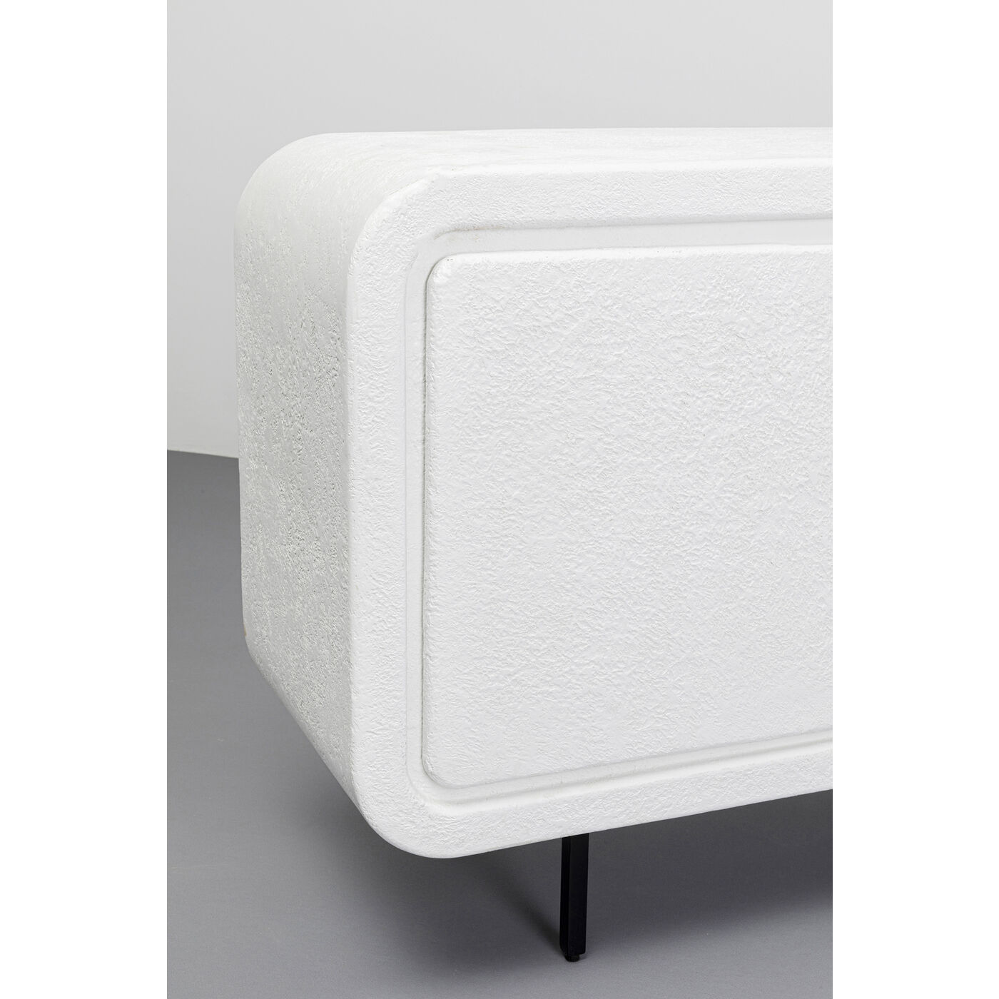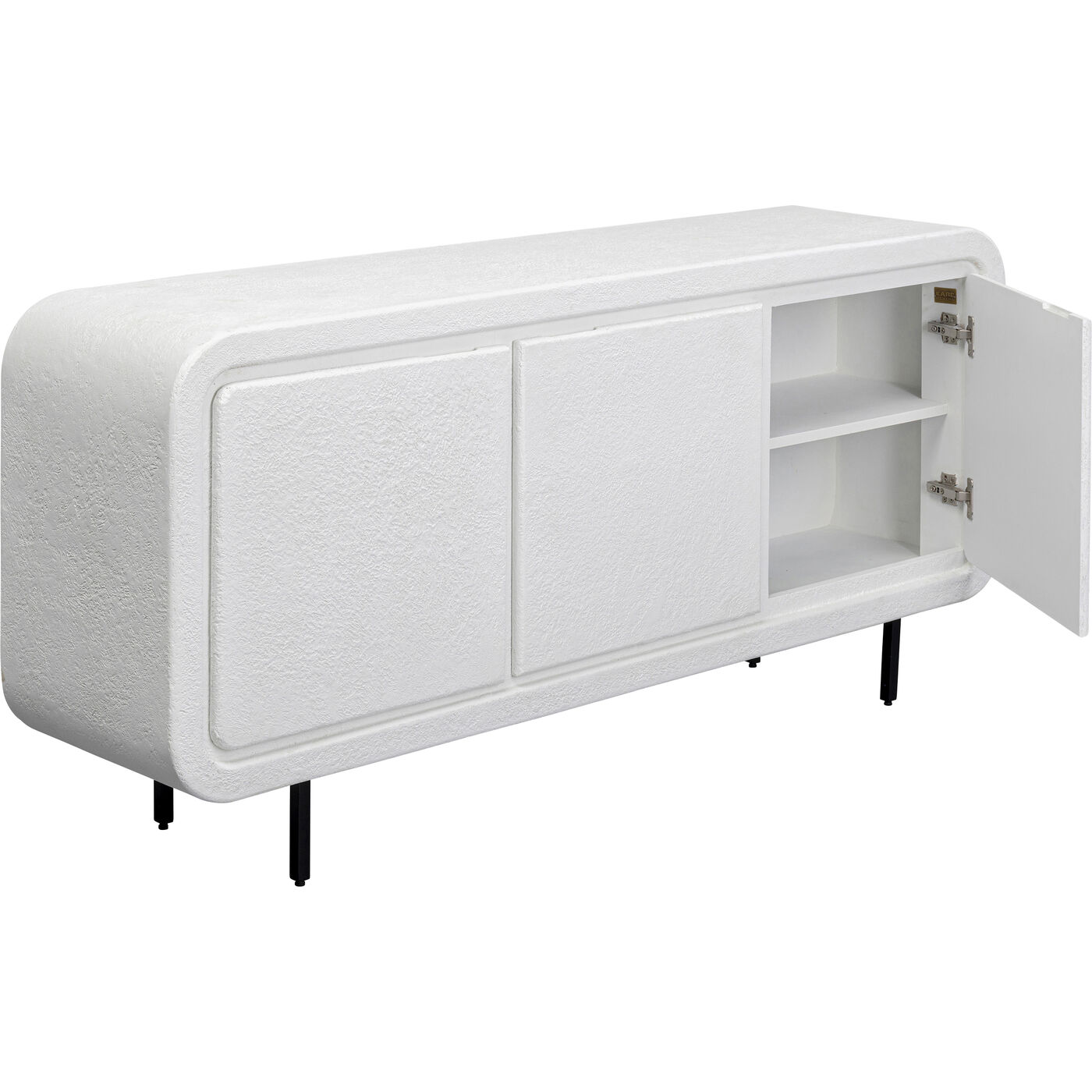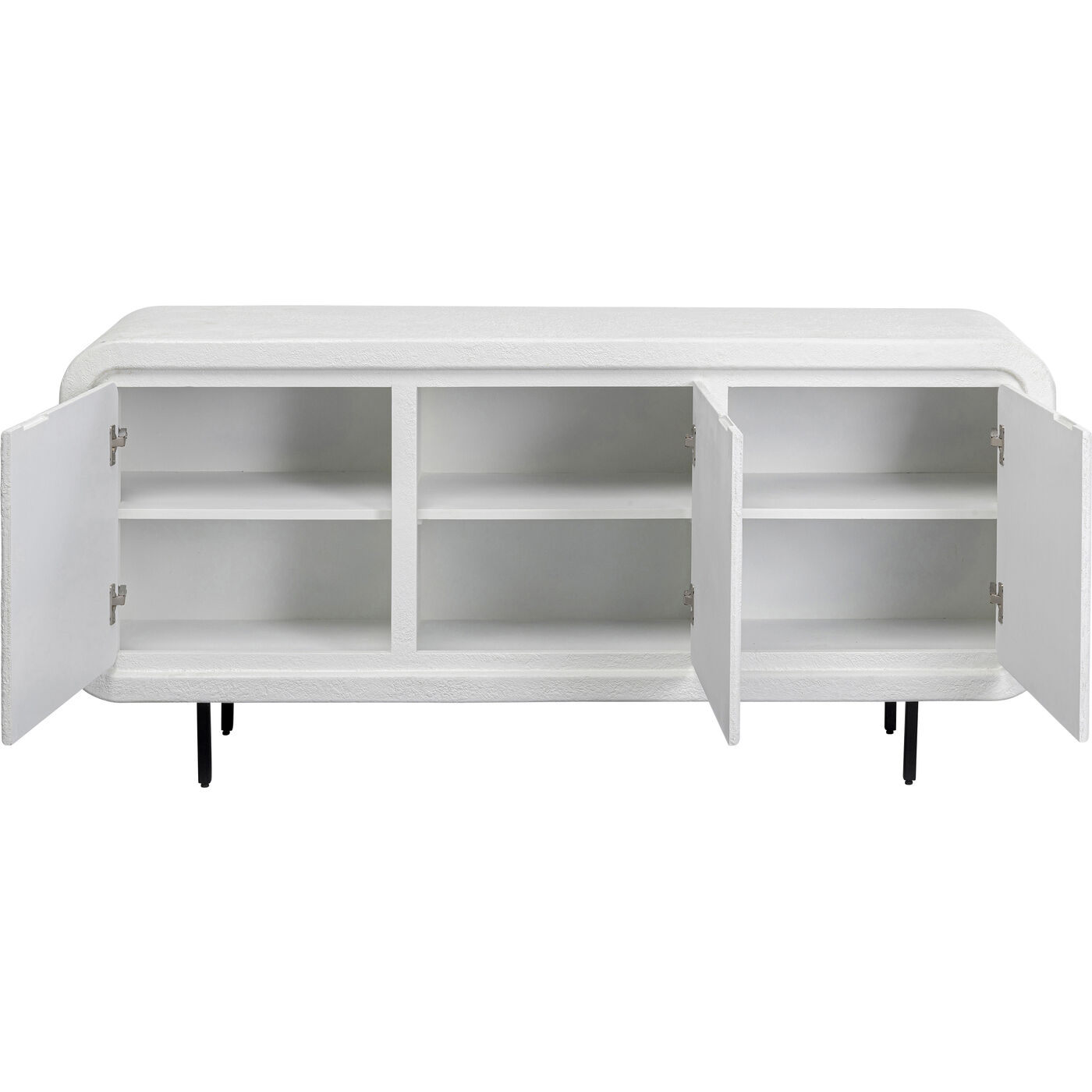 So klarlinig das Design dieses in Handarbeit hergestellten Sideboards ist, so raffiniert sind die Details, die dieses Möbelstück zum Hingucker machen. Das sind zum einen die gerundeten Ecken, die an Retro-Design erinnern. Zum anderen fällt auf den zweiten Blick die leicht strukturierte Oberfläche auf, die dem Design diskrete Lebendigkeit verleiht. Schlichte, grade Beine aus pulverbeschichtetem Stahl unterstreichen den gradlinigen Auftritt. Das Wohnzimmer-Sideboard bietet in seinem Inneren auf den fest montierten Fachböden genug Stauraum. Die Oberflächen dieses Sideboards können Sie ganz einfach mit einem feuchten Tuch pflegen.