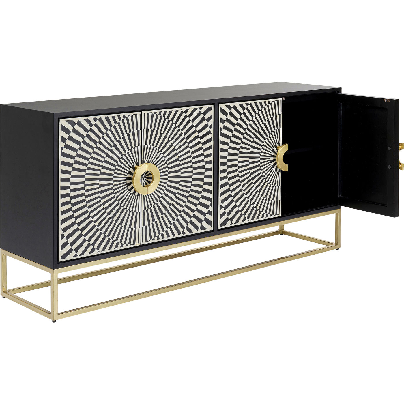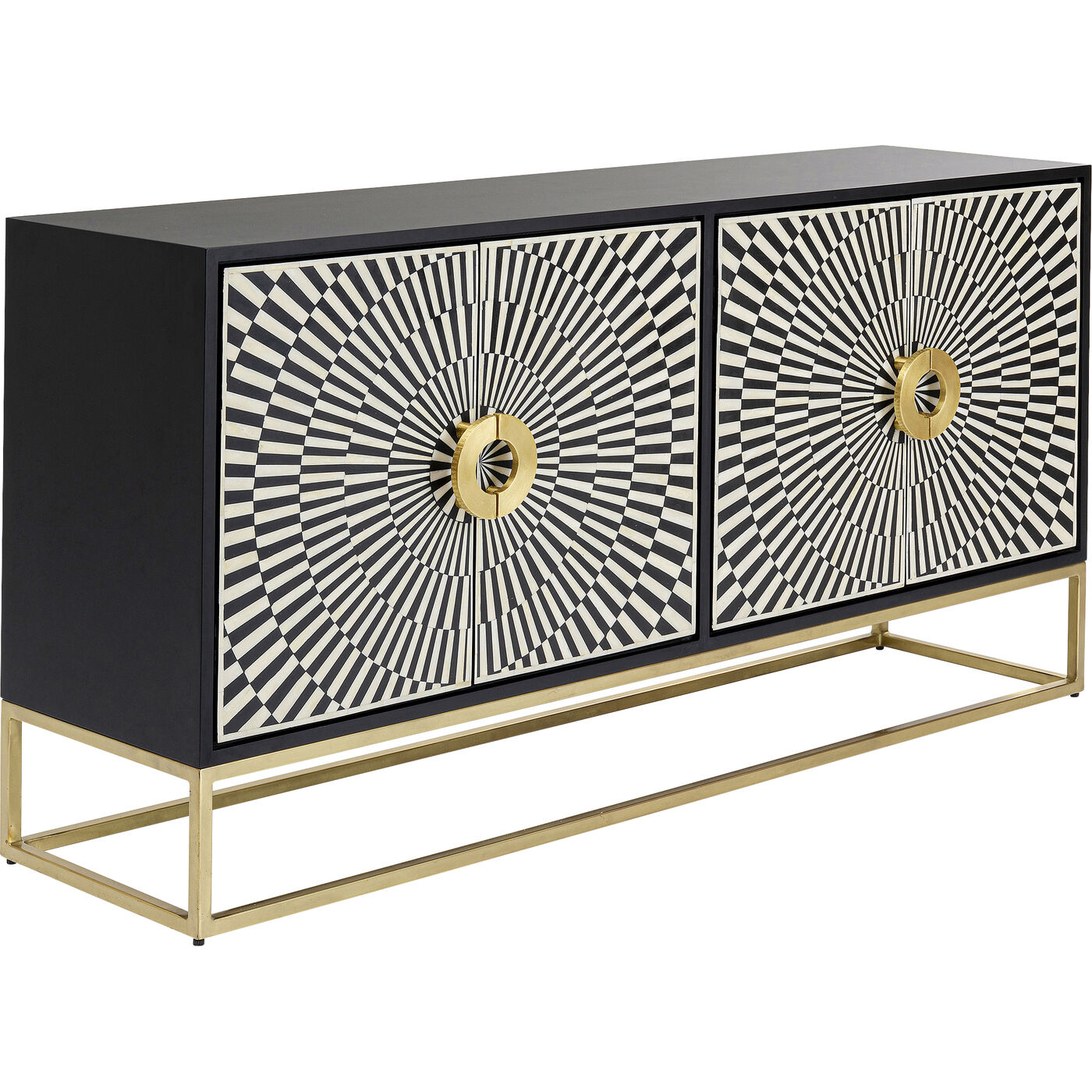 - Die Türfronten sind mit Intarsienarbeiten in Schwarz und Weiß in bester Handwerkstradition gearbeitet. Das kreisförmige Muster zieht magisch alle Blicke auf sich