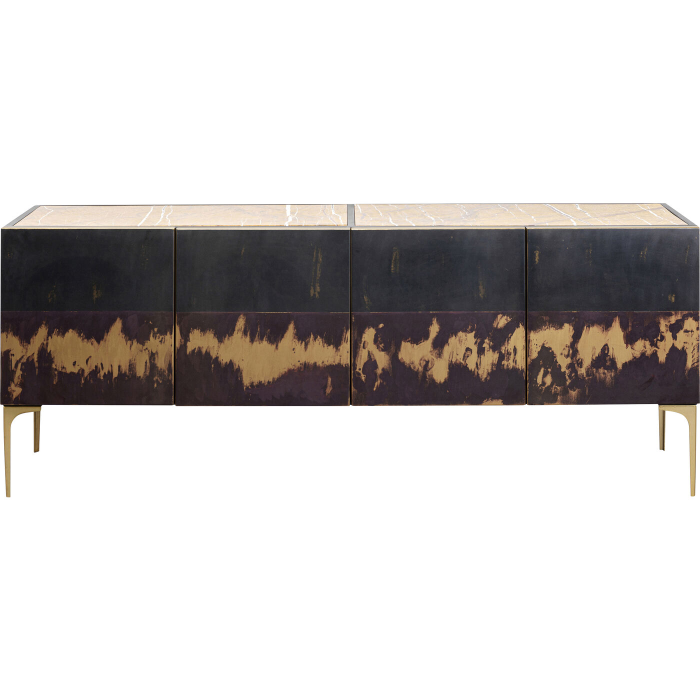 Dieses Metall-Sideboard hat sich als abstraktes Kunstwerk verkleidet. Jede Front entsteht durch eine spezielle Technik und Ihr persönliches Unikat ist einzigartig. Der Korpus aus Metall wird von einer luxuriösen und sehr attraktiven Deckplatte aus hellem, echtem Marmor getoppt. Bei einer Breite von 168cm verfügt das Designer-Sideboard aus unserem KARE Studio über vier Türen, die sich auf leichten Druck hin öffnen und schließen lassen. Dahinter findet sich Platz für die Hausbar oder die Entertainment-Technik für TV und Musik. Praktische Kabeldurchlässe auf der Rückseite machen die Installation ganz einfach.