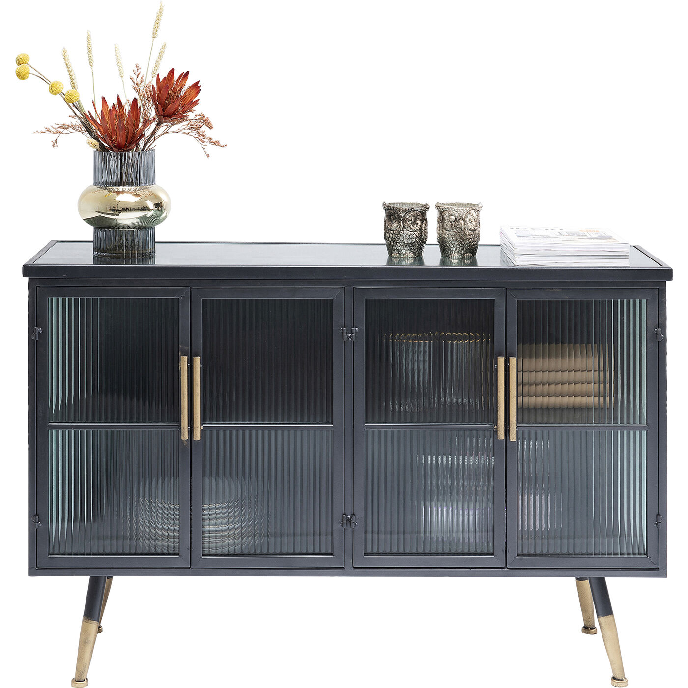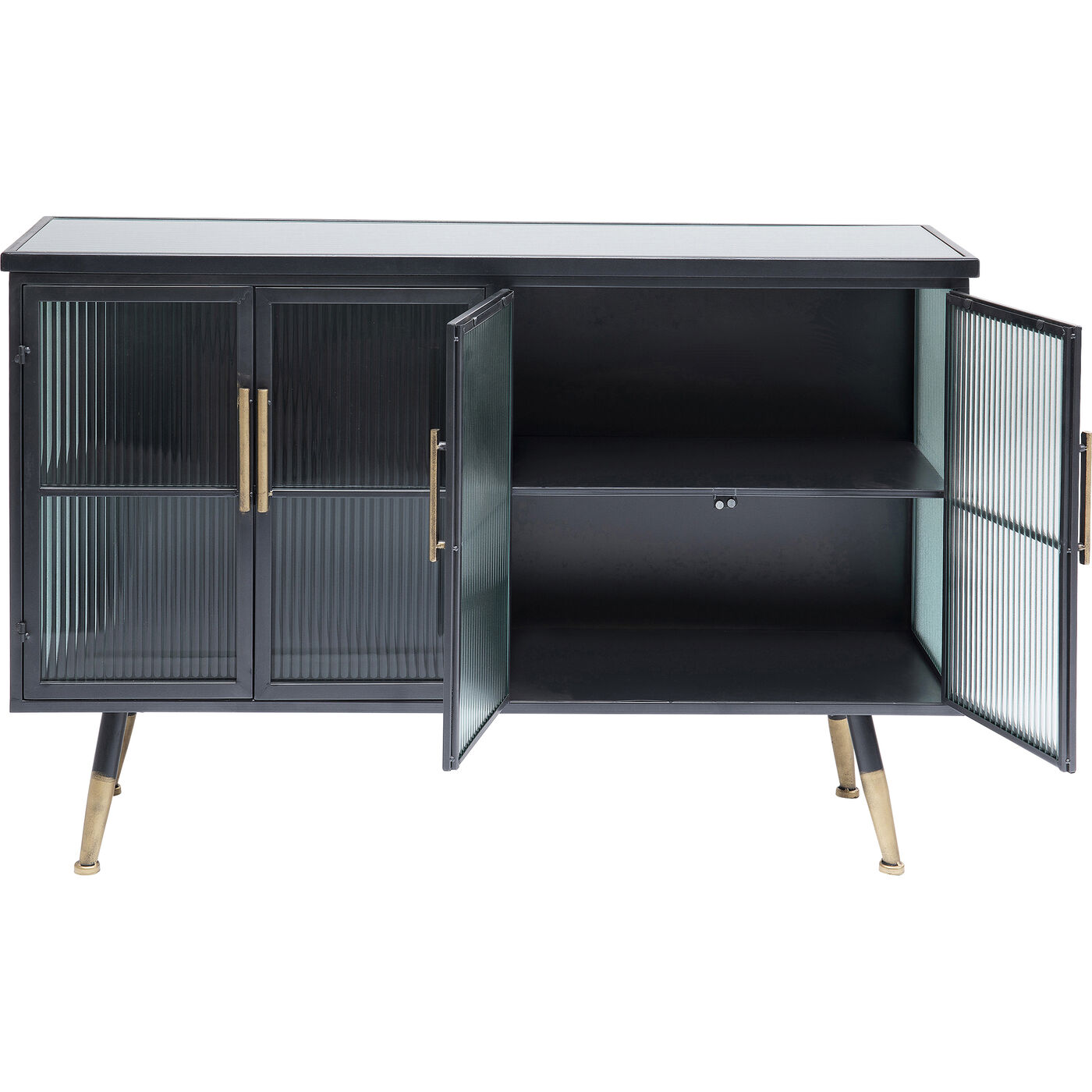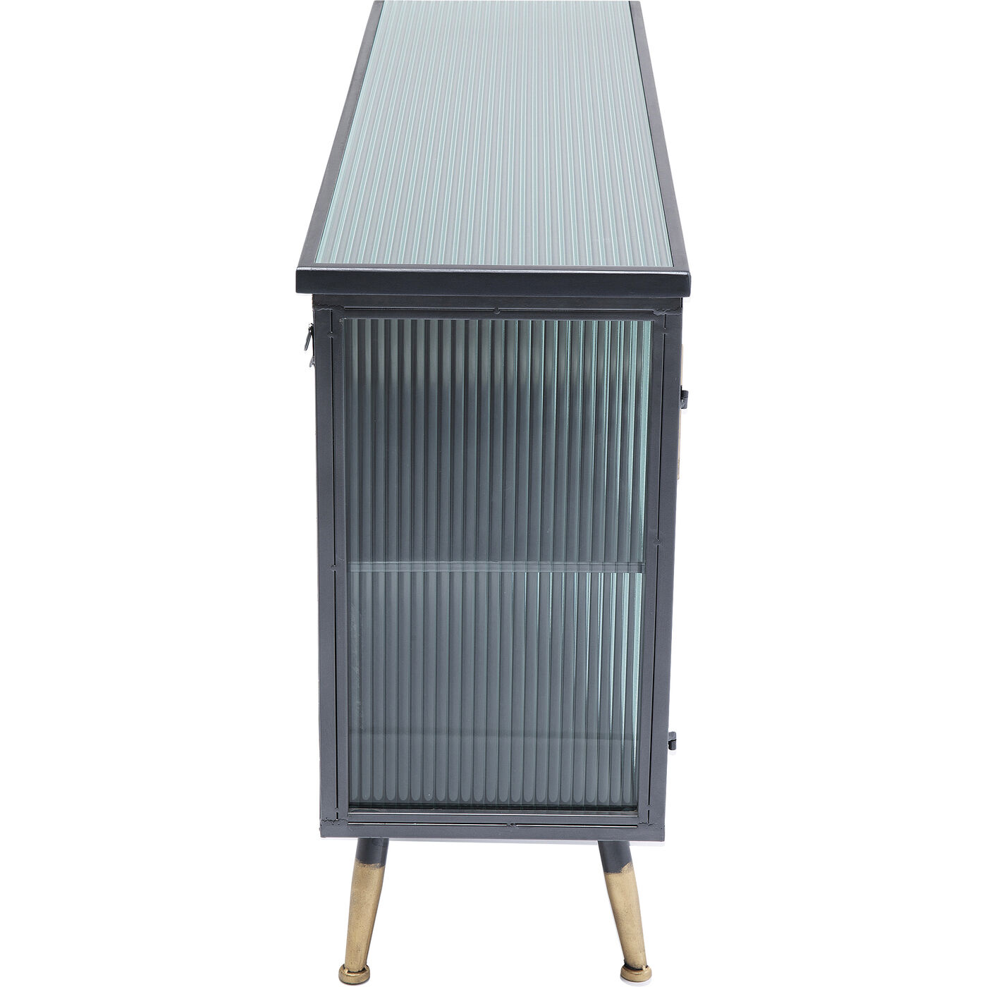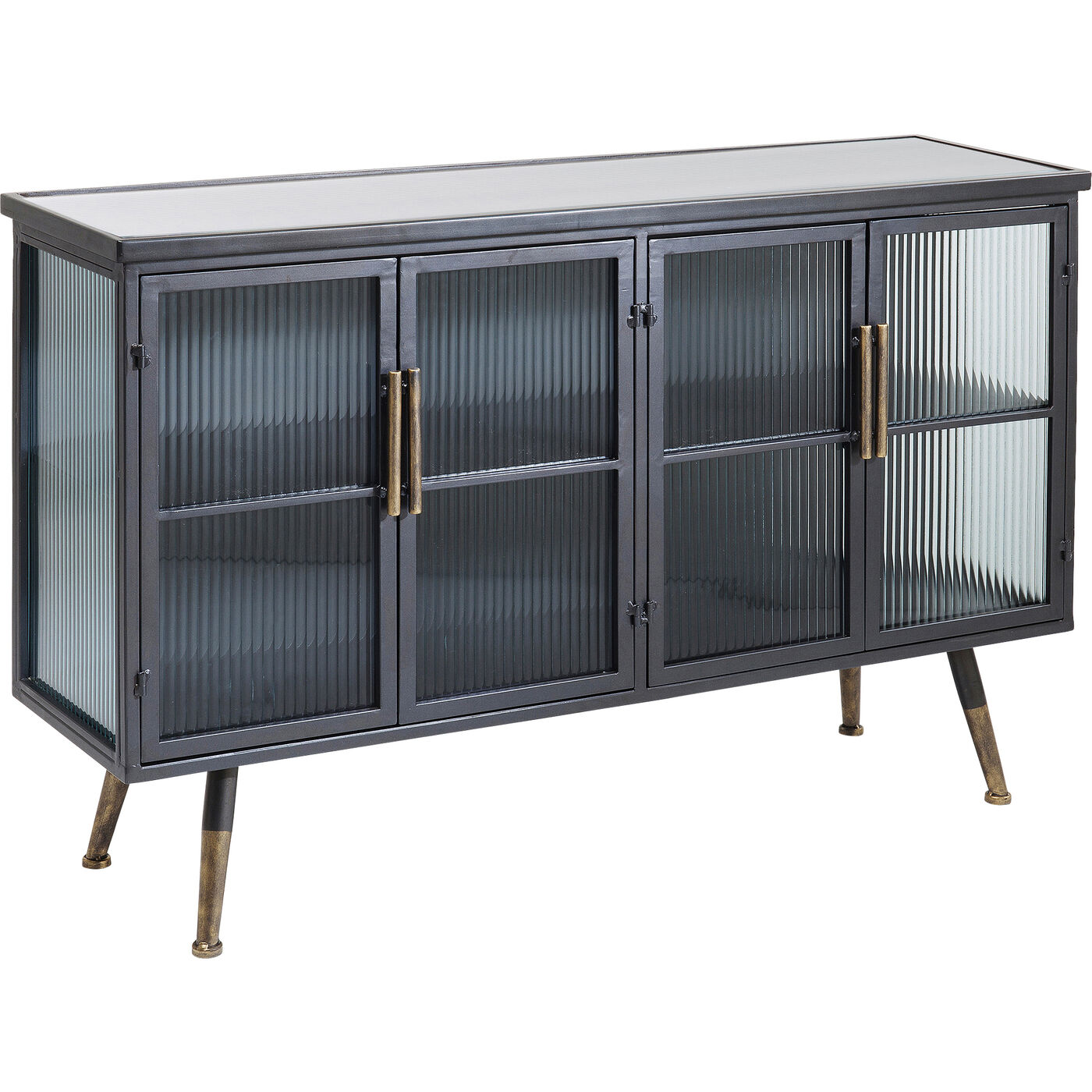 Beschichteter Stahl und Glas – das sind die Zutaten, die den lässigen Look dieses Sideboards prägen. Während die Konstruktion des Viertürers aus Stahl ist und den Industrial-Look zitiert, sind Fronten und Seiten aus gerilltem Glas – das gibt dem Sideboard eine gewisse Eleganz. Typisch für die Serie La Gomera, zu der verschiedene Schrankmodelle und Kommoden gehören, sind neben dem Material-Mix in Stahl und Glas die klare Linienführung und die leicht ausgestellten Füße.