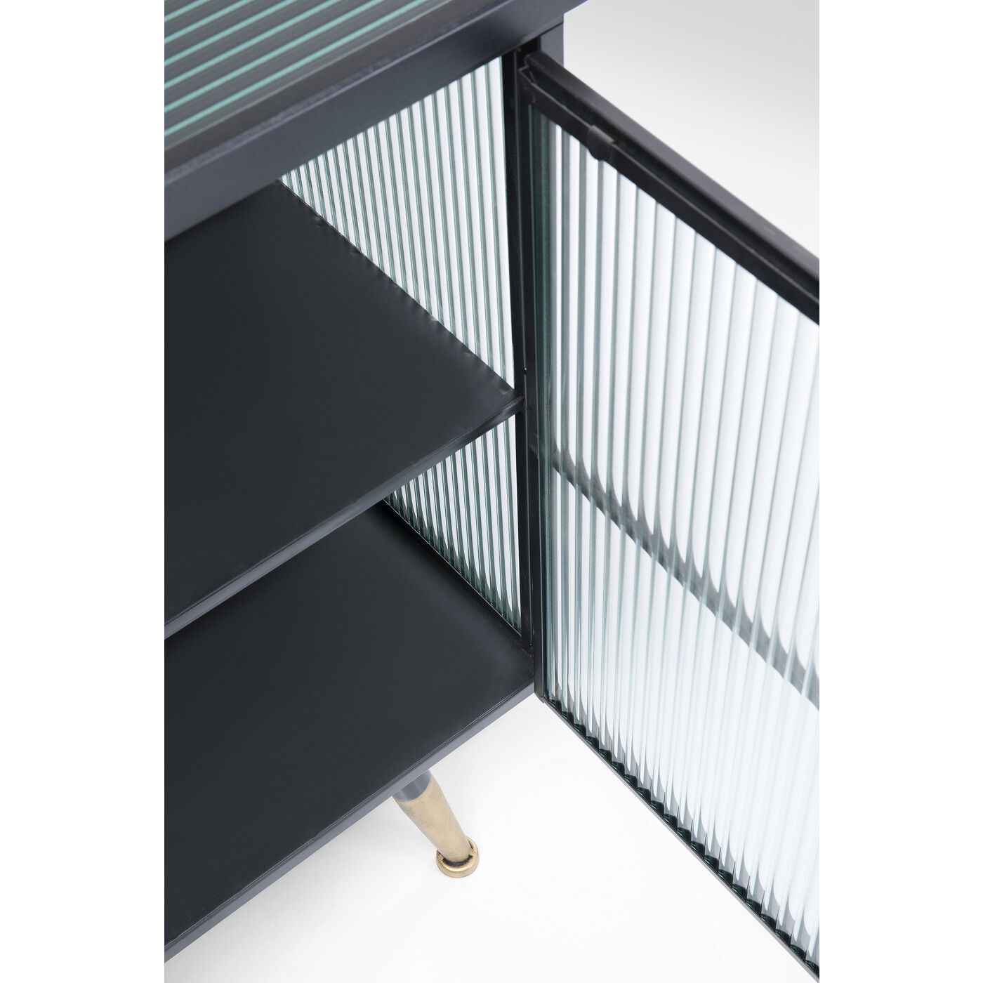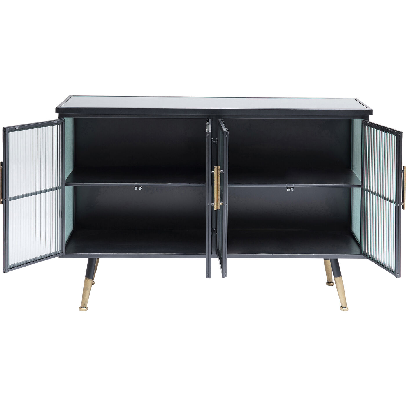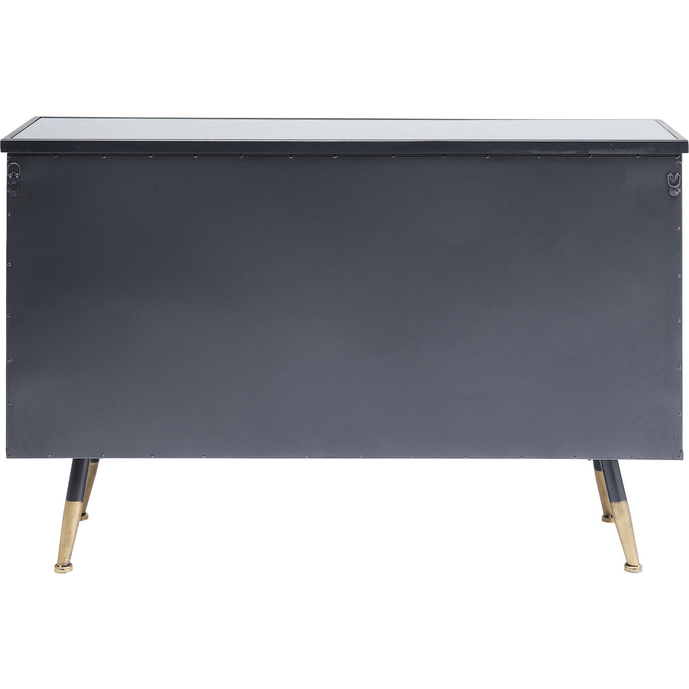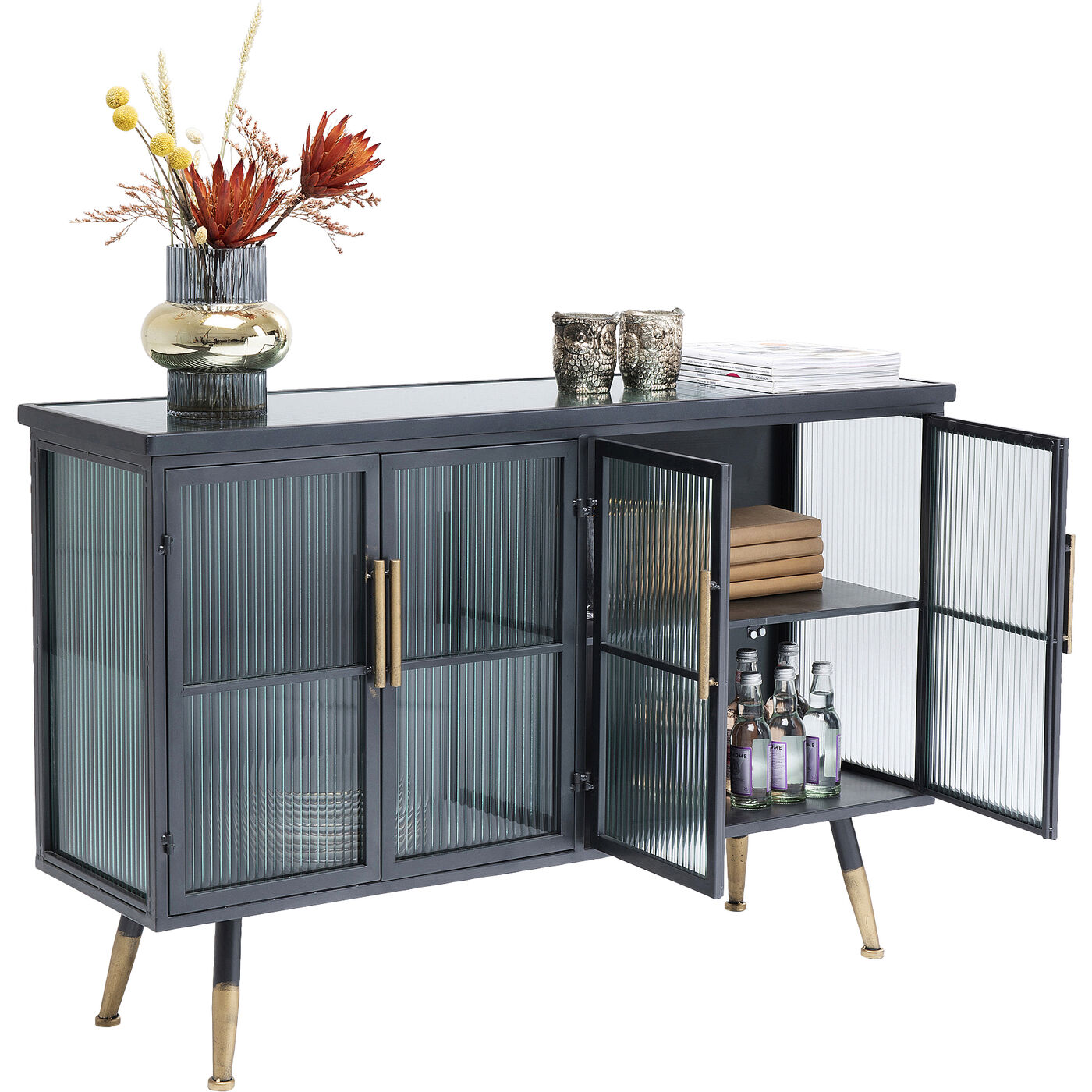 Beschichteter Stahl und Glas – das sind die Zutaten, die den lässigen Look dieses Sideboards prägen. Während die Konstruktion des Viertürers aus Stahl ist und den Industrial-Look zitiert, sind Fronten und Seiten aus gerilltem Glas – das gibt dem Sideboard eine gewisse Eleganz. Typisch für die Serie La Gomera, zu der verschiedene Schrankmodelle und Kommoden gehören, sind neben dem Material-Mix in Stahl und Glas die klare Linienführung und die leicht ausgestellten Füße.