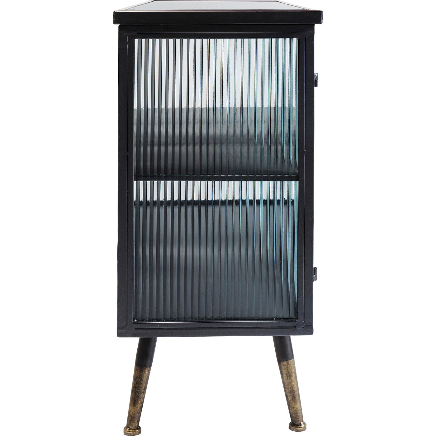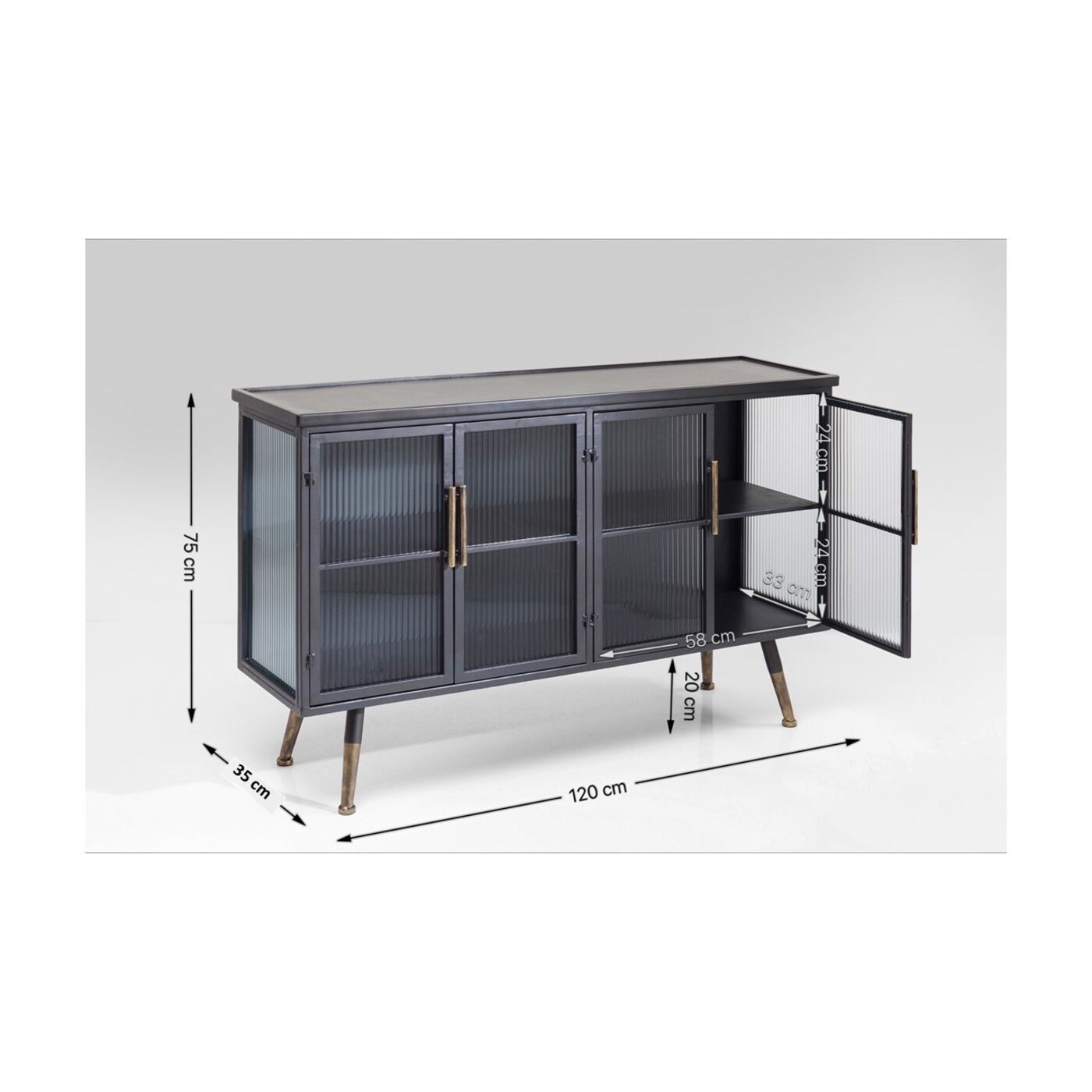 - Kleines Sideboard im Understatement-Look aus schwarzem Stahl mit Glaselementen und messingfarbenen Akzenten