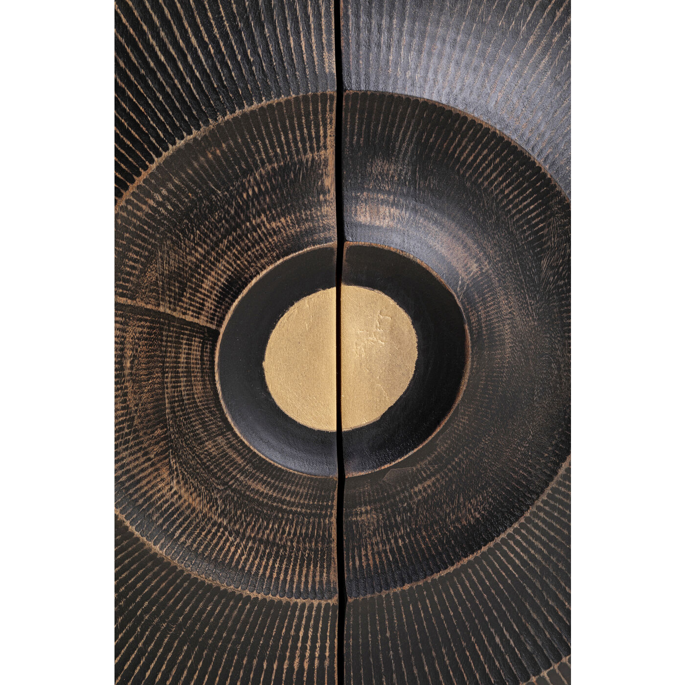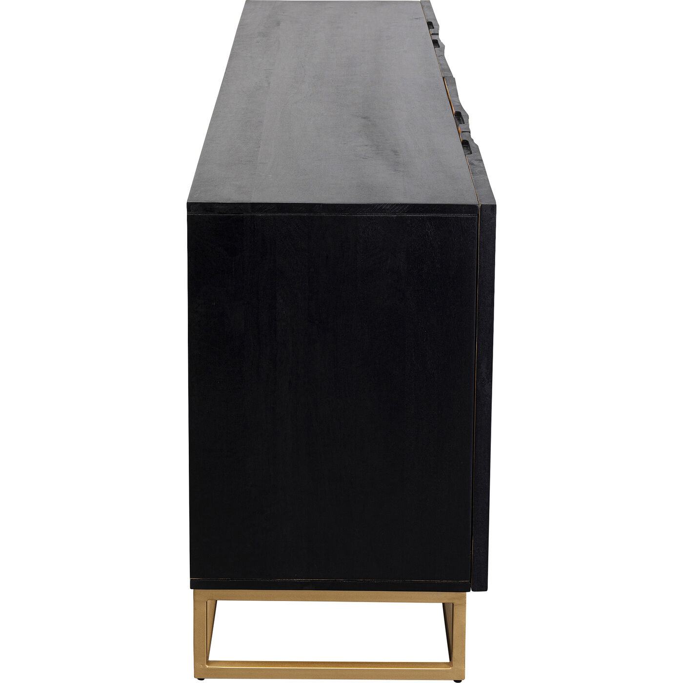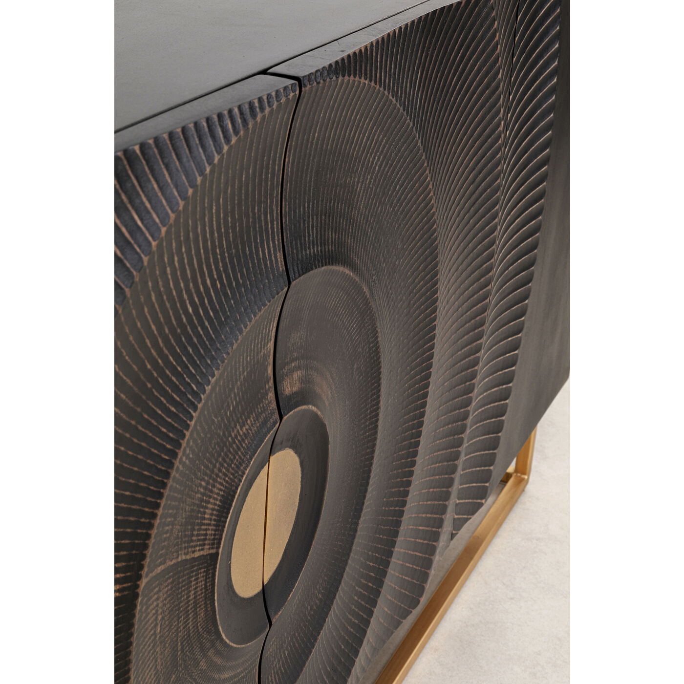 Mit diesem schwarzen Sideboard bringen Sie im Handumdrehen frischen Wind in Ihre vier Wände. Die cleane, rechteckige Form des Sideboards harmoniert mit der Gradlinigkeit des goldenen Metall-Gestells. Zum Lieblingsmöbel wird das Sideboard durch die individuelle Gestaltung der Front. Die rund angeordneten Schnitzereien erzeugen einen 3-D-Effekt und stellen nicht nur ein optisches, sondern auch haptisches Highlight dar. Dieses Einzelstück wurde zudem in Handarbeit gefertigt und verleiht jedem Raum einen unvergleichlichen Charme. Aus massivem Holz und pulverbeschichtetem Stahl gefertigt, spielt das Sideboard auch bei den gewählten Materialien in der Oberklasse mit. Auch als TV Board einsetzbar und mit genug Platz im Inneren mit 2 fest montierten Böden. Ein langlebiges Möbel, das seinen Wert mit Sicherheit behält.