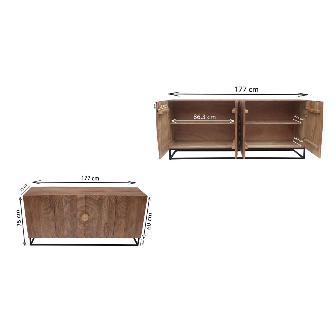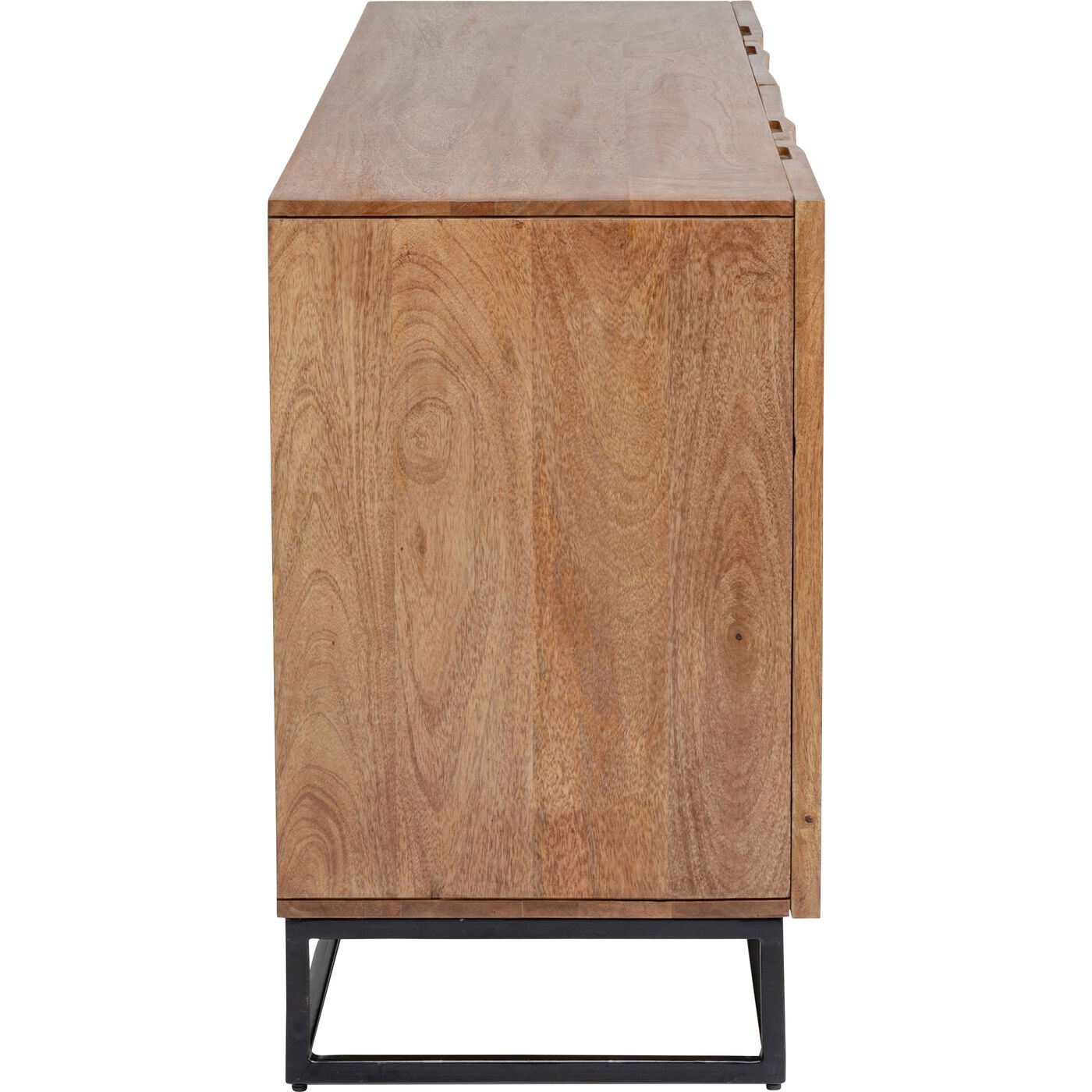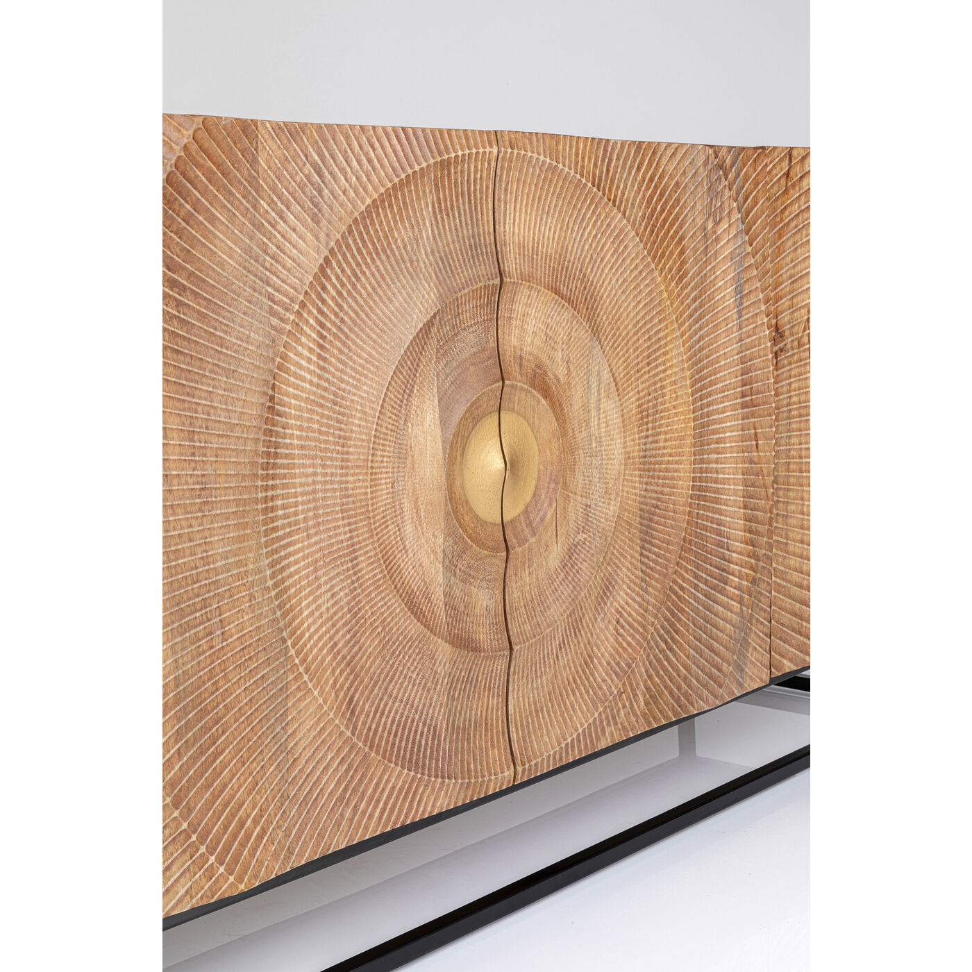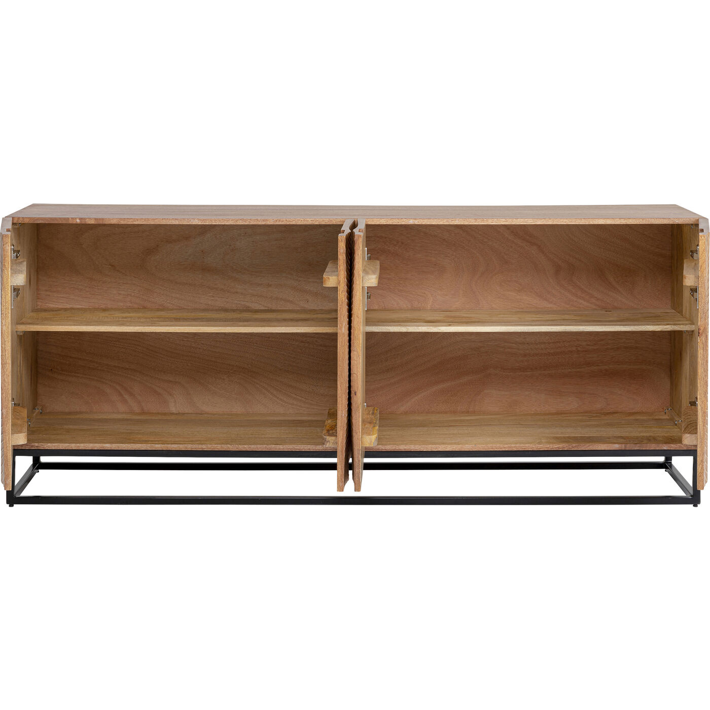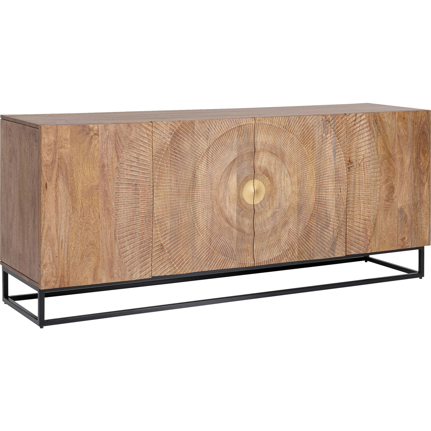 Mit diesem Sideboard aus hellem Massivholz bringen Sie im Handumdrehen einen neuen, wohnlichen Look in Ihre vier Wände. Die rechteckige Form des Sideboards harmoniert mit der Gradlinigkeit des schwarzen Stahl-Gestells. Die handwerklich gestaltete Front von Madeira macht das Sideboard zum Lieblingsmöbel, das Boho- und Ethno-Vibes verströmt. Dieses Einzelstück wurde in Handarbeit gefertigt und verleiht jedem Raum einen unvergleichlichen Charme. Aus massivem Mammutbaumholz und pulverbeschichtetem Stahl gefertigt, spielt das Sideboard auch bei den gewählten Materialien in der Oberklasse mit. Auch als TV Board einsetzbar und mit genug Platz im Inneren mit je einem fest montierten Boden. Ein langlebiges Möbel, das seinen Wert mit Sicherheit behält.