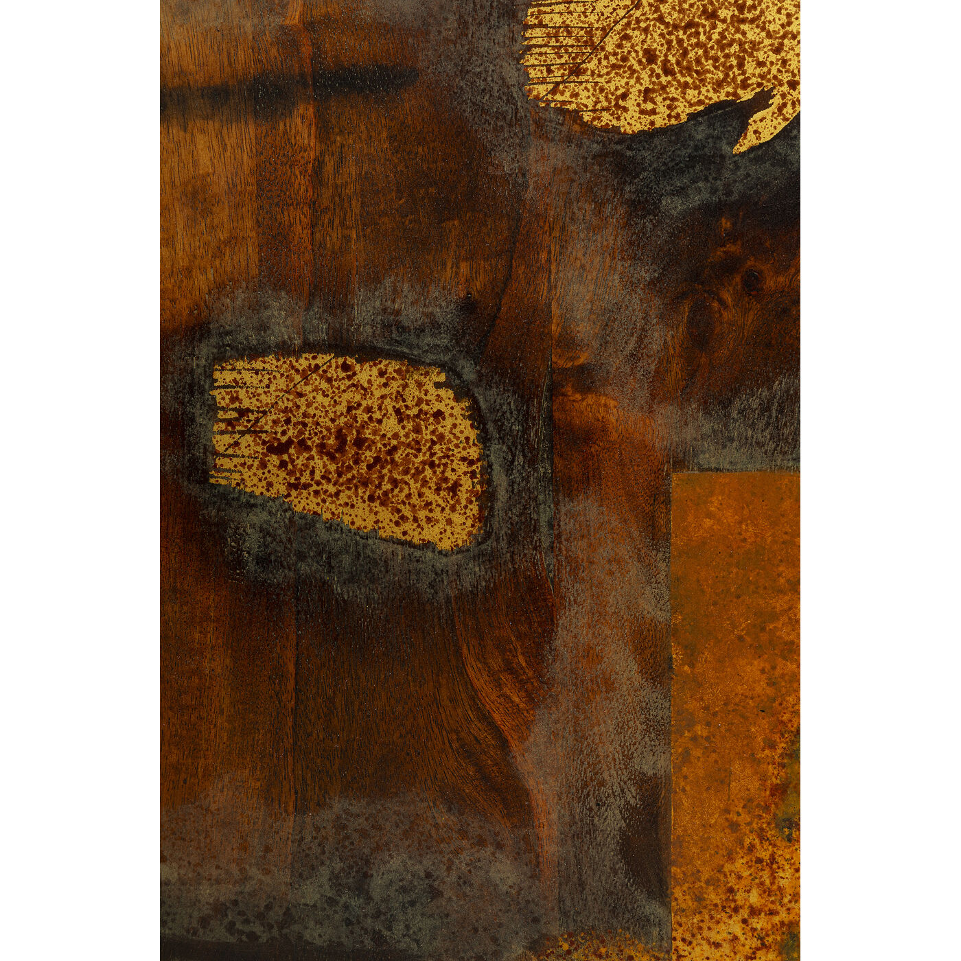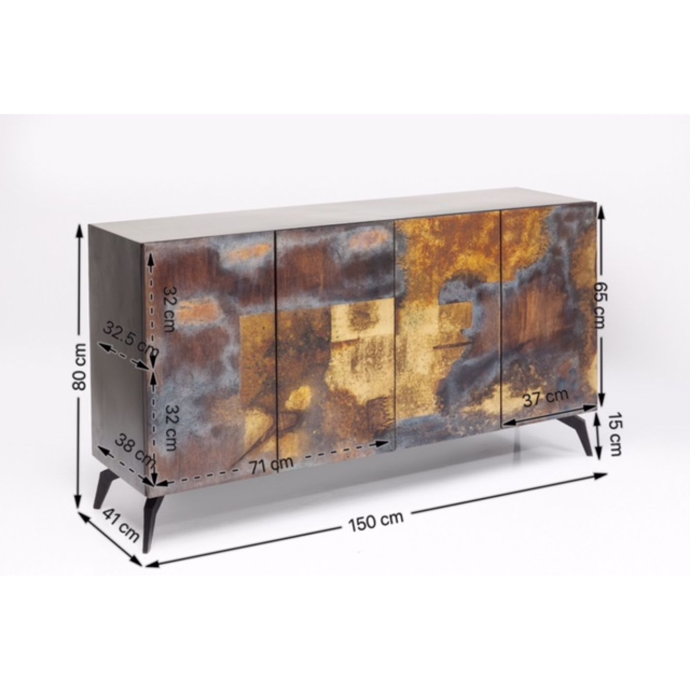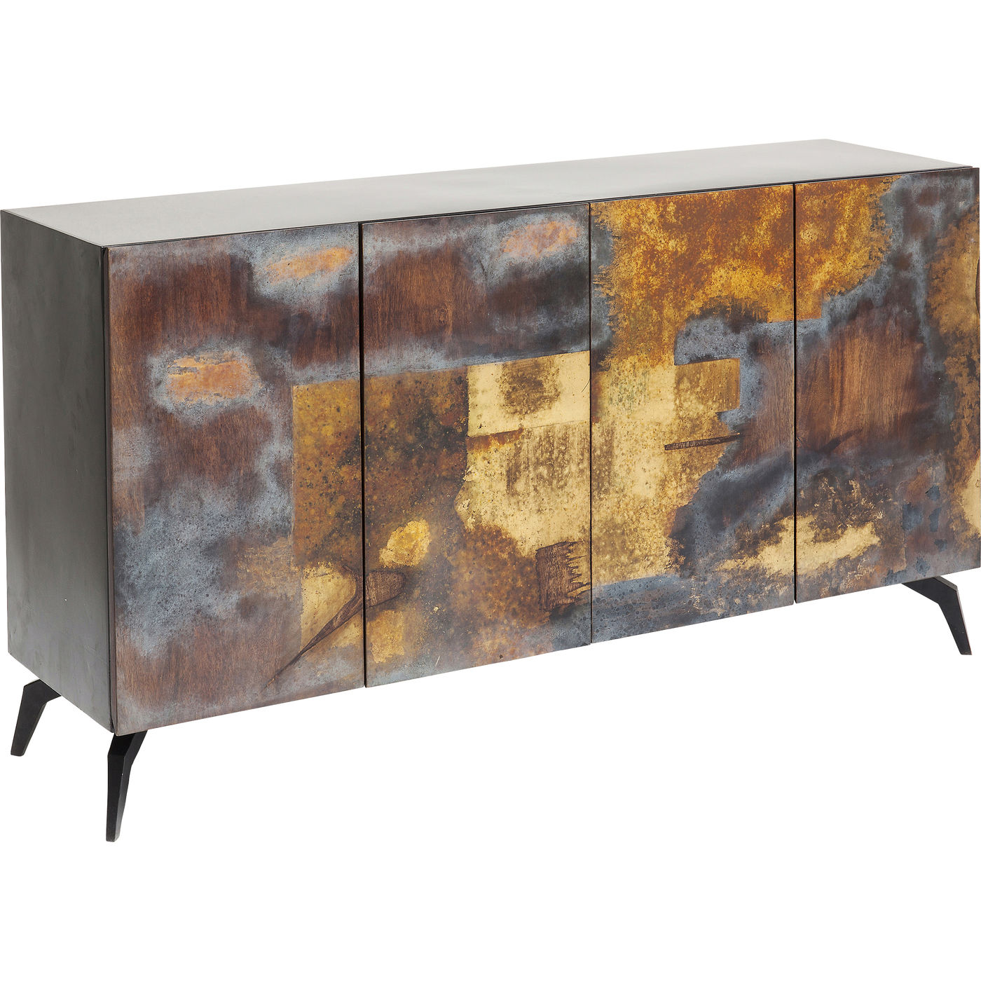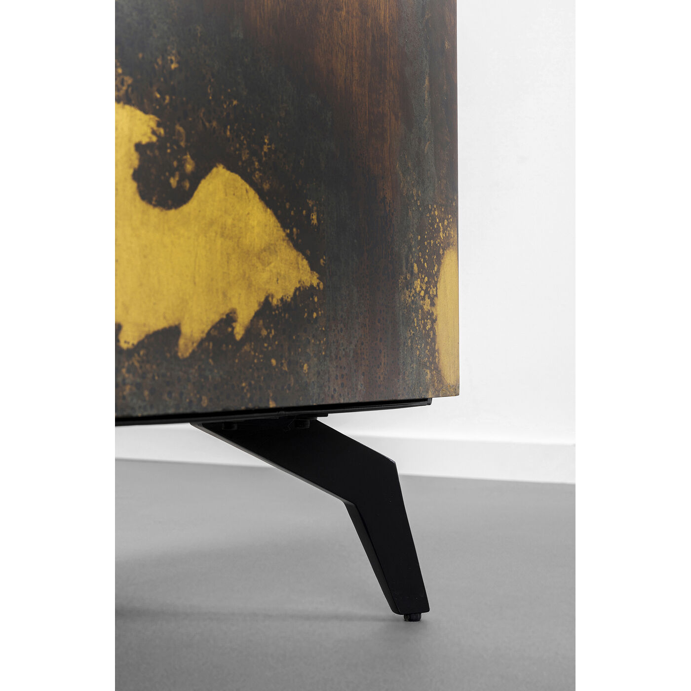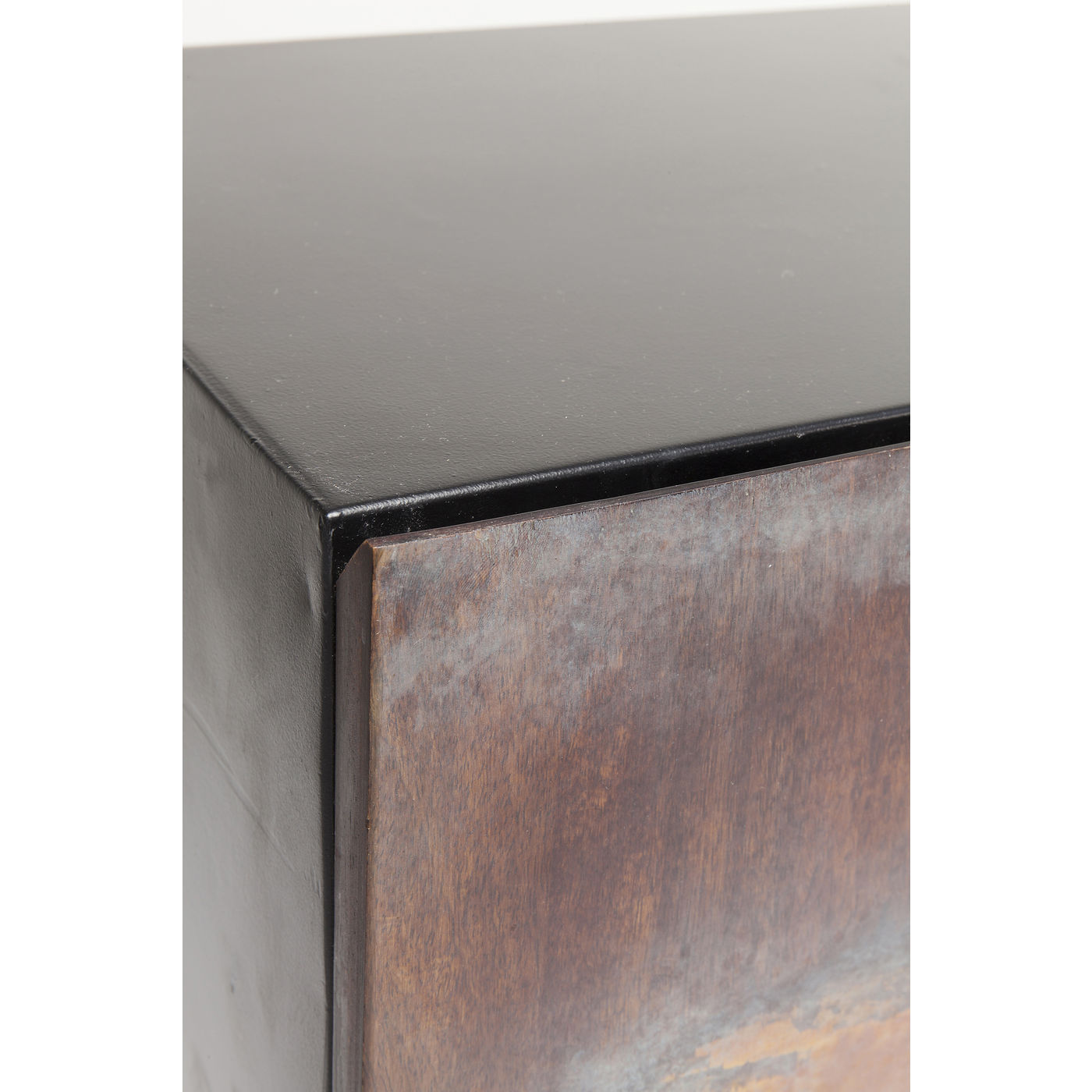 Ein Stück mit Seele: Die Türen aus Mangoholz wurden von Hand so bearbeitet, dass sie ein Farbspiel wie oxidiertes Metall zeigen. So wird aus dem schlichten, rechteckigen Sideboard ein besonderes Möbelstück im Industrial-Style mit auffälligen Füßen im Graphic-Look.