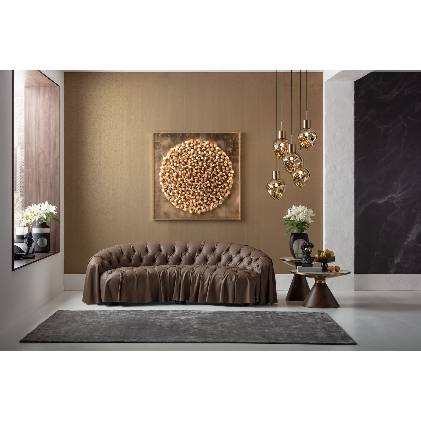 - Brauner Leder 3-Sitzer in runder Form mit üppig drapiertem Bezug
