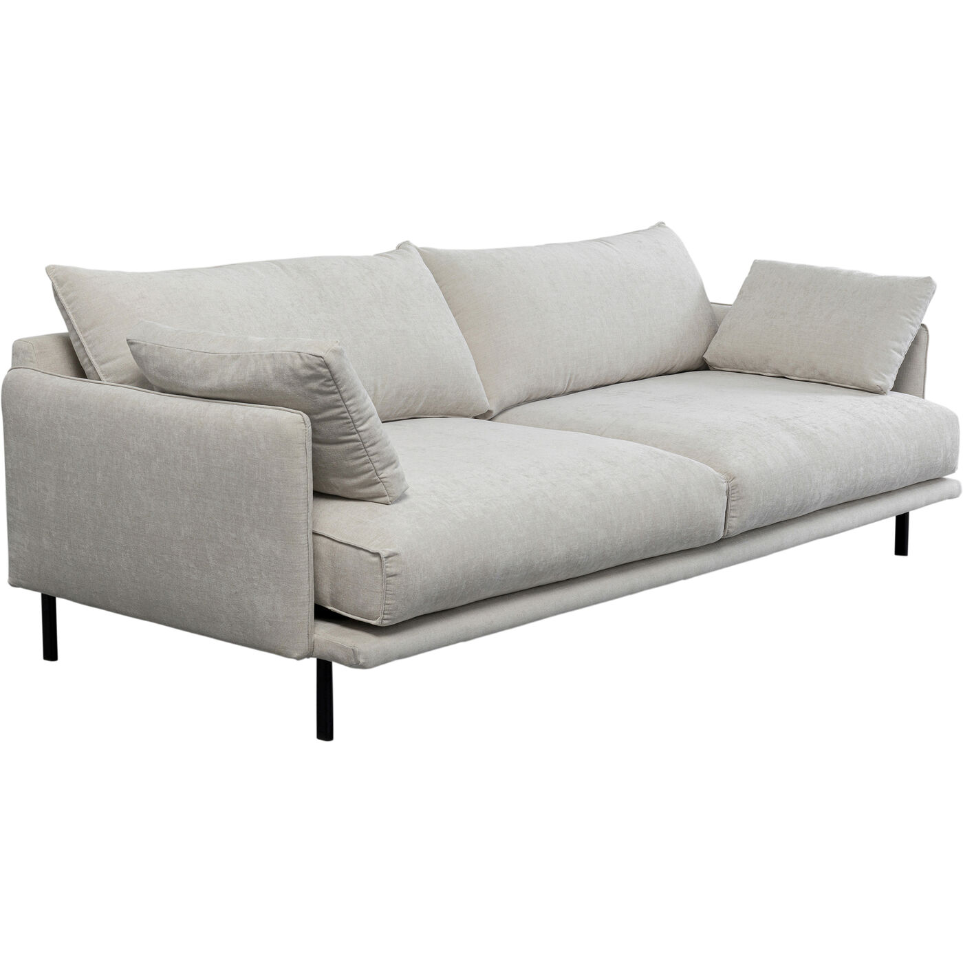 Im zeitlosen und zugleich modernen Stil überzeugt dieses creme-weiße 3-Sitzer-Sofa auf ganzer Linie. Seine Maße und sein Design machen es zum perfekten Basic für jede Wohnzimmer-Einrichtung. Dank seines klarlinigen Designs lässt es sich leicht mit Ihrem individuellen Einrichtungsstil kombinieren. Wer mehr Sitzplätze braucht, ergänzt das Sofa mit Hockern und Sesseln. Die Couch ist in bester Handwerkstradition gefertigt und mit einer Nosagunterfederung und Polsterschaum ausgestattet. Angenehm weich fühlt sich der feine Stoff des Bezuges aus Kunstfaser an. Die schwarzen Füße aus Metall sorgen für die leichtfüßige Optik und für Stabilität. Die angenehme Polsterung sowie die bequem gepolsterten Sitz- und Rückenkissen versprechen den gewünschten Sitzkomfort auf einer Sitzhöhe von 44 cm. Die losen Sitzkissen machen das Absaugen der Polster einfacher. Die Bezüge der Sitz- und Rückenkissen sind mit einem Reißverschluss versehen und abnehmbar. Wir empfehlen die professionelle Reinigung.