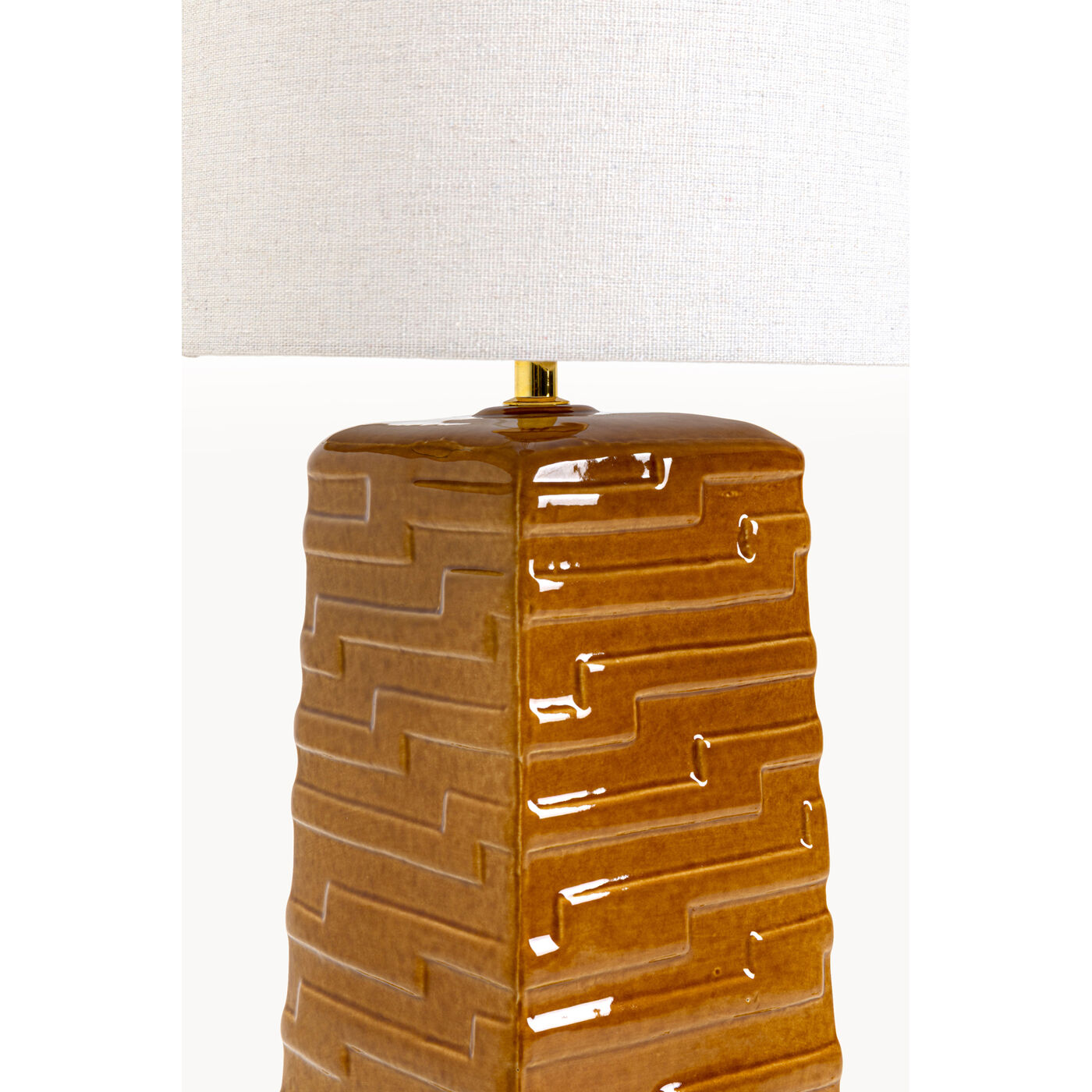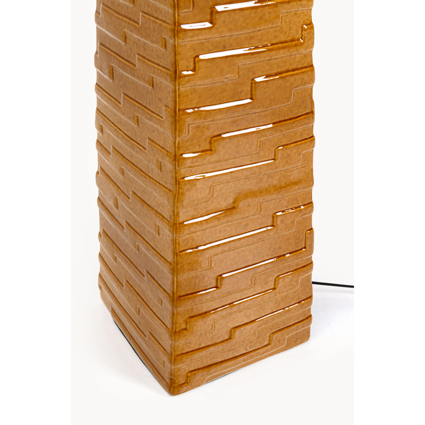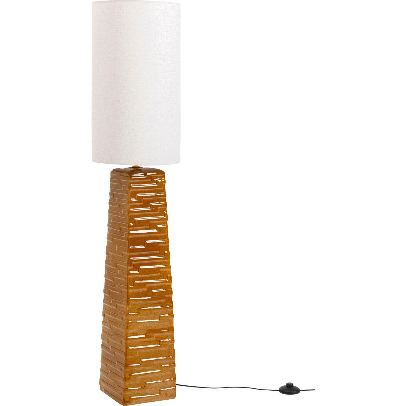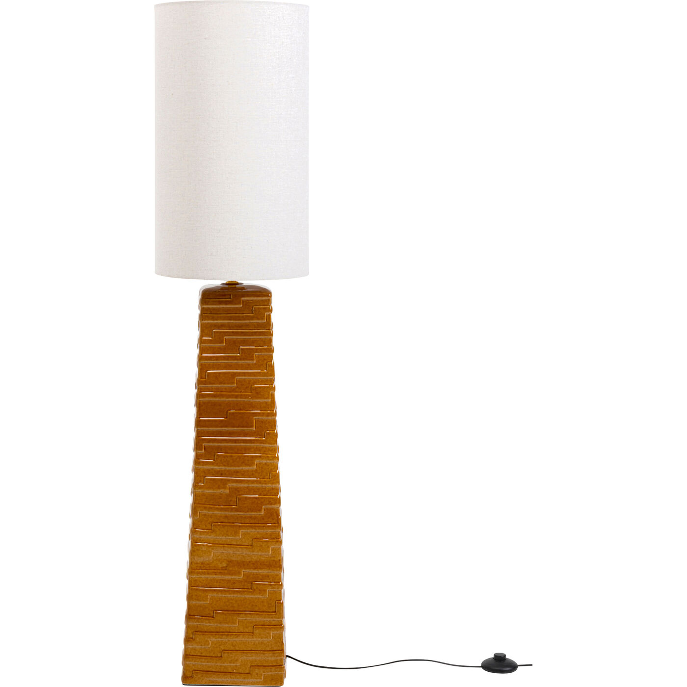 Gestell: Stahl gebürstet, Schirm: Baumwolle, Lampenfuß: Steinzeug glasiert, 260 cm Kabellänge, Tretschalter, Kabel kunststoffummantelt, teilzerlegt,