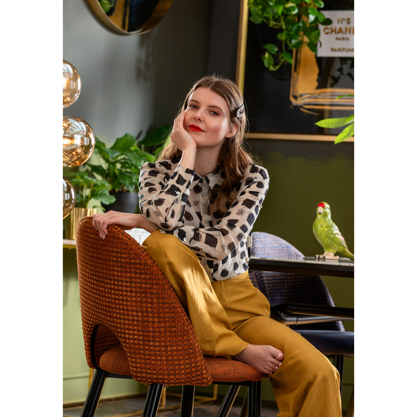- Blickfänger mit Grandezza: Polsterstuhl mit schwarz lackierten Beinen und Bezügen im Muster-Mix in Terrakotta