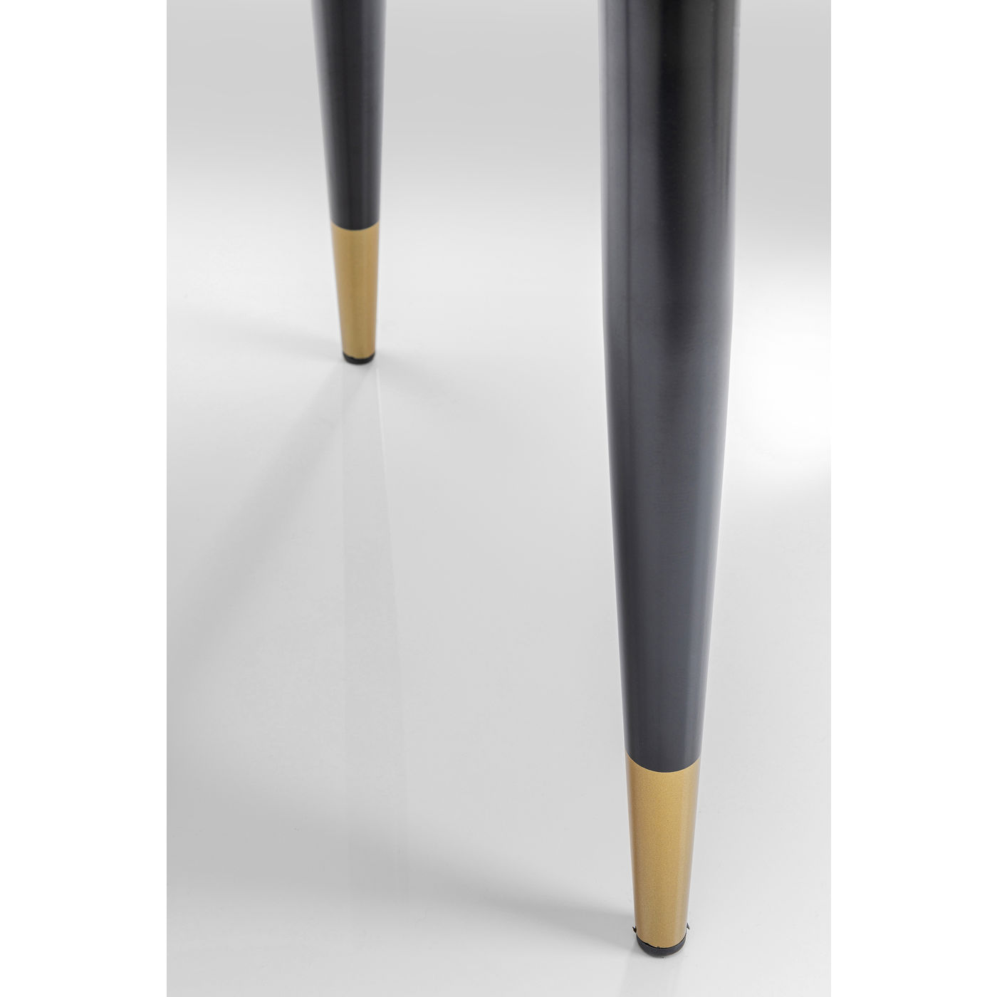 Der gekonnte Mix aus Form, Farbe und Material macht diesen Sessel zu einem besonderen Sitzmöbel. Seine schwarz lackierten Beine mit Goldmanschetten bilden einen charmanten Kontrast zu seinen Textilbezügen und zur flott geschnittenen Rückenlehne.