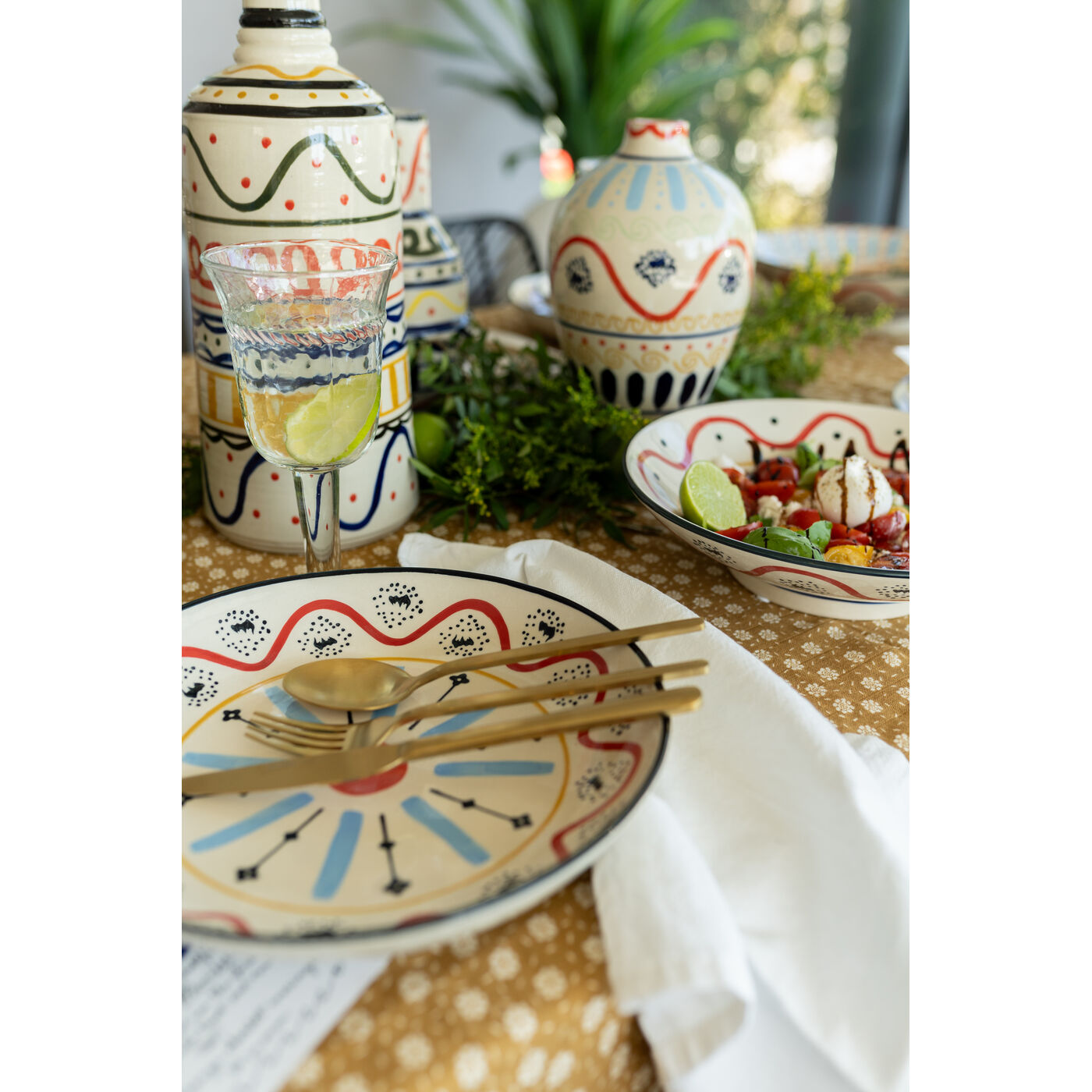 Buntes, gemustertes Geschirr aus Steinzeug versprüht einen faszinierenden dekorativen Charakter. Entdecken Sie unsere hochwertige Serie Los Cabos mit Tellern, Schalen, passenden Vasen und Dosen. Die lebendigen Muster und Farben erzählen Geschichten von Kultur und Handwerkskunst, denn alle Teile dieser Serie sind von Hand gefertigt und handbemalt. Auf beigem Grund finden sich auf Schalen und Tellern Muster in Blau, Rot und Schwarz. Das Material Steinzeug bringt ein rustikales und natürliches Flair in Ihr Zuhause. Mit dem Steinzeug-Geschirr schaffen Sie originelle und einladende Tischdekorationen, die sich in modernes Wohnen genauso gut integrieren lassen, wie in ein Landhaus-Ambiente. Aufgrund der Fertigung in Handarbeit ist Los Cabos nicht für die Mikrowelle oder Spülmaschine geeignet.
