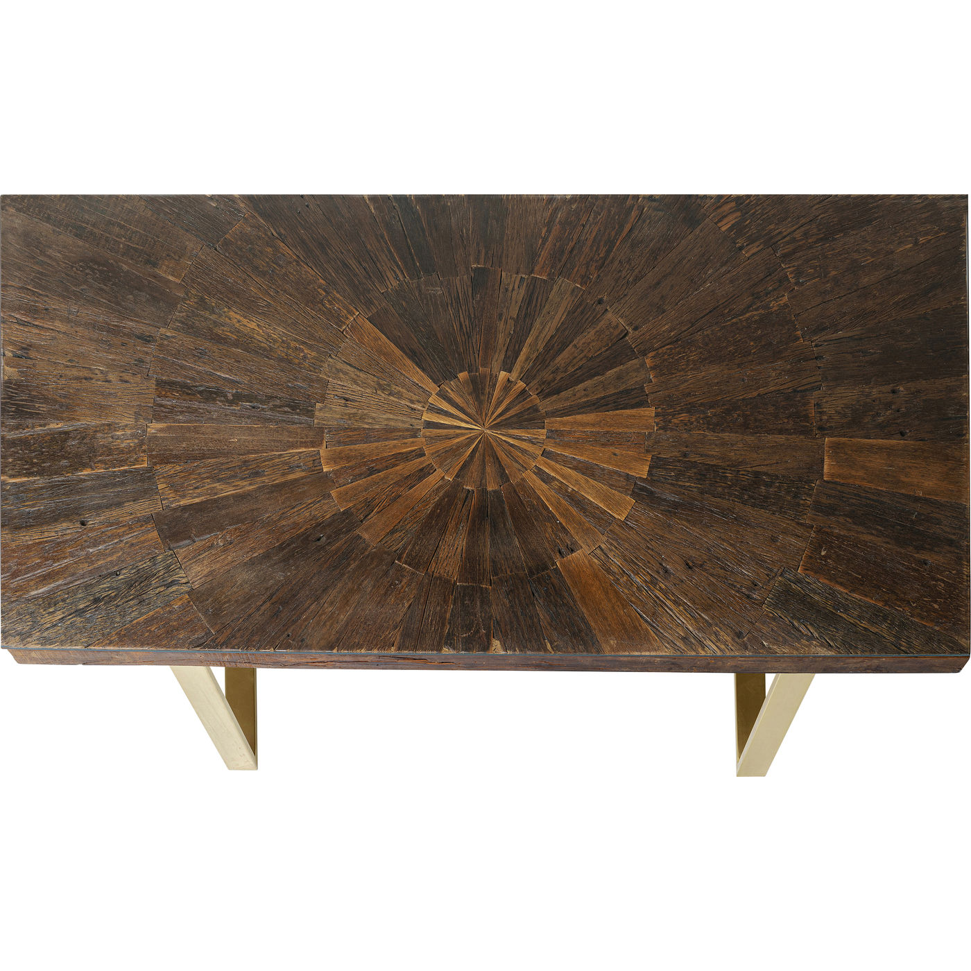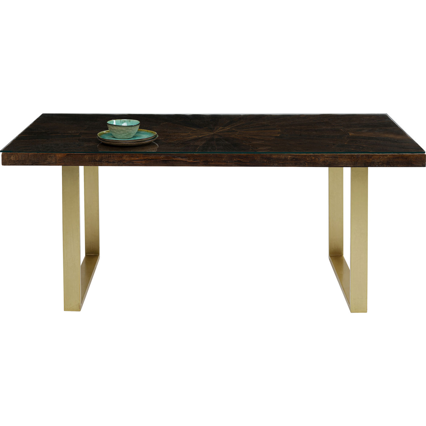 Tischplatte: Massivholz recyceltes Holz Mango lackiert, Massivholz recyceltes Holz Akazie lackiert, Glas Sicherheitsglas ESG klar, Beine: Stahl messing beschichtet, 7,50 cm Gestell - Fuß, 6 cm Plattenstärke, 40 kg max. Belastbarkeit, handgearbeitet, zerlegt