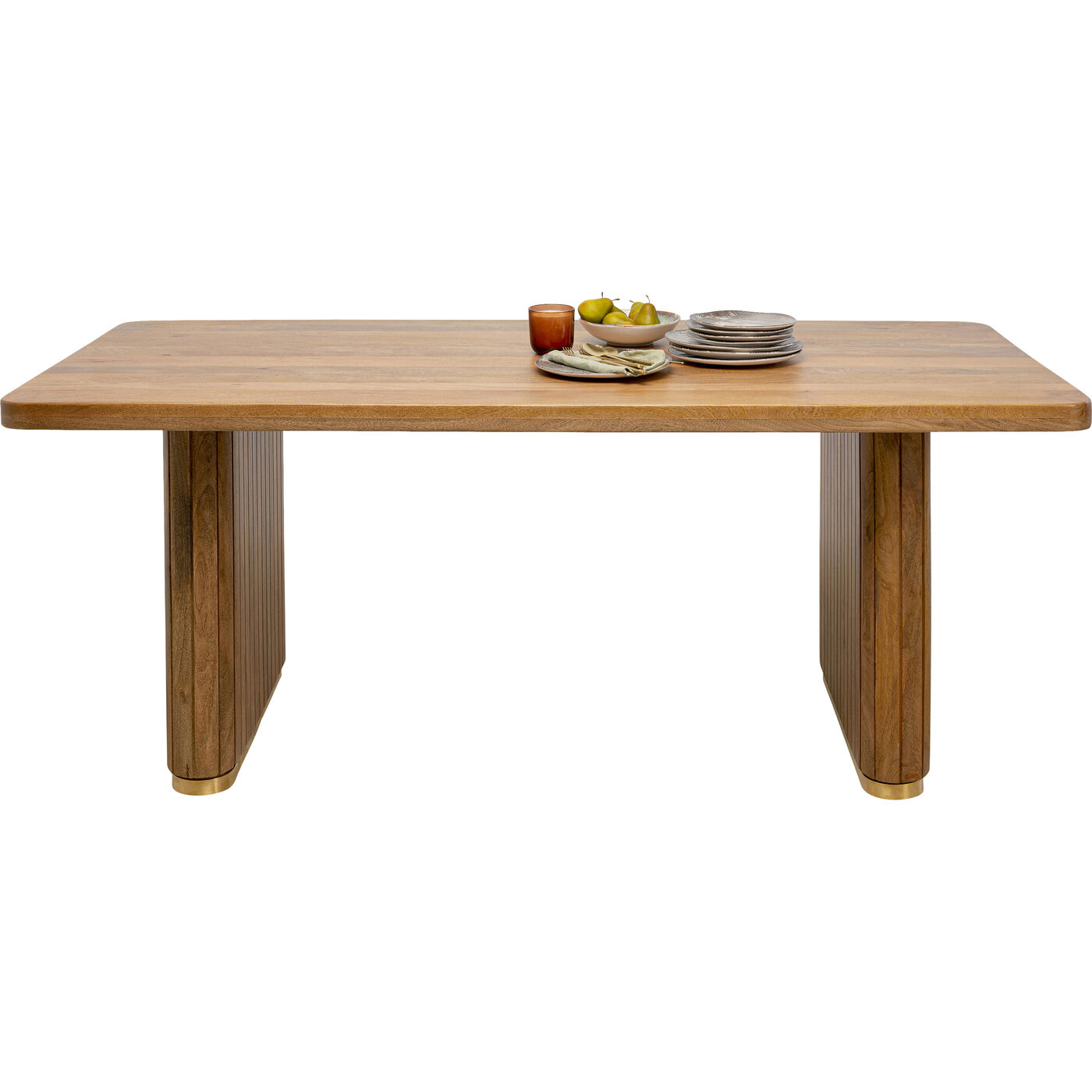 Die Modelle aus der Kollektion Grace bringen mit ihren sanften Rundungen Harmonie ins Wohnzimmer. Das liegt zum einen an der edlen Materialkomposition aus Massivholz. Zum anderen spielt die Kollektion mit Oberflächen wie hier mit dem strukturierten Wangengestell und der glatten Tischplatte. Dem Design des Tisches setzt eine messingfarbene Zierleiste am unteren Ende der Tischbeine die Krone auf. Sie schaffen mit diesem Holztisch nicht nur einen eleganten Essbereich. Er kann auch als Schreibtisch im Homeoffice dienen. Der Tisch bietet 4 bis 6 Personen Platz.
