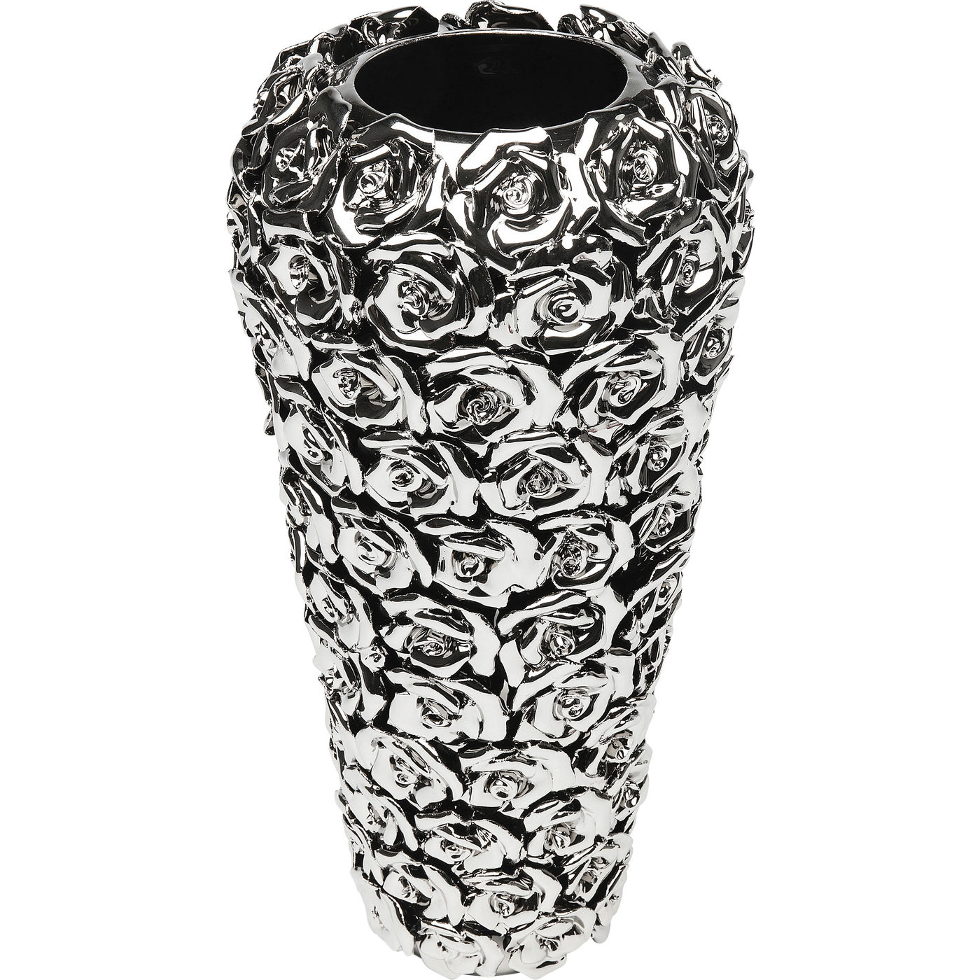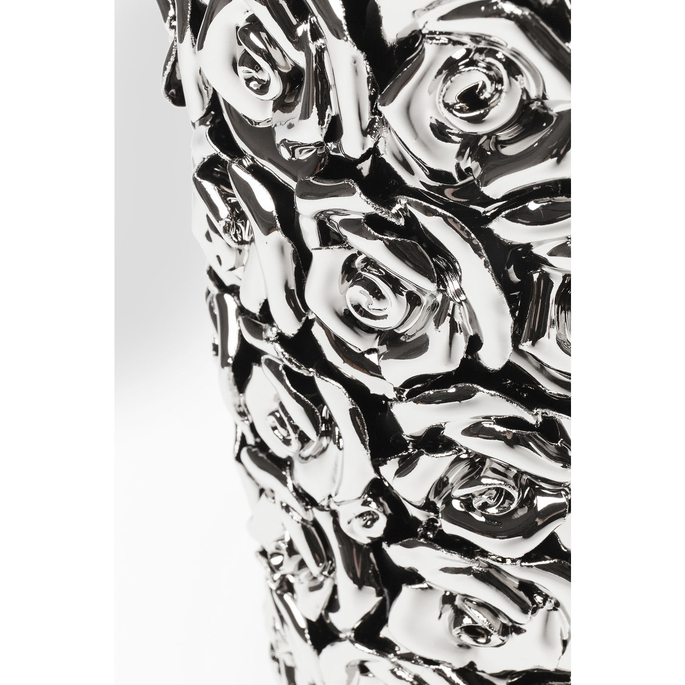 Diese Vase ist ein dekoratives Statement mit floraler Extravaganz: Die kunstvolle Rosenform wird durch ein silberglänzendes Finish veredelt, das je nach Lichteinfall elegant reflektiert und für glamouröse Akzente sorgt. Als Solist auf dem Sideboard oder stilvoll kombiniert mit Trockenblumen und filigranen Zweigen entfaltet sie ihren ganzen Charme. Besonders effektvoll in modernen Interieurs, zwischen Glasobjekten, hellen Tönen oder als Kontrast zu dunklen Materialien. Ein Designstück, das Poesie und Glanz vereint – verspielt, edel und voller Charakter.