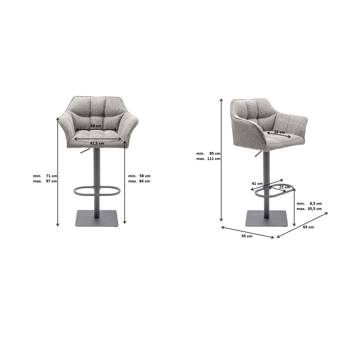 - Height-adjustable and rotating barstool with armrests in grey and a comfortable footrest