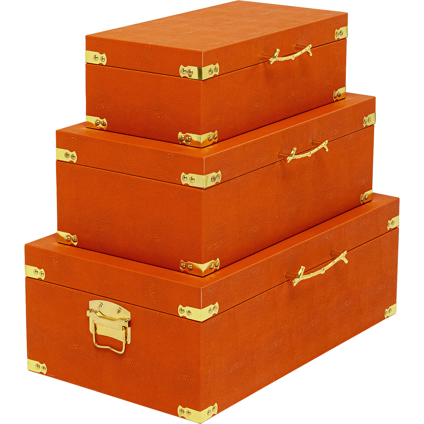 This elegant set of three large boxes in bright orange will keep any home tidy. Whether it s hats and scarves, blankets, cables, documents or personal treasures, these storage boxes offer stylish storage space. Covered with coated fabric in a rayskin look, the boxes will add a touch of elegance to any room. The gold-coloured steel handles and fine details underline the luxurious look and make the set a real head-turner.