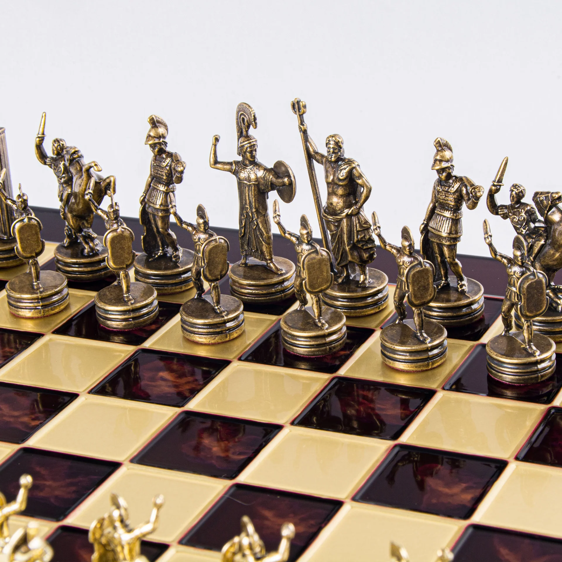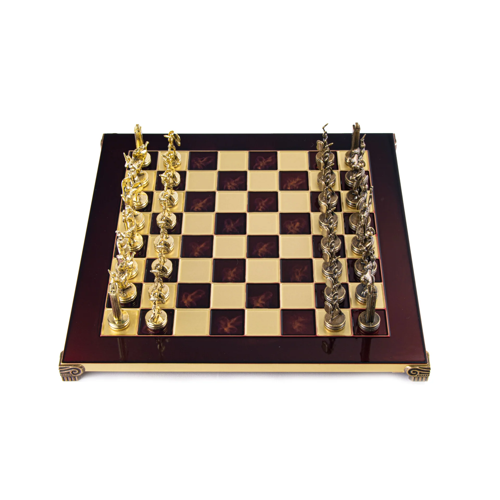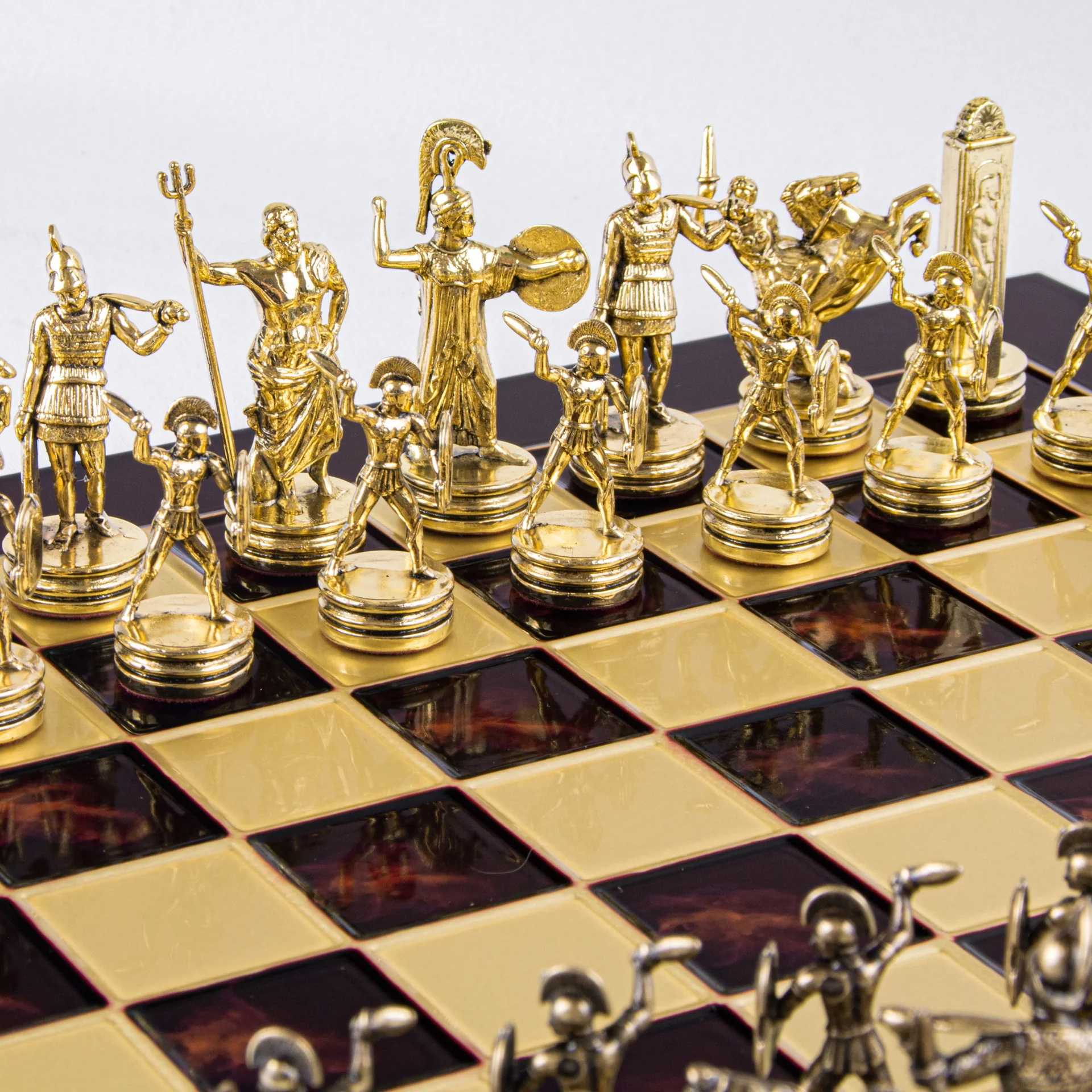 Griechische Bildhauer liebten es, diesen göttlichen Konflikt in ihrer Kunst nachzustellen. Der König ist eine Nachbildung der berühmten Statue "Poseidon von Melos" (2. Jh. v. Chr.), und die Königin stellt die glorreiche "Athena Promachos" (450 v. Chr., Akropolismuseum) dar. Eine hellenistische Bronzestatue hat den Bischof inspiriert und der Ritter ist ein Teil der Marmorfassade des Parthenon, die von Pheidias geschaffen wurde. Die Burg ist eine Nachbildung einer der bewundernswertesten attischen Stelen, die dem jungen Aristion gewidmet ist, der in der Schlacht fiel. Der Bauer schliesslich ist eine Bronzestatue eines voll bewaffneten Kriegers aus dem Jahr 500 v. Chr.