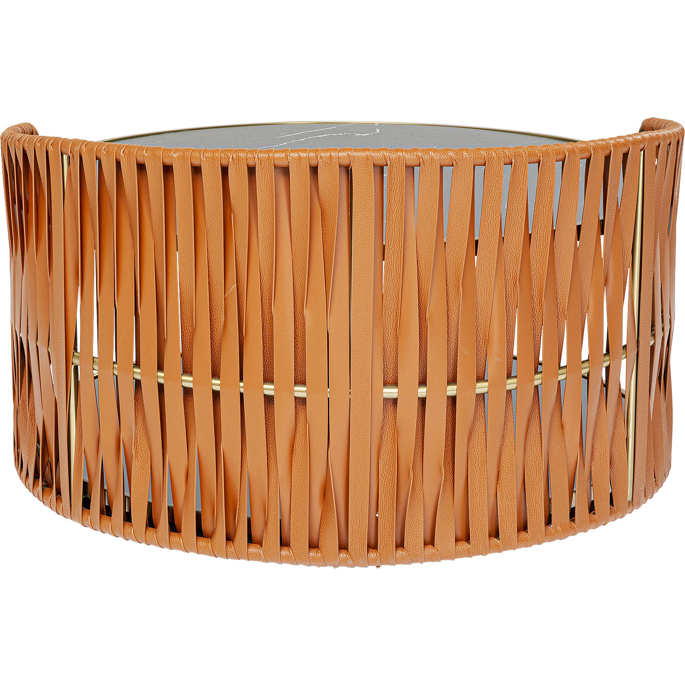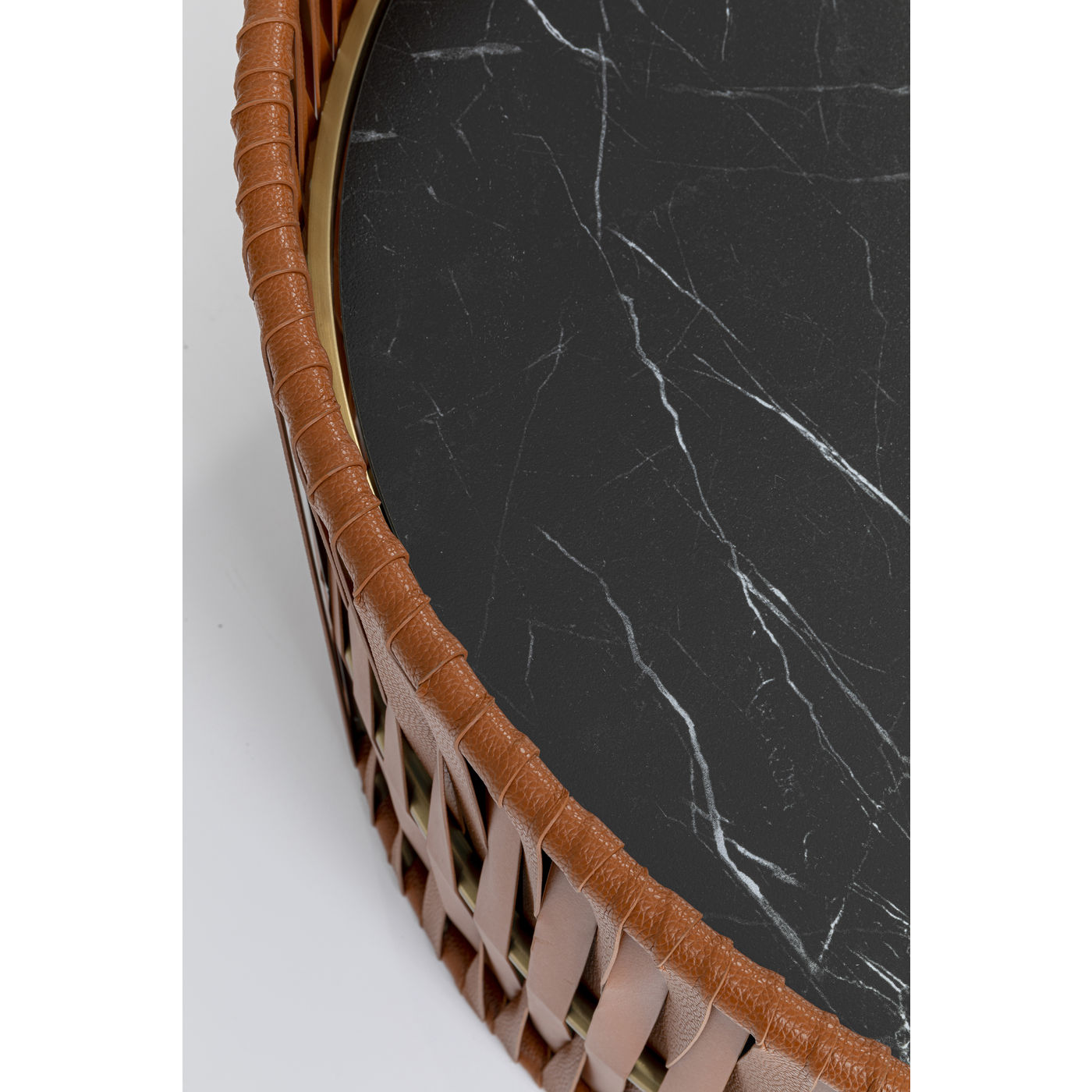 - Brass sheen, a marble finish and the brown leather-look straps give this side table a luxurious, unique character