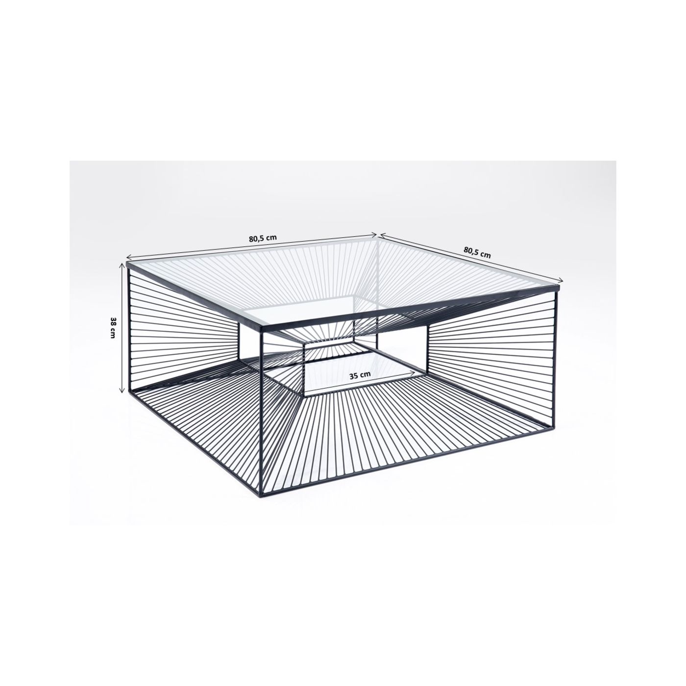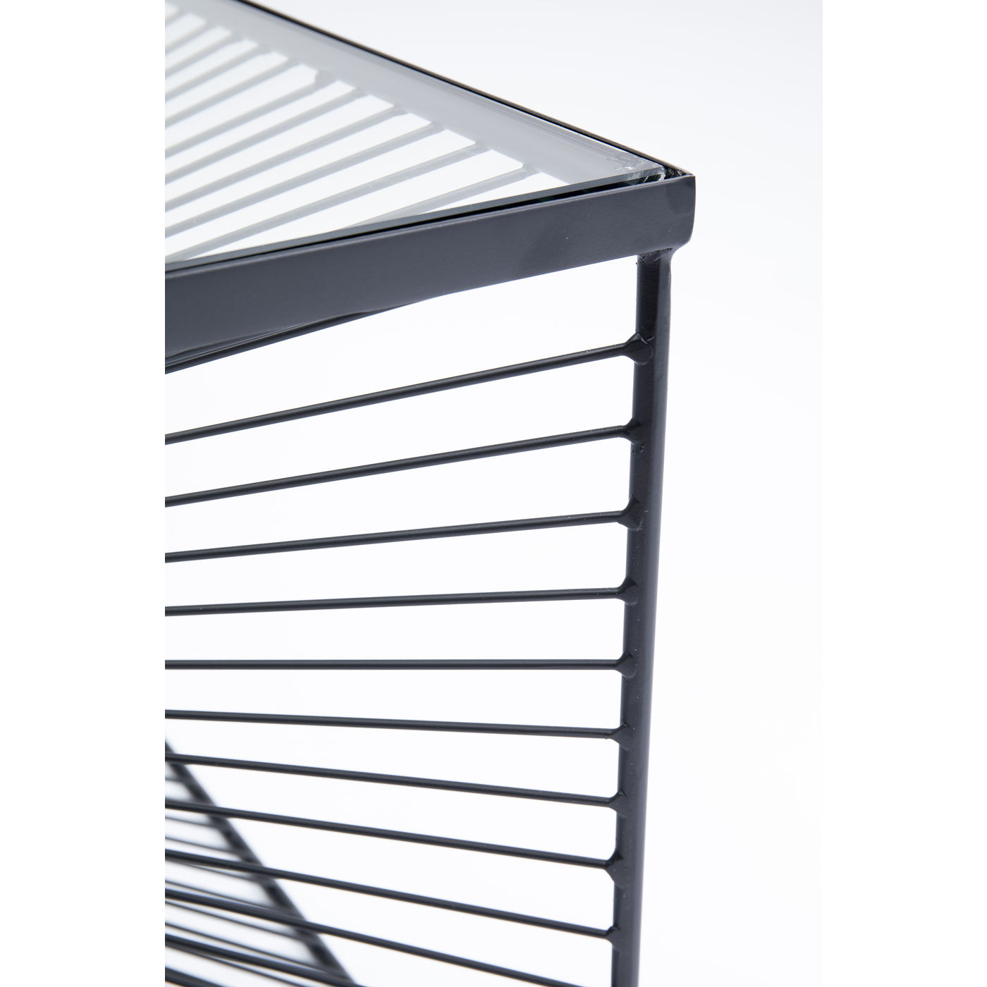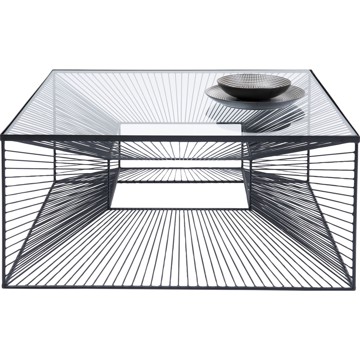 - Black coffee table with clear glass table top, which looks like a modern art object due to its graphic steel wire frame