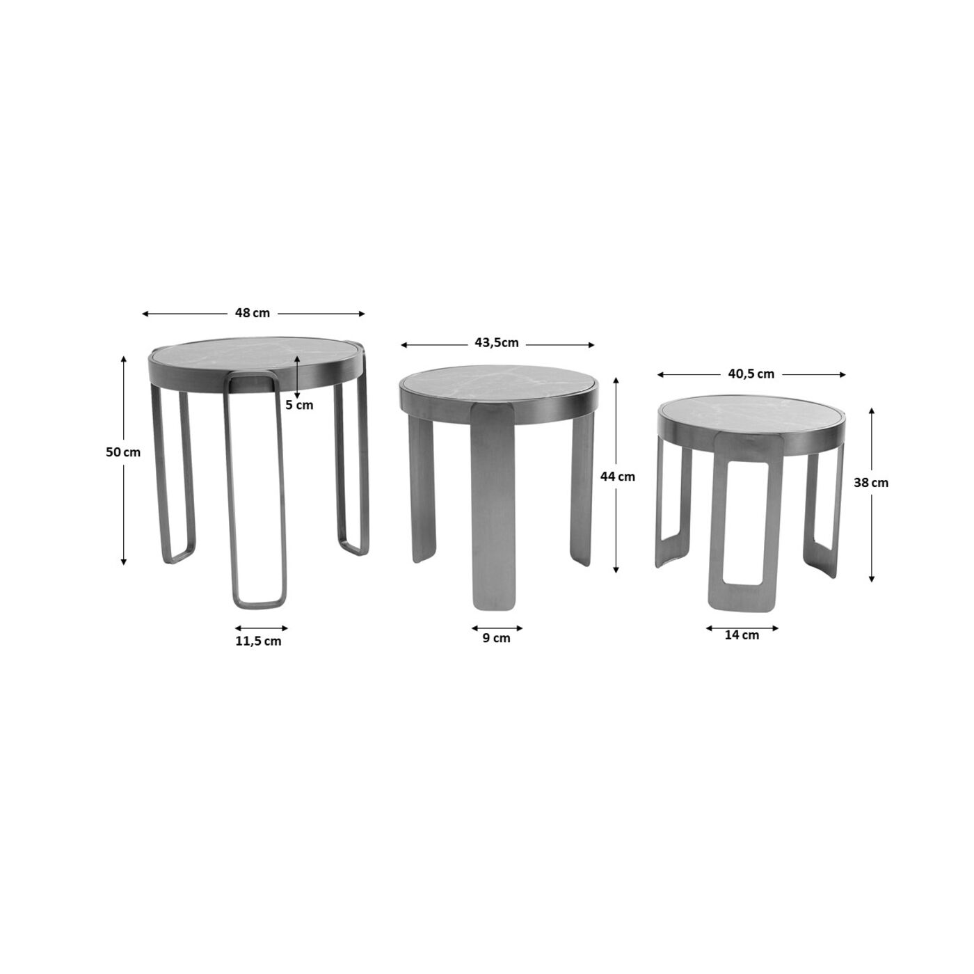 - Extravagant side table in a set of 3: Three round coffee tables in the trend colour bronze in different sizes and with a noble marble print