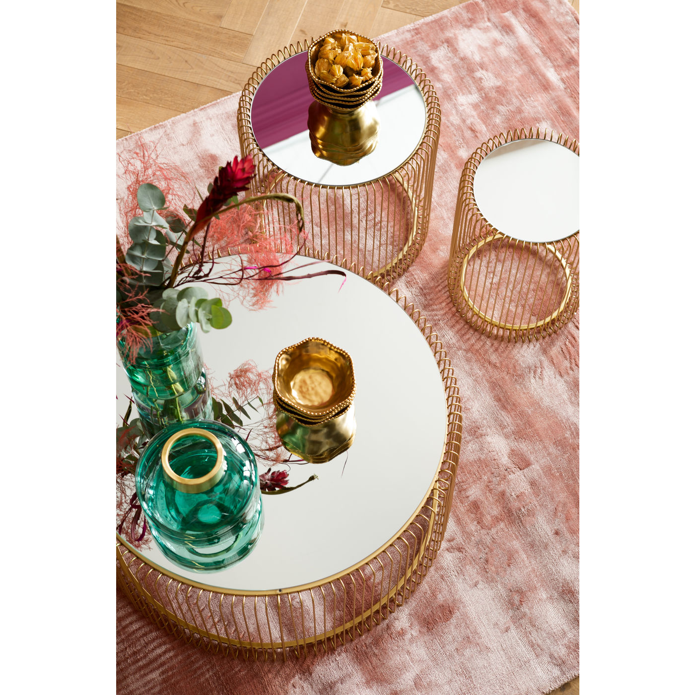 Coffee tables are just like handbags - they add the final touch to your look. This side table impresses not only with its shiny wire frame in a warm brass tone. The mirrored top is a special feature that accentuates your decorative arrangements particularly well. Many similar models available.