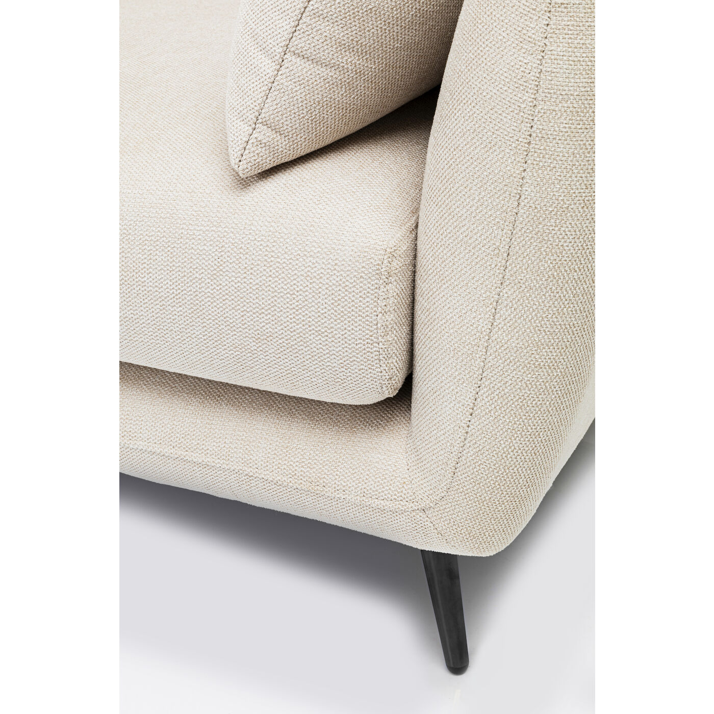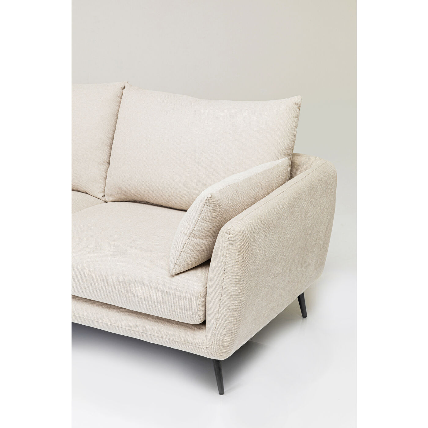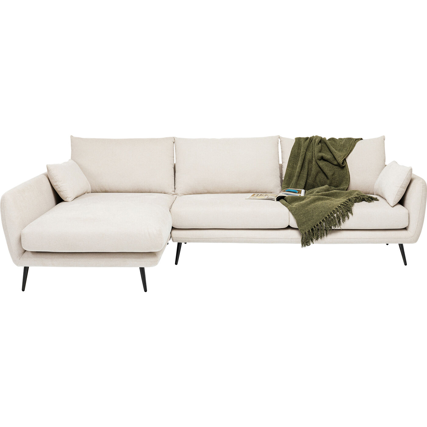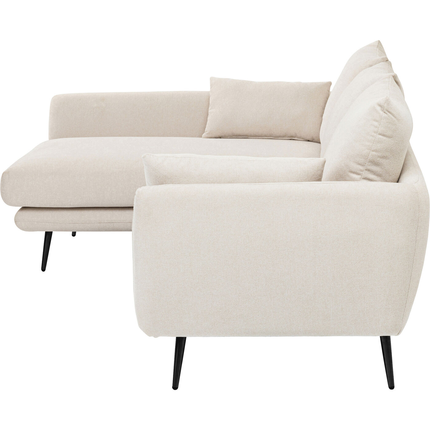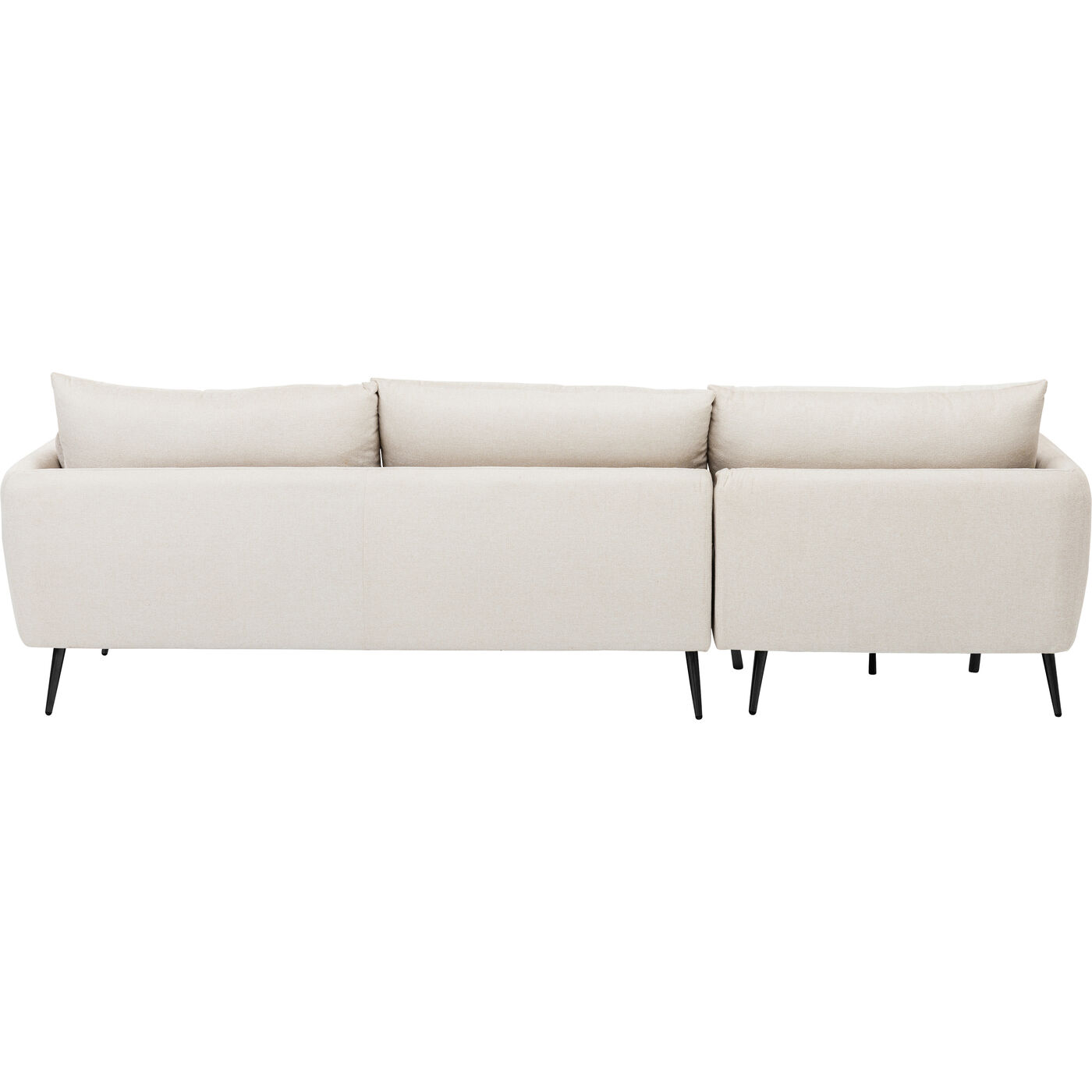 This corner sofa with ottoman on the left makes ideal use of the space in your living room. Thanks to the all-round upholstery, the sofa also cuts a good figure when placed freely in the room. The light cream cover can be combined with other natural shades as well as intense colours, and the black legs give this piece of furniture timeless elegance. The couch therefore suits every style of furnishing, whether modern or Scandinavian, minimalist or retro.