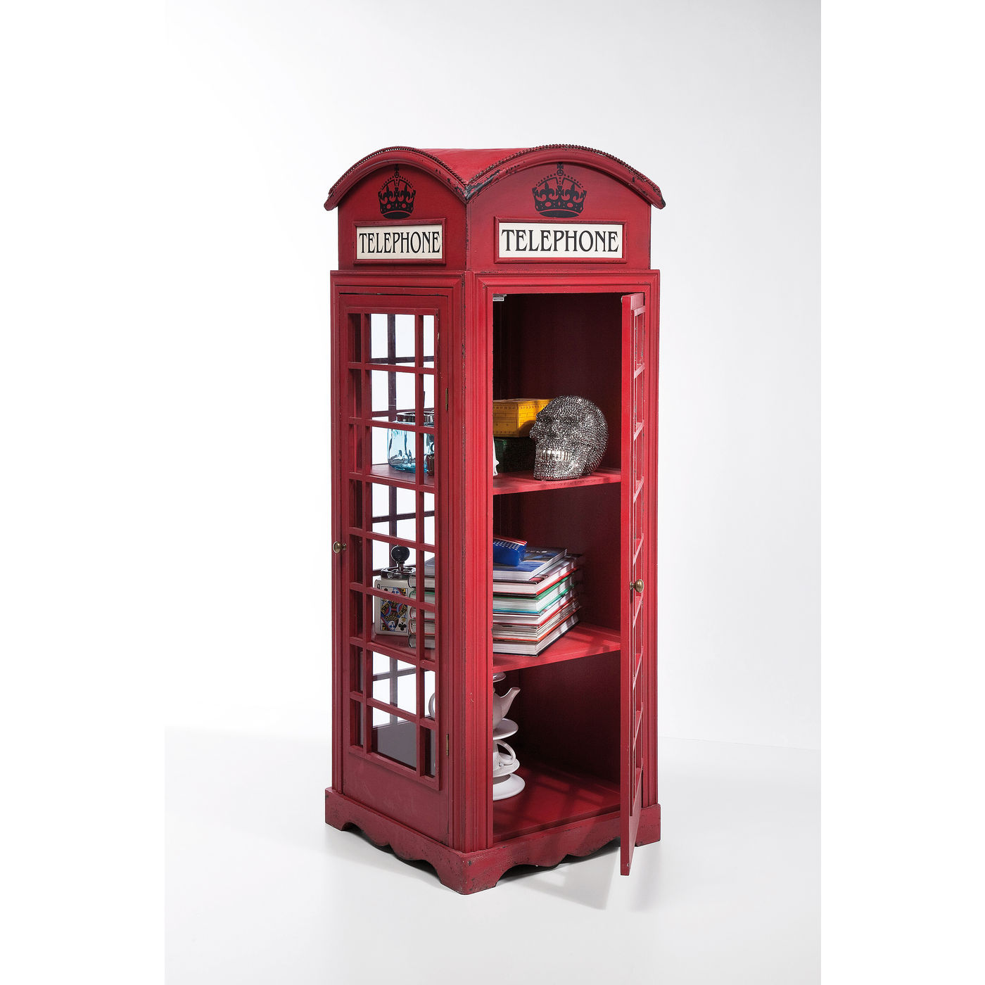 A striking glass cabinet in an impressive design – this out-of-the-ordinary cabinet is a highlight of British interior design! This original cabinet makes an impression which is anything but dusty. On three levels the much-loved telephone box provides lots of room. It refreshes everyday life in a typical British way and matches a range of furnishing styles. In a bright red, high-quality finish. A charming eyecatcher with antique flair. Further articles available in this original style.
