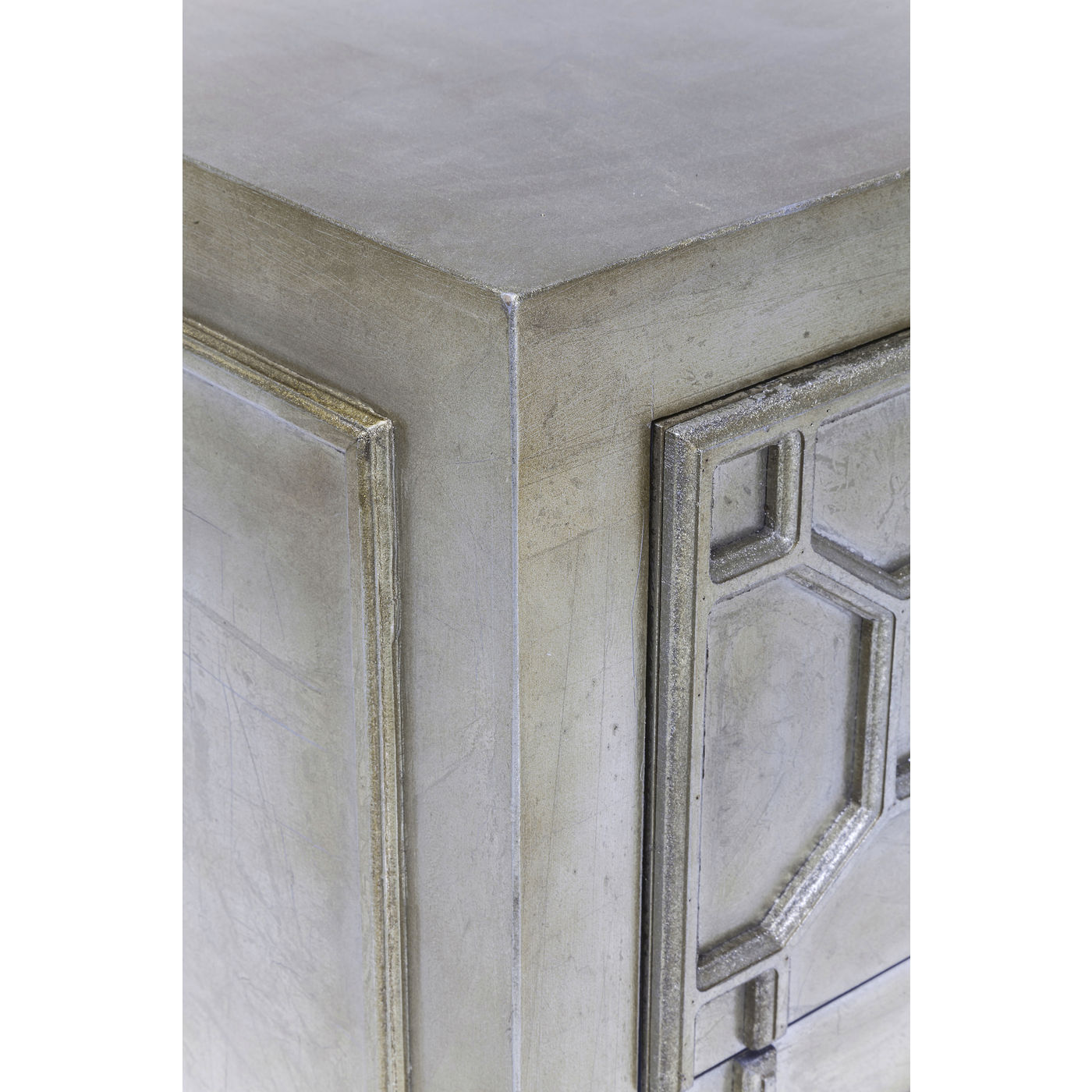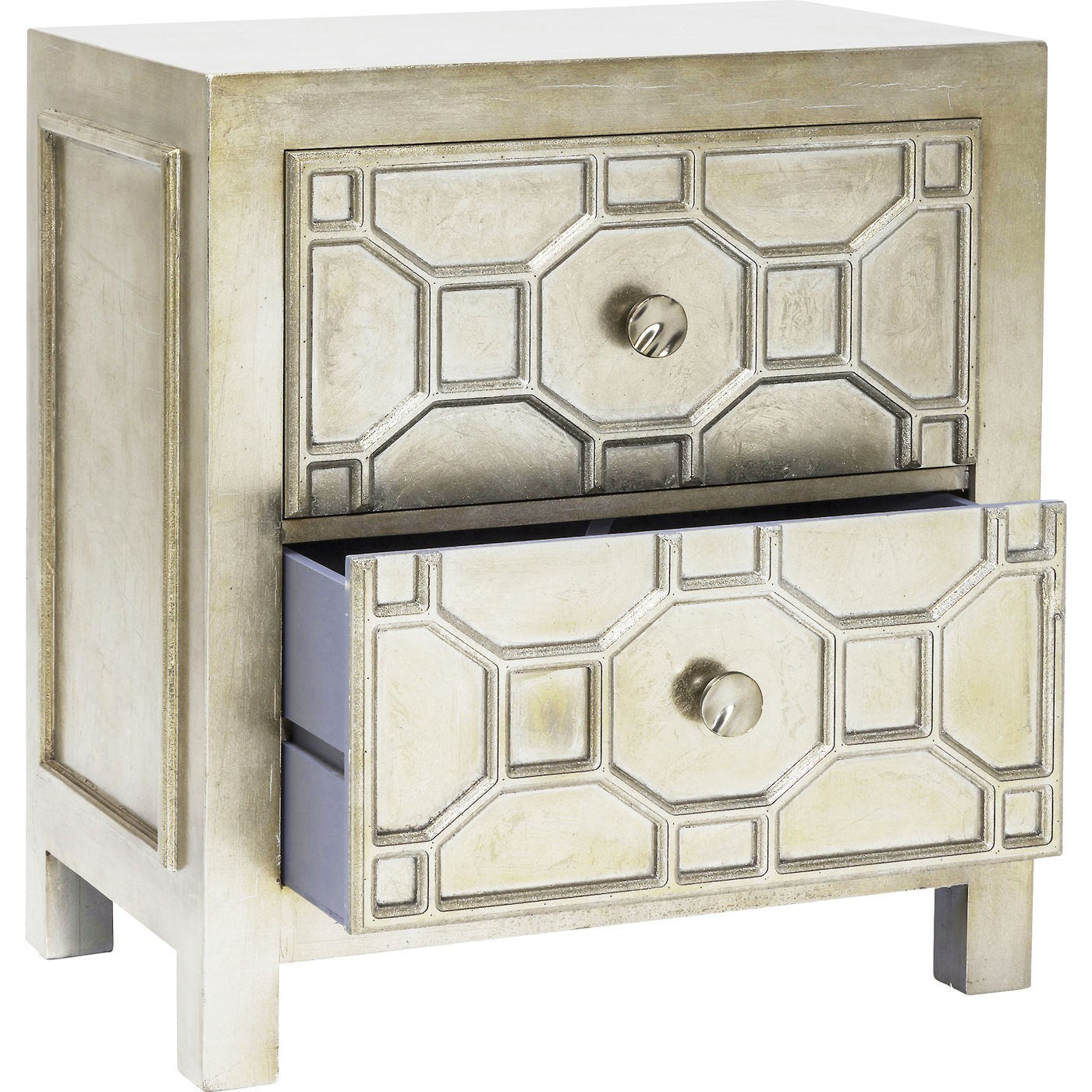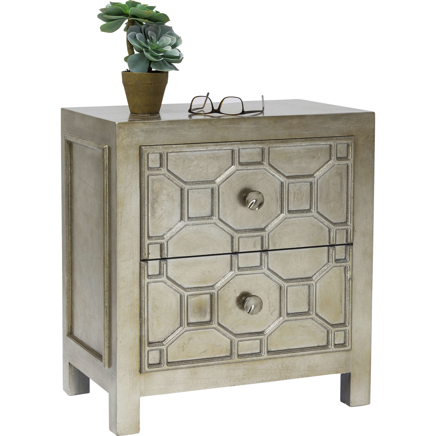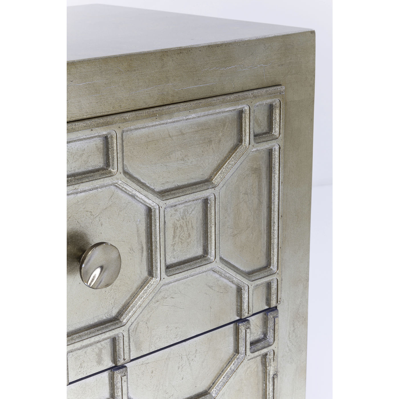 Homage to the ornament. This small chest of drawers from the Alhambra series fascinates with Moorish-inspired, sublime ornamentation on the front. The appearance is refined by a stylish matt silver finish. Two drawers.