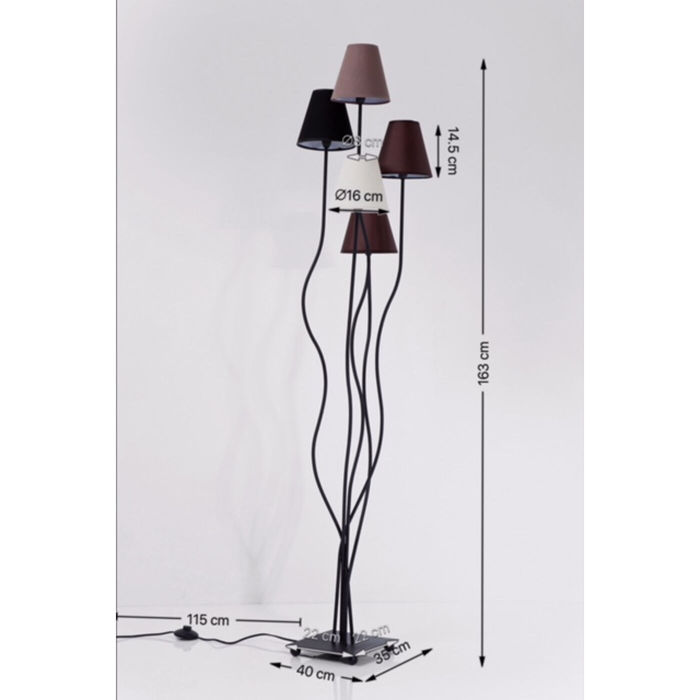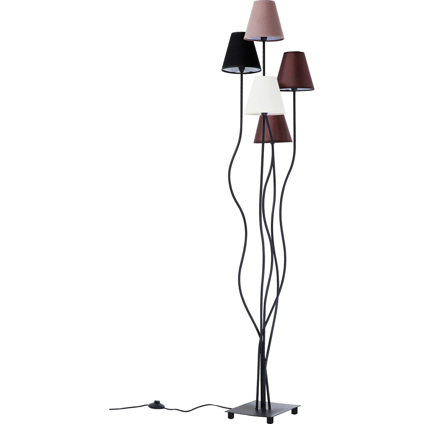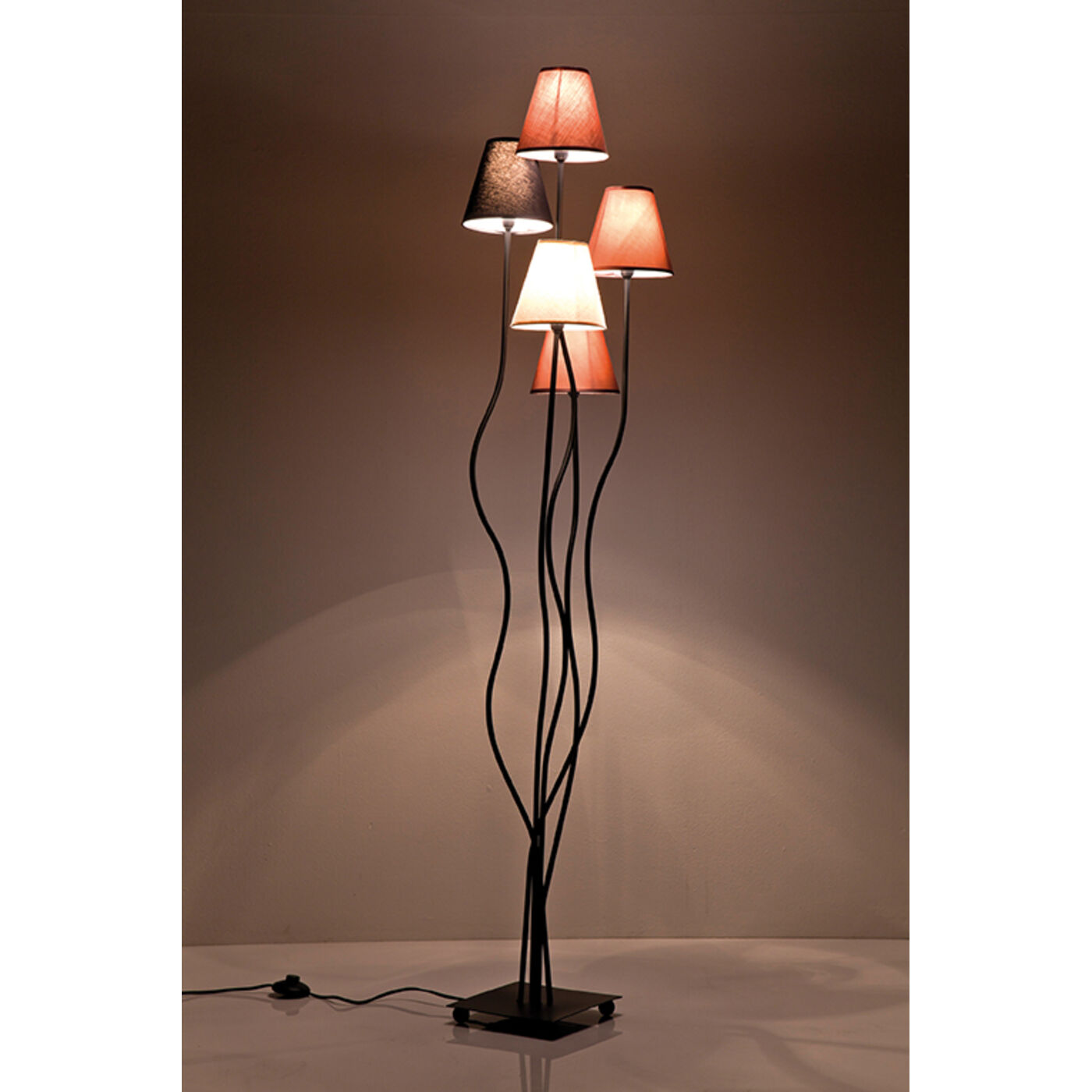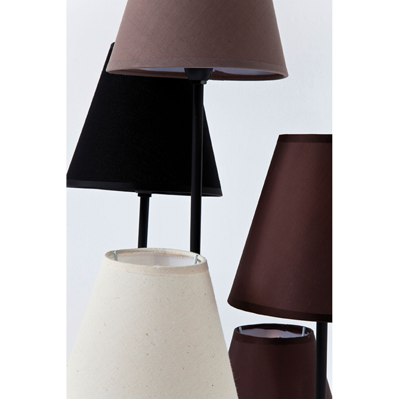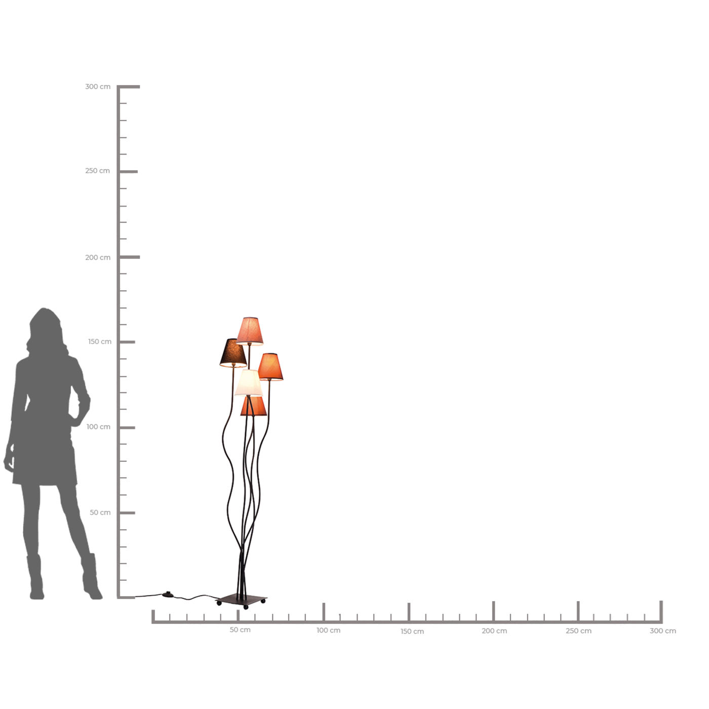 This creative standard lamp made of metal with its classy dimensions elegantly combines a range of furnishing styles. With five lampshades in natural colours, it creates an inviting atmosphere and radiates pleasant effects of light. Whether in an industrial, romantic or modern style, this floor-standing lamp will be an eye-catcher in any room. Its high-quality metal frame gives the timelessly beautiful lamp stability and ensures a long service life. 230 V, 50/60 Hz, bulb fitting E14, number of illuminant 5, max. 40 watt, without illuminant, replacable illuminant